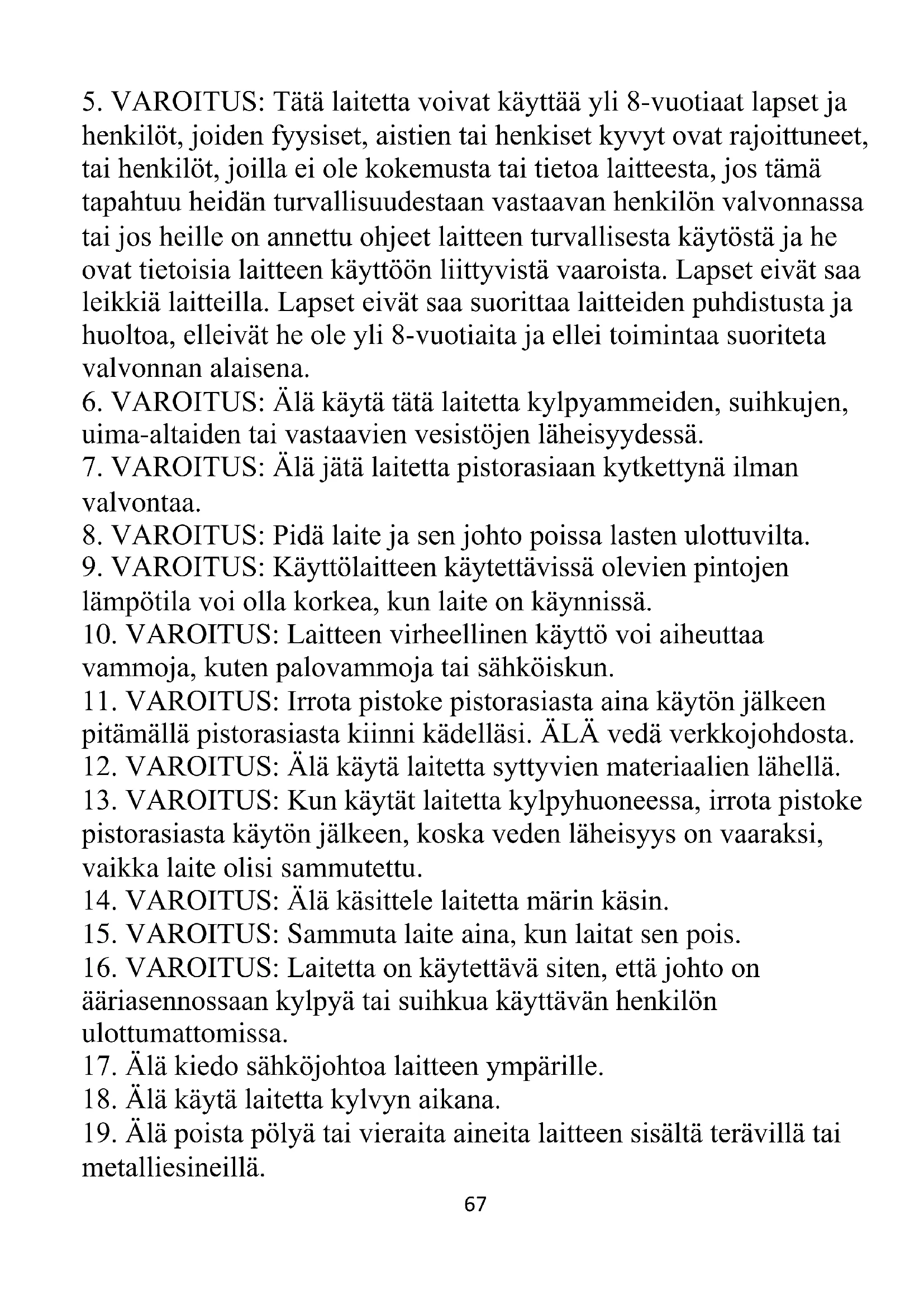 Älä anna lasten leikkiä laitteella älä anna lasten tai sellaisten henkilöiden, jotka eivät tunne laitetta, käyttää laitetta.67