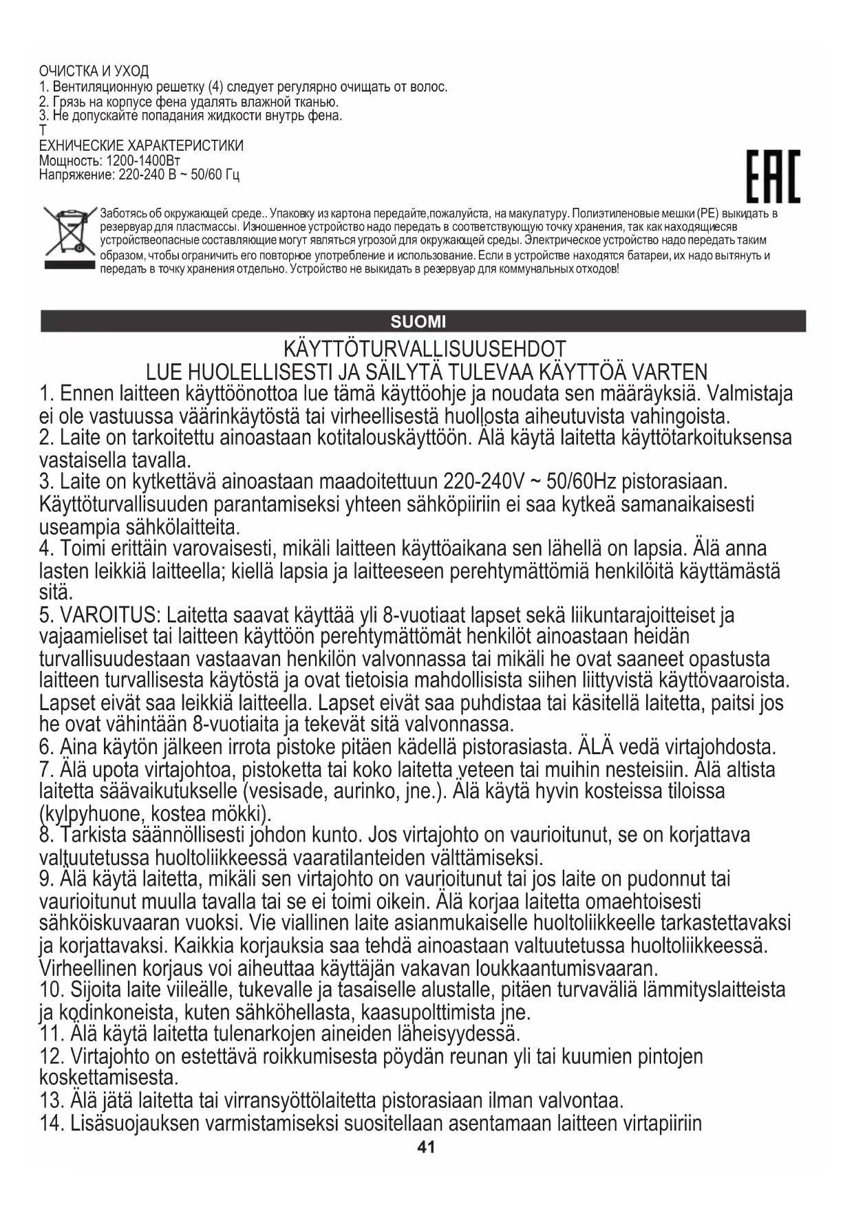 Teho: 1200-1400W TEKNISET TIEDOT Syöttövirran jännite 220-240V~50/60Hz 42Kantakaamme huolta ympäristöstä. Pahvipakkauksen pyydämme laittamaan paperikierrätykseen. Polyeteenipussit (PE) tulee laittaa muovien kierrätysastiaan. Loppuun käytetyt laitteet tulee toimittaa asianmukaiseen keräyspisteeseen, koska laitteen sisältämät vaaralliset aineosat voivat olla ympäristölle vahingollisia. Sähkölaite tulee toimittaa siten, että sen uudelleenkäyttö on estetty. Jos laitteessa on paristo, paristo tulee poistaa ja toimittaa erillisesti keräyspisteeseen.