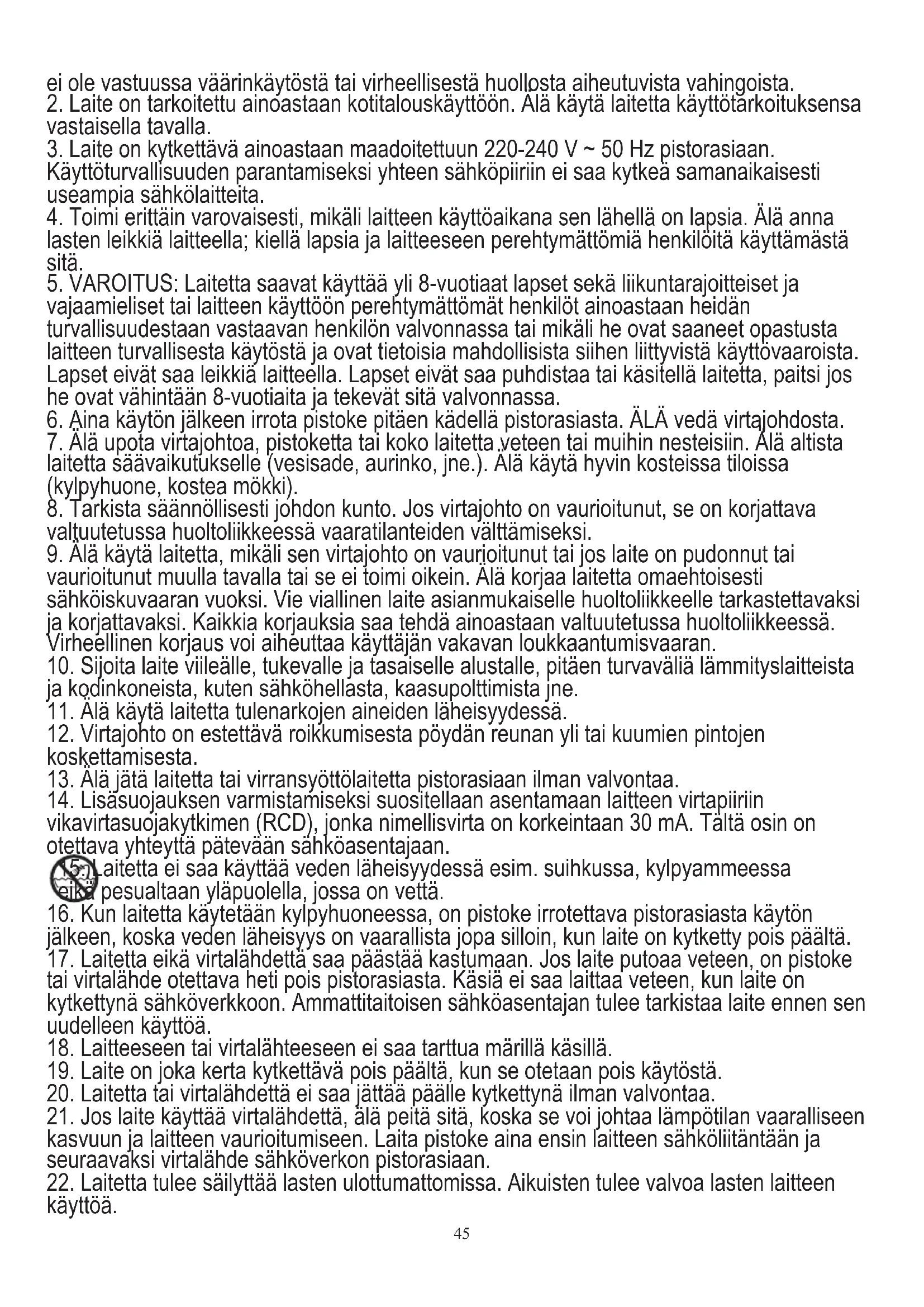 15. Laitetta ei saa käyttää veden läheisyydessä esim. suihkussa, kylpyammeessa