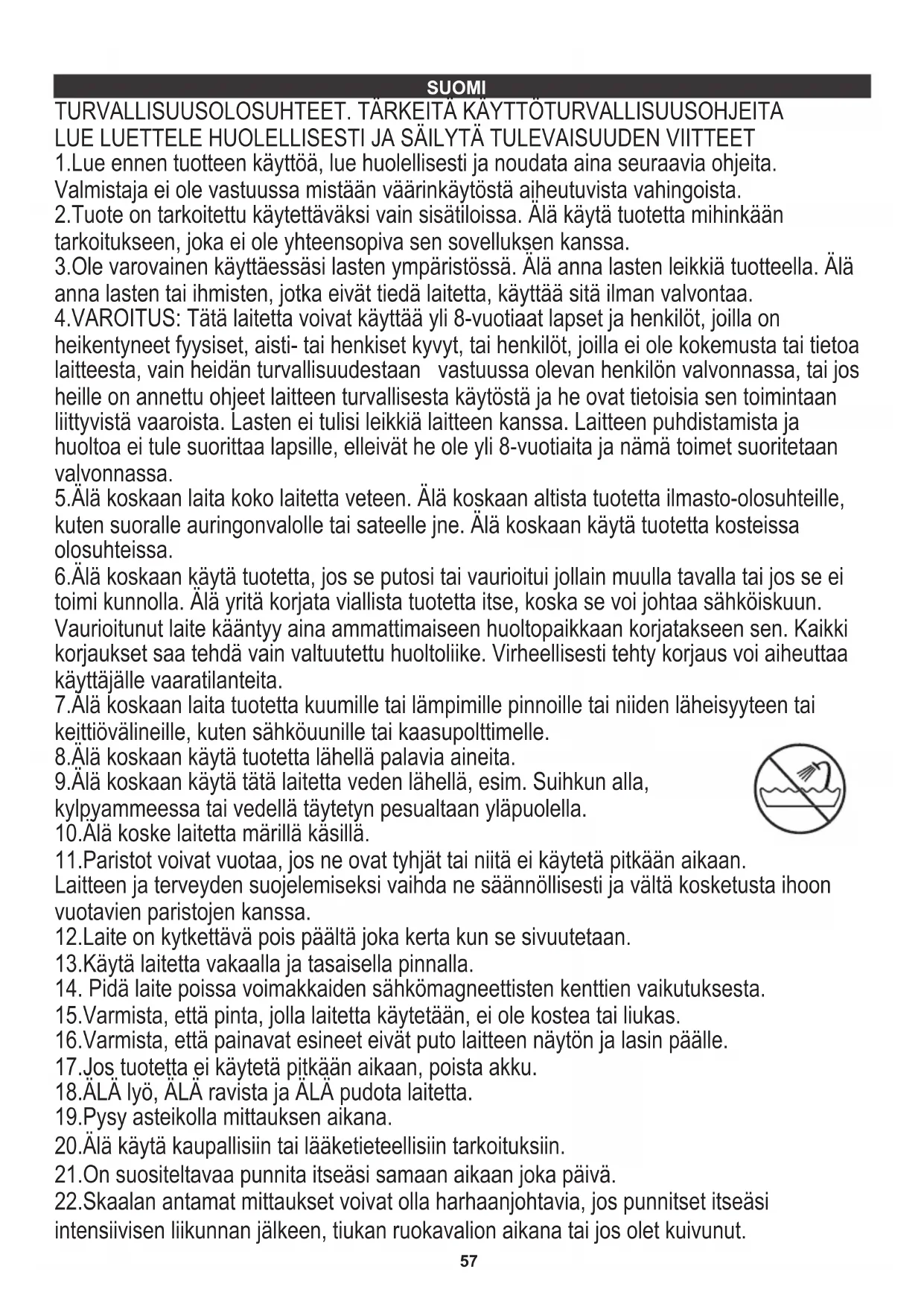 Snaga: 3x 1,5V LR03 (AAA) baterija NAPOMENA: programe možete izbrisati iz memorije ako su u sukobu. Dok vaga prikazuje programe koji se sukobljavaju, odaberite jedan od njih pritiskom na strelice (a ili b). Zatim držite tipku SET 3 sekunde. Zaslon će pokazati "dEL". Sljedeći put kad se skala uključi, profil će se izbrisati iz memorije. Nosivost: 225 kg 13) Pritisnite SET (c) za potvrdu vašeg izbora. Vaga će na ekranu pokazati "0,0" spremna za mjerenje težine. Vaši se osobni podaci spremaju u memoriju. 2) Pritisnite tipku SET (c). Pojavit će se memorijski broj i parametri zadnjeg korisnika. Ako želite promijeniti korisnika ili parametre, koristite gumbe (a) i (b) nakon što parametri trepere. Pričekajte dok se na zaslonu ne prikaže "0" i spreman je za vaganje. Dok ste programirali svoje osobne podatke u memoriju i odmjerili jedanput, vaga će vas prepoznati po vašoj težini. Otkrivat će sve profile unutar +/- 3 kilograma (6,6 lbs). Samo stojite na platformu bosim stopalom i pričekajte da vaga prepozna vašu težinu i usporedite ih s memoriranim programima. Vaša će se težina prikazivati dvije sekunde i tada će vaga započeti mjerenja sastava tijela. 3) Nežno zakoračite na platformu razmjera s bosim nogama. Obje noge trebaju dodirnuti mjerne ploče (1.3). Stavite ravnomjerno na vagu Pojavljuje se 0000. Nakon što učinite, vaga će pokazati rezultate sljedećim redoslijedom: očitanje BMI, tjelesna masnoća%, tjelesna voda%, mišićna masa%, bazalna stopa metabolizma (kcal), težina (kg, lb, st). Rezultati će se ponoviti 2 puta i tada se vaga automatski isključuje. Err - prekomjerno opterećenje razmjera Točnost: 100g Vodimo brigu o prirodnom okolišu. Kartonsku ambalažu molimo prenijeti na otpadni papir. Polietilen (PE) vreće bacati u kontejner za plastiku. Istrošena oprema treba biti premještena na prikladno mjesto za pohranu, jer sadrže u ureađju opasne tvari mogu predstavljati opasnost za okoliš. Električni uređaj mora biti predat u takvom stanju da se smanji mogučnost njegove ponovne upotrebe. Ako vaš uređaj ima baterije, treba njih ukloniti i predati na mjesto za pohranu odvojeno.57 13.Käytä laitetta vakaalla ja tasaisella pinnalla. 15.Varmista, että pinta, jolla laitetta käytetään, ei ole kostea tai liukas. 16.Varmista, että painavat esineet eivät puto laitteen näytön ja lasin päälle. 20.Älä käytä kaupallisiin tai lääketieteellisiin tarkoituksiin. 11.Paristot voivat vuotaa, jos ne ovat tyhjät tai niitä ei käytetä pitkään aikaan. kylpyammeessa tai vedellä täytetyn pesualtaan yläpuolella. 8.Älä koskaan käytä tuotetta lähellä palavia aineita. 2.Tuote on tarkoitettu käytettäväksi vain sisätiloissa. Älä käytä tuotetta mihinkään tarkoitukseen, joka ei ole yhteensopiva sen sovelluksen kanssa. 12.Laite on kytkettävä pois päältä joka kerta kun se sivuutetaan. 18.ÄLÄ lyö, ÄLÄ ravista ja ÄLÄ pudota laitetta. 4.VAROITUS: Tätä laitetta voivat käyttää yli 8-vuotiaat lapset ja henkilöt, joilla on heikentyneet fyysiset, aisti- tai henkiset kyvyt, tai henkilöt, joilla ei ole kokemusta tai tietoa laitteesta, vain heidän turvallisuudestaan vastuussa olevan henkilön valvonnassa, tai jos heille on annettu ohjeet laitteen turvallisesta käytöstä ja he ovat tietoisia sen toimintaan liittyvistä vaaroista. Lasten ei tulisi leikkiä laitteen kanssa. Laitteen puhdistamista ja huoltoa ei tule suorittaa lapsille, elleivät he ole yli 8-vuotiaita ja nämä toimet suoritetaan valvonnassa. 19.Pysy asteikolla mittauksen aikana. 21.On suositeltavaa punnita itseäsi samaan aikaan joka päivä. 22.Skaalan antamat mittaukset voivat olla harhaanjohtavia, jos punnitset itseäsi intensiivisen liikunnan jälkeen, tiukan ruokavalion aikana tai jos olet kuivunut. 6.Älä koskaan käytä tuotetta, jos se putosi tai vaurioitui jollain muulla tavalla tai jos se ei toimi kunnolla. Älä yritä korjata viallista tuotetta itse, koska se voi johtaa sähköiskuun. Vaurioitunut laite kääntyy aina ammattimaiseen huoltopaikkaan korjatakseen sen. Kaikki korjaukset saa tehdä vain valtuutettu huoltoliike. Virheellisesti tehty korjaus voi aiheuttaa käyttäjälle vaaratilanteita. 17.Jos tuotetta ei käytetä pitkään aikaan, poista akku. 3.Ole varovainen käyttäessäsi lasten ympäristössä. Älä anna lasten leikkiä tuotteella. Älä anna lasten tai ihmisten, jotka eivät tiedä laitetta, käyttää sitä ilman valvontaa. LUE LUETTELE HUOLELLISESTI JA SÄILYTÄ TULEVAISUUDEN VIITTEET 1.Lue ennen tuotteen käyttöä, lue huolellisesti ja noudata aina seuraavia ohjeita. Valmistaja ei ole vastuussa mistään väärinkäytöstä aiheutuvista vahingoista. 7.Älä koskaan laita tuotetta kuumille tai lämpimille pinnoille tai niiden läheisyyteen tai keittiövälineille, kuten sähköuunille tai kaasupolttimelle. 9.Älä koskaan käytä tätä laitetta veden lähellä, esim. Suihkun alla, 5.Älä koskaan laita koko laitetta veteen. Älä koskaan altista tuotetta ilmasto-olosuhteille, kuten suoralle auringonvalolle tai sateelle jne. Älä koskaan käytä tuotetta kosteissa olosuhteissa. 10.Älä koske laitetta märillä käsillä.