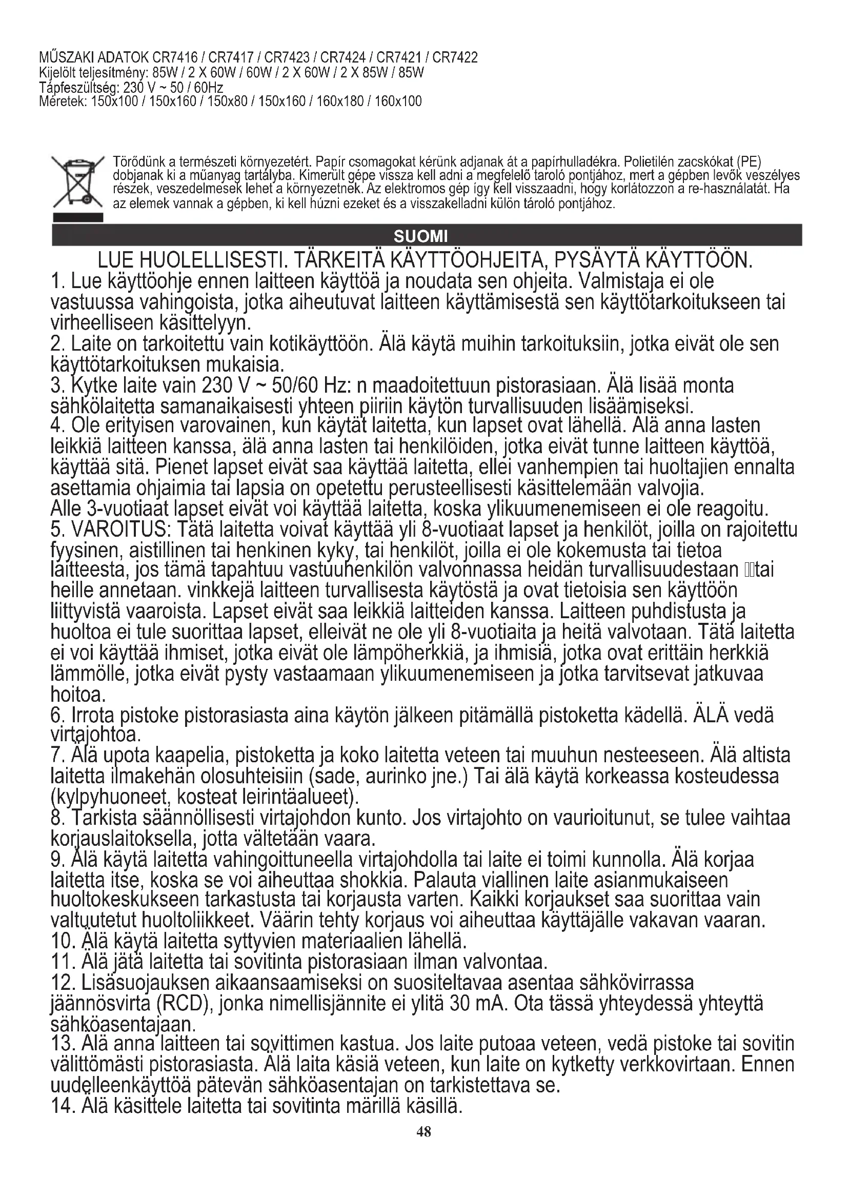 sitä käytetään laitteen käyttötarkoituksen mukaisesti. Jos sulake laukeaa, laite lakkaa toimimasta, laite on palautettava valmistajalle tai sen edustajalle korjausta varten. Tuote: Sähköinen peitekerros CR7416 / CR7417 / CR7423 / CR7424 / CR7421 / CR7422
