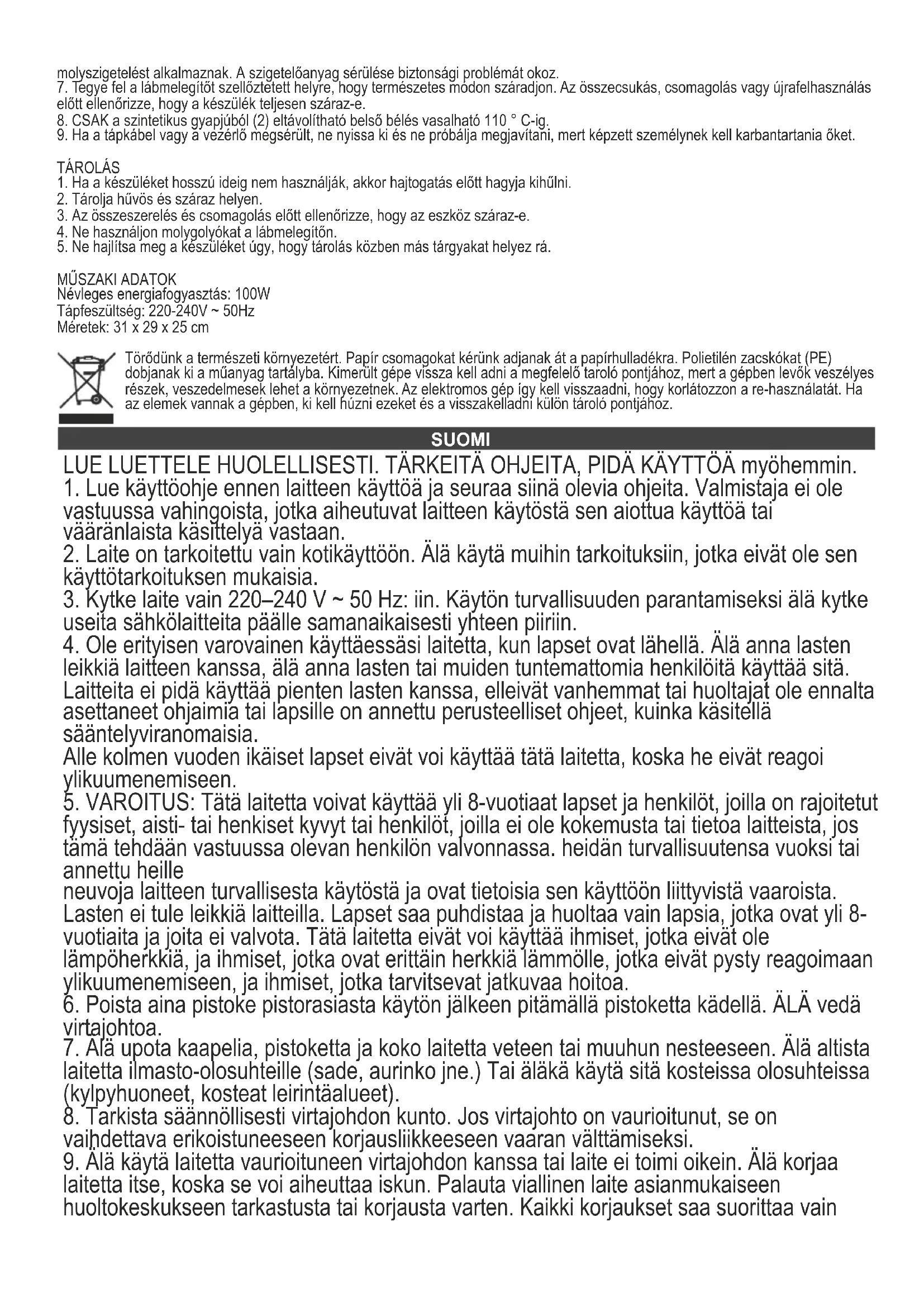 TEKNISET TIEDOT Nimellinen virrankulutus: 100 W Syöttöjännite: 220-240V ~ 50Hz Mitat 31 x 29 x 25 cm NEDERLANDS Kantakaamme huolta ympäristöstä. Pahvipakkauksen pyydämme laittamaan paperikierrätykseen. Polyeteenipussit (PE) tulee laittaa muovien kierrätysastiaan. Loppuun käytetyt laitteet tulee toimittaa asianmukaiseen keräyspisteeseen, koska laitteen sisältämät vaaralliset aineosat voivat olla ympäristölle vahingollisia. Sähkölaite tulee toimittaa siten, että sen uudelleenkäyttö on estetty. Jos laitteessa on paristo, paristo tulee poistaa ja toimittaa erillisesti keräyspisteeseen. LEES DIT ZORGVULDIG DOOR. BELANGRIJKE INSTRUCTIES, BEWAREN VOOR LATER GEBRUIK.