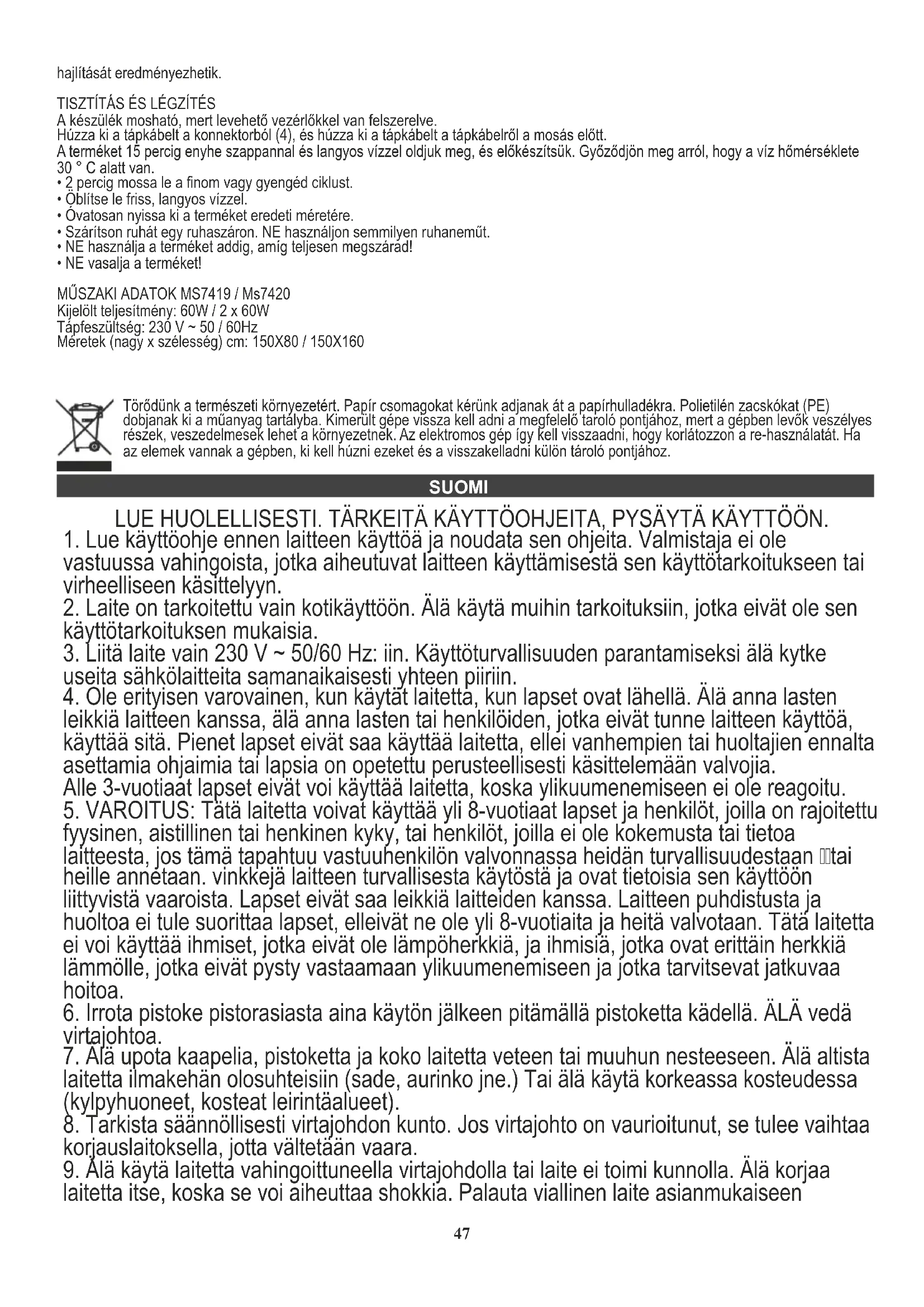 - ÄLÄ silitä tuotetta! TEKNISET TIEDOT MS7419 / Ms7420 Nimetty teho: 60W / 2 x 60W Tulojännite: 230 V ~ 50 / 60Hz Mitat (korkea x leveys) cm: 150X80 / 150X160 NEDERLANDS Kantakaamme huolta ympäristöstä. Pahvipakkauksen pyydämme laittamaan paperikierrätykseen. Polyeteenipussit (PE) tulee laittaa muovien kierrätysastiaan. Loppuun käytetyt laitteet tulee toimittaa asianmukaiseen keräyspisteeseen, koska laitteen sisältämät vaaralliset aineosat voivat olla ympäristölle vahingollisia. Sähkölaite tulee toimittaa siten, että sen uudelleenkäyttö on estetty. Jos laitteessa on paristo, paristo tulee poistaa ja toimittaa erillisesti keräyspisteeseen. LEES ZORGVULDIG DOOR. BELANGRIJKE INSTRUCTIES, BLIJF VOOR LATER GEBRUIK.