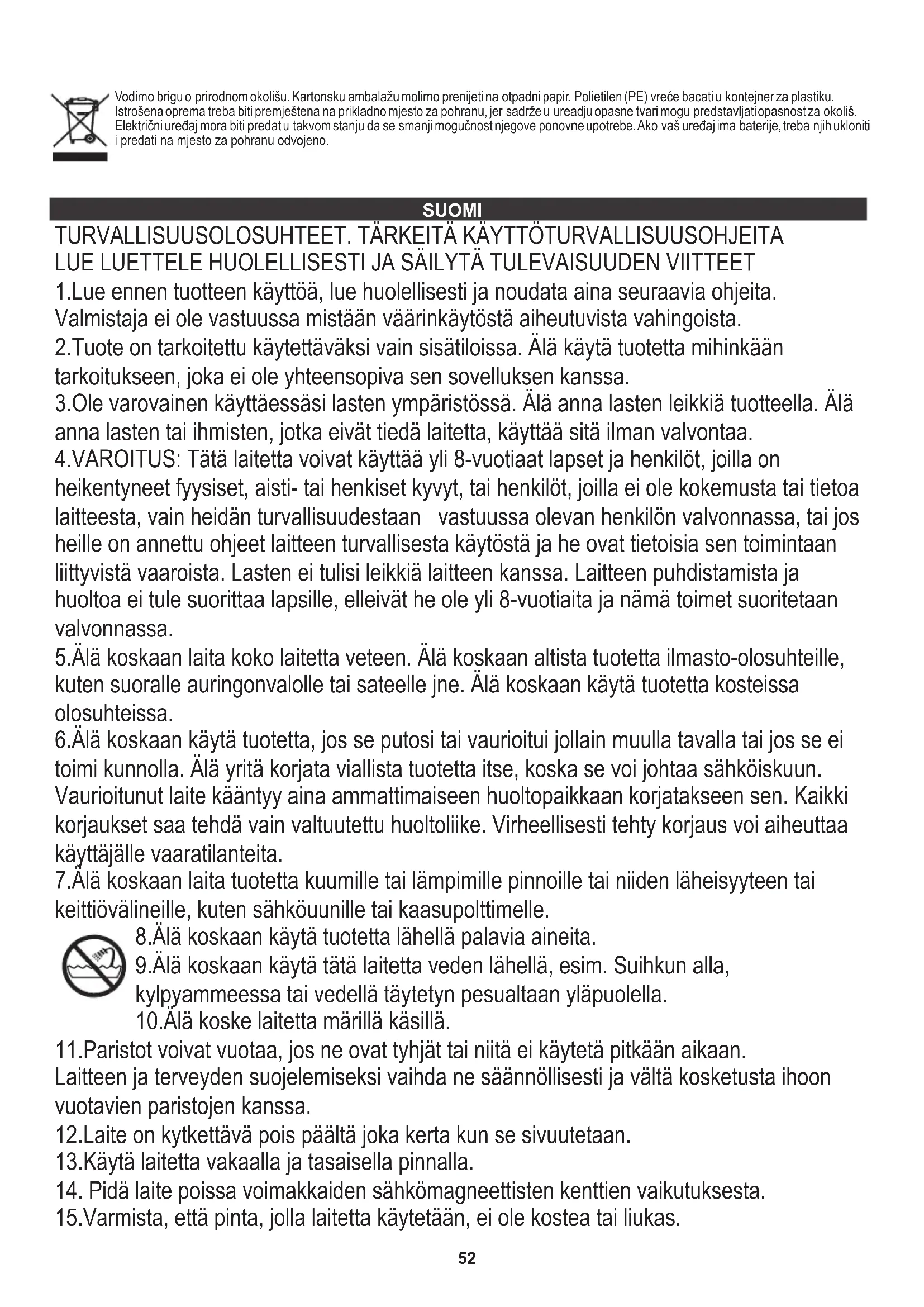 Snaga: 1x V3 CR2032 baterija52 15.Varmista, että pinta, jolla laitetta käytetään, ei ole kostea tai liukas. 5.Älä koskaan laita koko laitetta veteen. Älä koskaan altista tuotetta ilmasto-olosuhteille, kuten suoralle auringonvalolle tai sateelle jne. Älä koskaan käytä tuotetta kosteissa olosuhteissa. 4.VAROITUS: Tätä laitetta voivat käyttää yli 8-vuotiaat lapset ja henkilöt, joilla on heikentyneet fyysiset, aisti- tai henkiset kyvyt, tai henkilöt, joilla ei ole kokemusta tai tietoa laitteesta, vain heidän turvallisuudestaan vastuussa olevan henkilön valvonnassa, tai jos heille on annettu ohjeet laitteen turvallisesta käytöstä ja he ovat tietoisia sen toimintaan liittyvistä vaaroista. Lasten ei tulisi leikkiä laitteen kanssa. Laitteen puhdistamista ja huoltoa ei tule suorittaa lapsille, elleivät he ole yli 8-vuotiaita ja nämä toimet suoritetaan valvonnassa. 8.Älä koskaan käytä tuotetta lähellä palavia aineita.