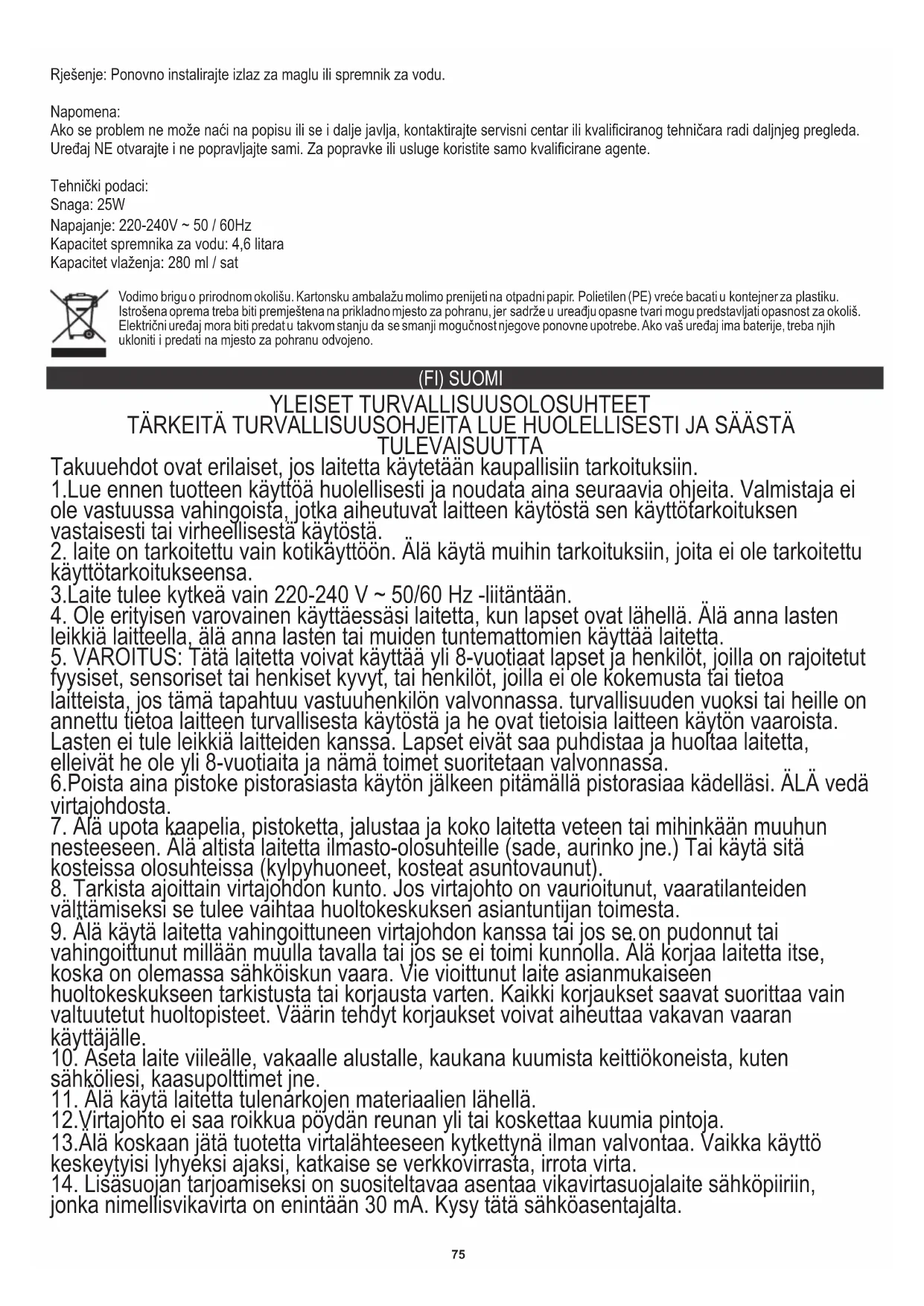 ONGELMIEN KARTTOITTAMINEN Jos normaalissa käytössä ilmenee ongelmia, tutustu seuraaviin kohtiin; Ongelma nro 1: Laitteisto ei toimi. Mahdollinen syy: Ei virtalähdettä. Ratkaisu: Liitä virtalähde, kytke laitteeseen virta. Ongelma nro 2: Laitteisto ei toimi. Mahdollinen syy: Ei vettä vesisäiliössä. Ratkaisu: Jos lämpötilaero sisä- ja ulkotiloissa on liian suuri, laite ei voi toimia normaalisti. On suositeltavaa täyttää vesisäiliö ja odottaa 10 minuuttia, jotta laite toimii uudelleen. Jos sisä- ja ulkolämpötilaero ei ole suuri, sitä ei tarvitse käsitellä tällä tavalla. Laite voidaan täyttää suoraan vedellä ja kytkeä virta päälle. Vika 3: Sumua ei synny. Mahdollinen syy: Valittu kosteustaso on saavutettu. Ratkaisu: Deaktivoi tai aseta vaadittu kosteustaso uudelleen. Ongelma nro 4: Sumua ei synny. Mahdollinen syy: Viallinen laite. Ratkaisu: Ota yhteyttä tekniseen palveluun. Ongelma nro 5: Sumu, jolla on outo haju. Mahdollinen syy: Uusi laite. Ratkaisu: Haju häviää muutaman ensimmäisen käyttötunnin jälkeen. Ongelma nro 6: Sumu, jolla on outo haju. Mahdollinen syy: Likainen vesi tai pitkään varastoitu vesi. Ratkaisu: Puhdista vesisäiliö, täytä se puhtaalla vedellä. Ongelma nro 7: Sumua liian vähän Mahdollinen syy: Liian paljon likaa vesialtaassa. Ratkaisu: Puhdista sumuttimen pinta (9). Ongelma nro 8: Sumua liian vähän Mahdollinen syy: Vesi on liian likaa tai vettä pidetään liian kauan säiliössä. Ratkaisu: Puhdista vesisäiliö, täytä se puhtaalla vedellä. Vika nro 9: sumun määrä liian pieni Mahdollinen syy: Matala kostutustaso. Ratkaisu: Vaihda kostutustaso. Vika nro 10: Epänormaali melu. Mahdollinen syy: Ei tarpeeksi vettä. Ratkaisu: Täytä vedellä. Vika nro 11: Epänormaali melu. Mahdollinen syy: Laite on kallistettu tai epätasaisella alustalla. Ratkaisu: Aseta laite tasaiselle, vakaalle pinnalle. Ongelma nro 12: Suihkua ympäröivältä alueelta tulee suihkusumua. Mahdollinen syy: Sumuulostulo tai vesisäiliö väärin. Ratkaisu: Asenna sumun poistoaukko tai vesisäiliö uudelleen. Huomautus: Jos ongelmaa ei löydy luettelosta tai se jatkuu, ota yhteyttä huoltokeskukseen tai pätevään teknikkoon lisätarkastusta varten. ÄLÄ avaa ja korjaa laitetta itse. Käytä korjaukseen tai huoltoon vain päteviä edustajia. Tekniset tiedot: Teho: 25W Virtalähde: 220-240V ~ 50 / 60Hz Vesisäiliön tilavuus: 4,6 litraa Kostutuskapasiteetti: 280 ml / tunti Kantakaamme huolta ympäristöstä. Pahvipakkauksen pyydämme laittamaan paperikierrätykseen. Polyeteenipussit (PE) tulee laittaa muovien kierrätysastiaan. Loppuun käytetyt laitteet tulee toimittaa asianmukaiseen keräyspisteeseen, koska laitteen sisältämät vaaralliset aineosat voivat olla ympäristölle vahingollisia. Sähkölaite tulee toimittaa siten, että sen uudelleenkäyttö on estetty. Jos laitteessa on paristo, paristo tulee poistaa ja toimittaa erillisesti keräyspisteeseen. (SV) SVENSKA