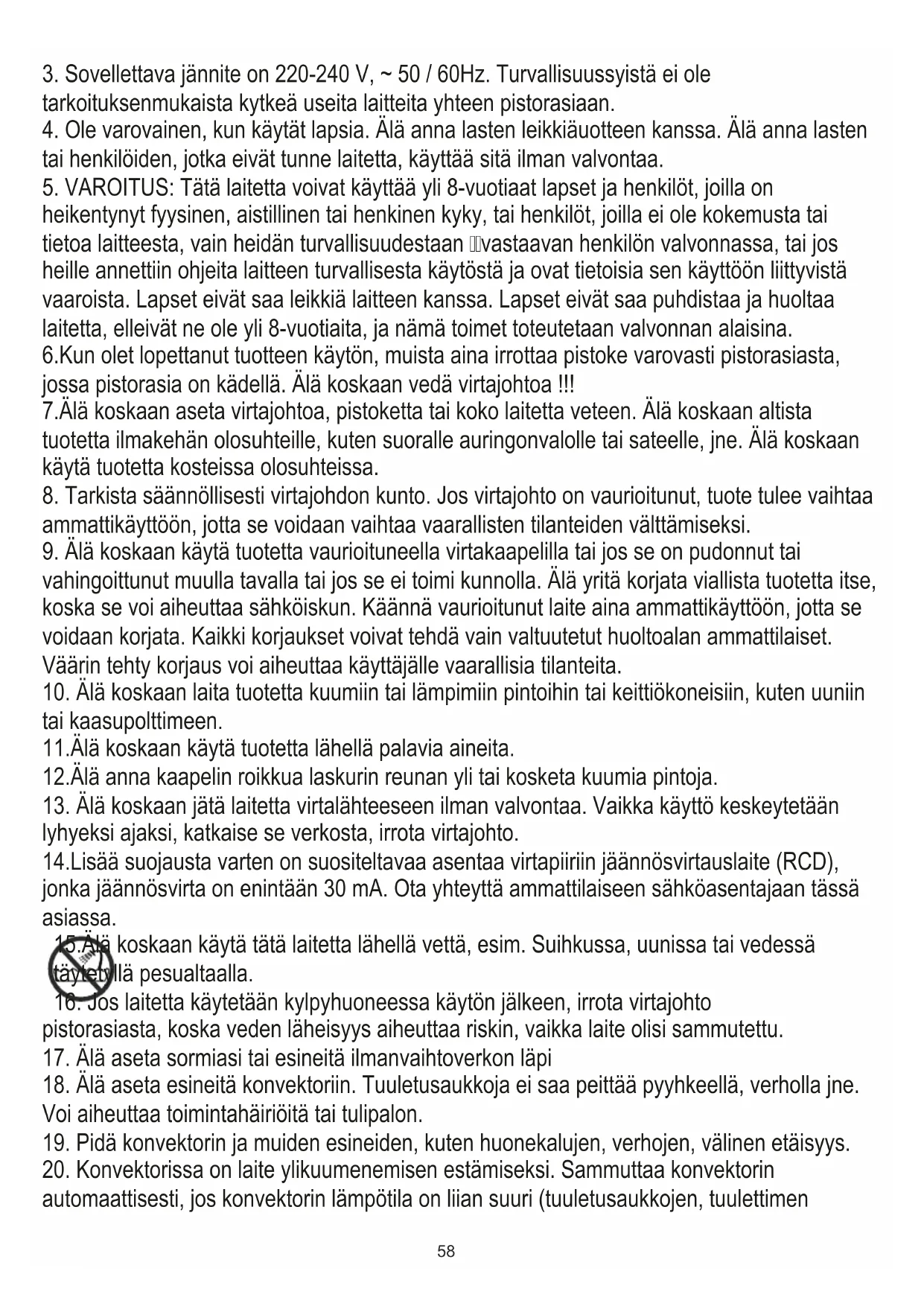 heikentynyt fyysinen, aistillinen tai henkinen kyky, tai henkilöt, joilla ei ole kokemusta tai tietoa laitteesta, vain heidän turvallisuudestaan vastaavan henkilön valvonnassa, tai jos heille annettiin ohjeita laitteen turvallisesta käytöstä ja ovat tietoisia sen käyttöön liittyvistä vaaroista. Lapset eivät saa leikkiä laitteen kanssa. Lapset eivät saa puhdistaa ja huoltaa laitetta, elleivät ne ole yli 8-vuotiaita, ja nämä toimet toteutetaan valvonnan alaisina. 6.Kun olet lopettanut tuotteen käytön, muista aina irrottaa pistoke varovasti pistorasiasta, jossa pistorasia on kädellä. Älä koskaan vedä virtajohtoa !!! 7.Älä koskaan aseta virtajohtoa, pistoketta tai koko laitetta veteen. Älä koskaan altista tuotetta ilmakehän olosuhteille, kuten suoralle auringonvalolle tai sateelle, jne. Älä koskaan käytä tuotetta kosteissa olosuhteissa.