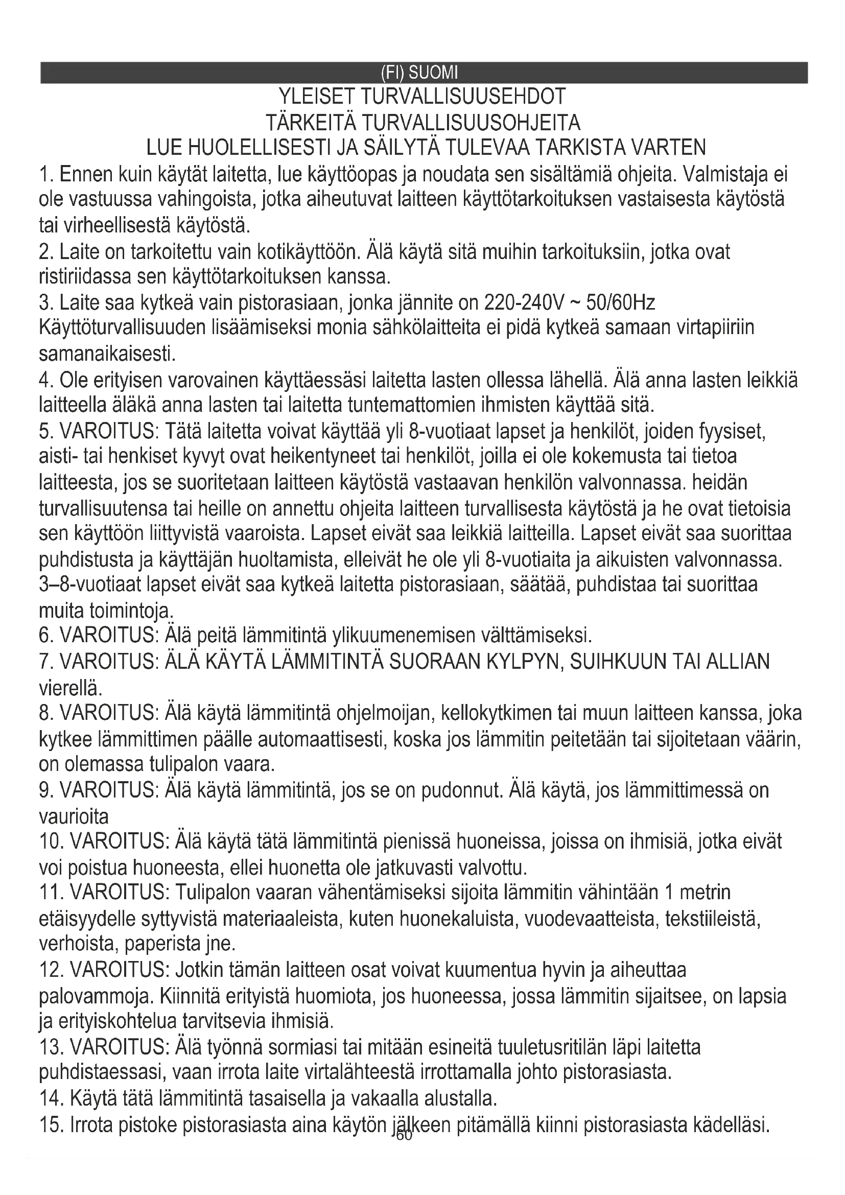 3. Laite saa kytkeä vain pistorasiaan, jonka jännite on 220-240V ~ 50/60Hz