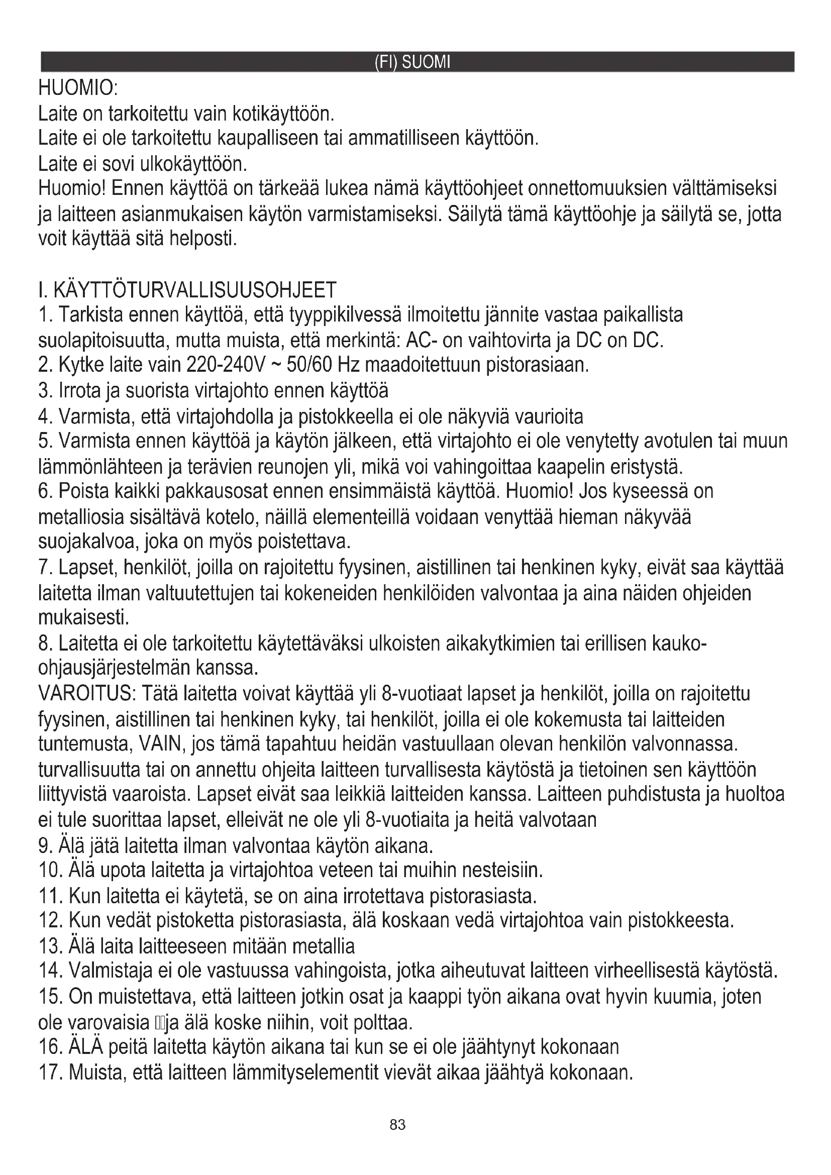 11. Kun laitetta ei käytetä, se on aina irrotettava pistorasiasta.