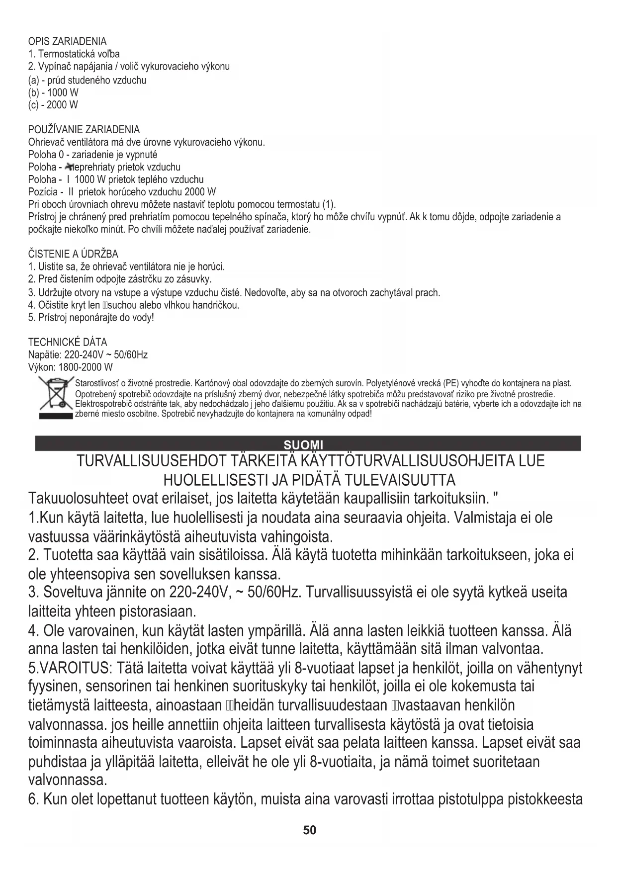 Starostlivosť o životné prostredie. Kartónový obal odovzdajte do zberných surovín. Polyetylénové vrecká (PE) vyhoďte do kontajnera na plast. Opotrebený spotrebič odovzdajte na príslušný zberný dvor, nebezpečné látky spotrebiča môžu predstavovať riziko pre životné prostredie. Elektrospotrebič odstráňte tak, aby nedochádzalo j jeho ďalšiemu použitiu. Ak sa v spotrebiči nachádzajú batérie, vyberte ich a odovzdajte ich na zberné miesto osobitne. Spotrebič nevyhadzujte do kontajnera na komunálny odpad! SUOMI 5.VAROITUS: Tätä laitetta voivat käyttää yli 8-vuotiaat lapset ja henkilöt, joilla on vähentynyt fyysinen, sensorinen tai henkinen suorituskyky tai henkilöt, joilla ei ole kokemusta tai tietämystä laitteesta, ainoastaan heidän turvallisuudestaan vastaavan henkilön valvonnassa. jos heille annettiin ohjeita laitteen turvallisesta käytöstä ja ovat tietoisia toiminnasta aiheutuvista vaaroista. Lapset eivät saa pelata laitteen kanssa. Lapset eivät saa puhdistaa ja ylläpitää laitetta, elleivät he ole yli 8-vuotiaita, ja nämä toimet suoritetaan valvonnassa.