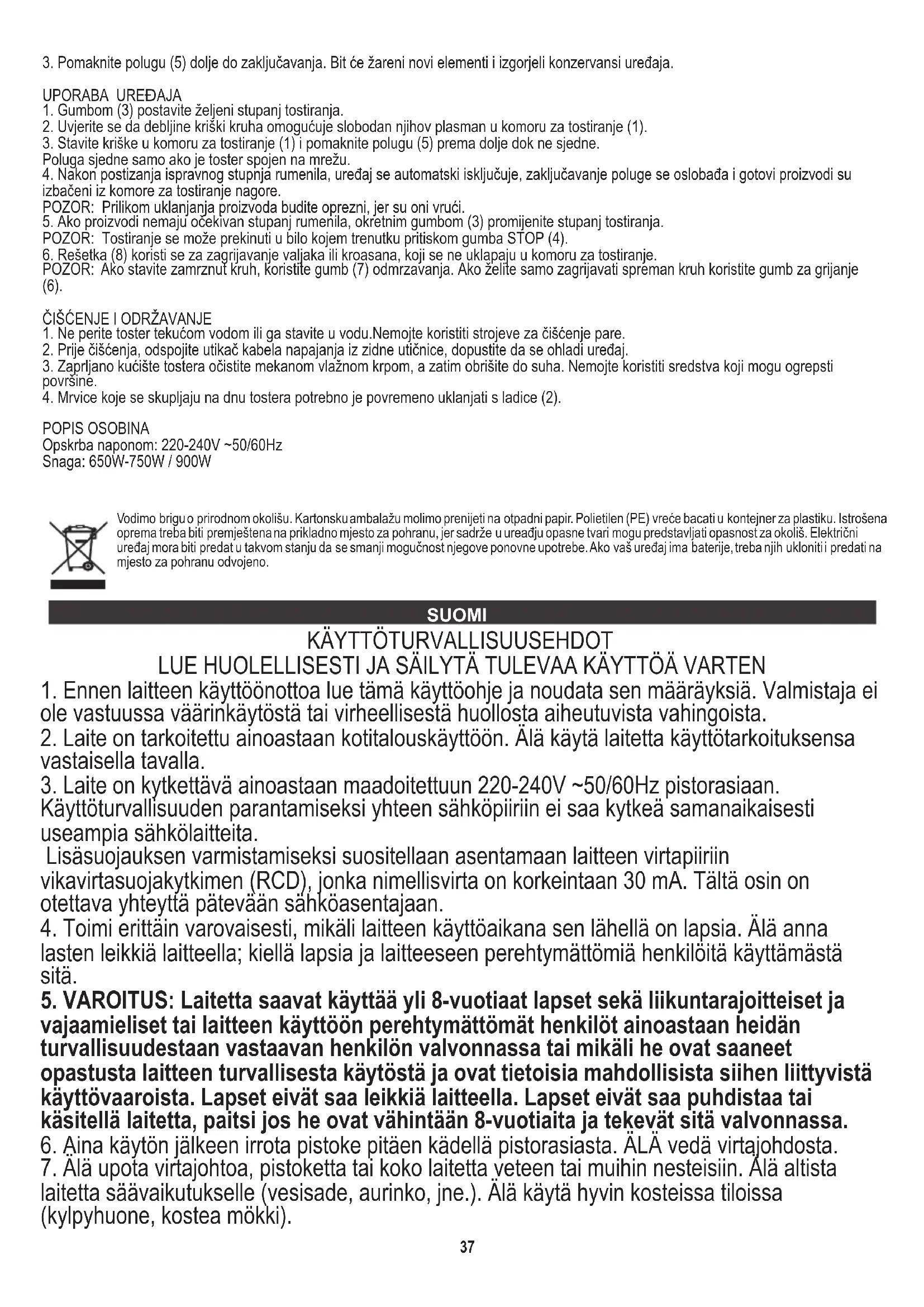 4. Kun oikea ruskistusaste on saavutettu, laite kytkeytyy automaattisesti pois päältä, vivun lukitus vapautuu ja valmiit tuotteet nousevat ylös paahtotilasta. HUOMIO: Tuotteiden pois ottamisessa tulee noudattaa varovaisuutta, koska ne ovat kuumia. HUOMIO: Paahto voidaan keskeyttää milloin tahansa STOP-painiketta (4) painamalla. Teho: 650W-750W / 900W Syöttövirran jännite: 220-240V ~50/60Hz TEKNISET TIEDOT Kantakaamme huolta ympäristöstä. Pahvipakkauksen pyydämme laittamaan paperikierrätykseen. Polyeteenipussit (PE) tulee laittaa muovien kierrätysastiaan. Loppuun käytetyt laitteet tulee toimittaa asianmukaiseen keräyspisteeseen, koska laitteen sisältämät vaaralliset aineosat voivat olla ympäristölle vahingollisia. Sähkölaite tulee toimittaa siten, että sen uudelleenkäyttö on estetty. Jos laitteessa on paristo, paristo tulee poistaa ja toimittaa erillisesti keräyspisteeseen.