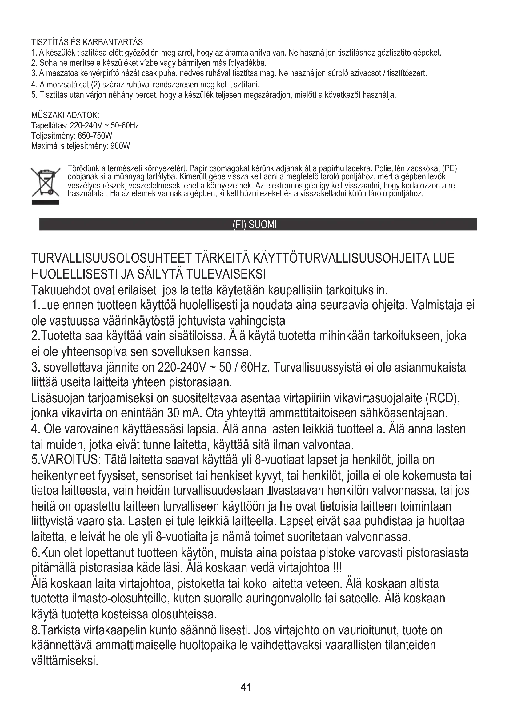1. Varmista ennen laitteen puhdistamista, että se on irrotettu pistorasiasta. Älä käytä puhdistukseen höyrypuhdistuskoneita. Suurin teho: 900 W TEKNISET TIEDOT: Teho: 650-750W Virtalähde: 220-240V ~ 50-60Hz Kantakaamme huolta ympäristöstä. Pahvipakkauksen pyydämme laittamaan paperikierrätykseen. Polyeteenipussit (PE) tulee laittaa muovien kierrätysastiaan. Loppuun käytetyt laitteet tulee toimittaa asianmukaiseen keräyspisteeseen, koska laitteen sisältämät vaaralliset aineosat voivat olla ympäristölle vahingollisia. Sähkölaite tulee toimittaa siten, että sen uudelleenkäyttö on estetty. Jos laitteessa on paristo, paristo tulee poistaa ja toimittaa erillisesti keräyspisteeseen.