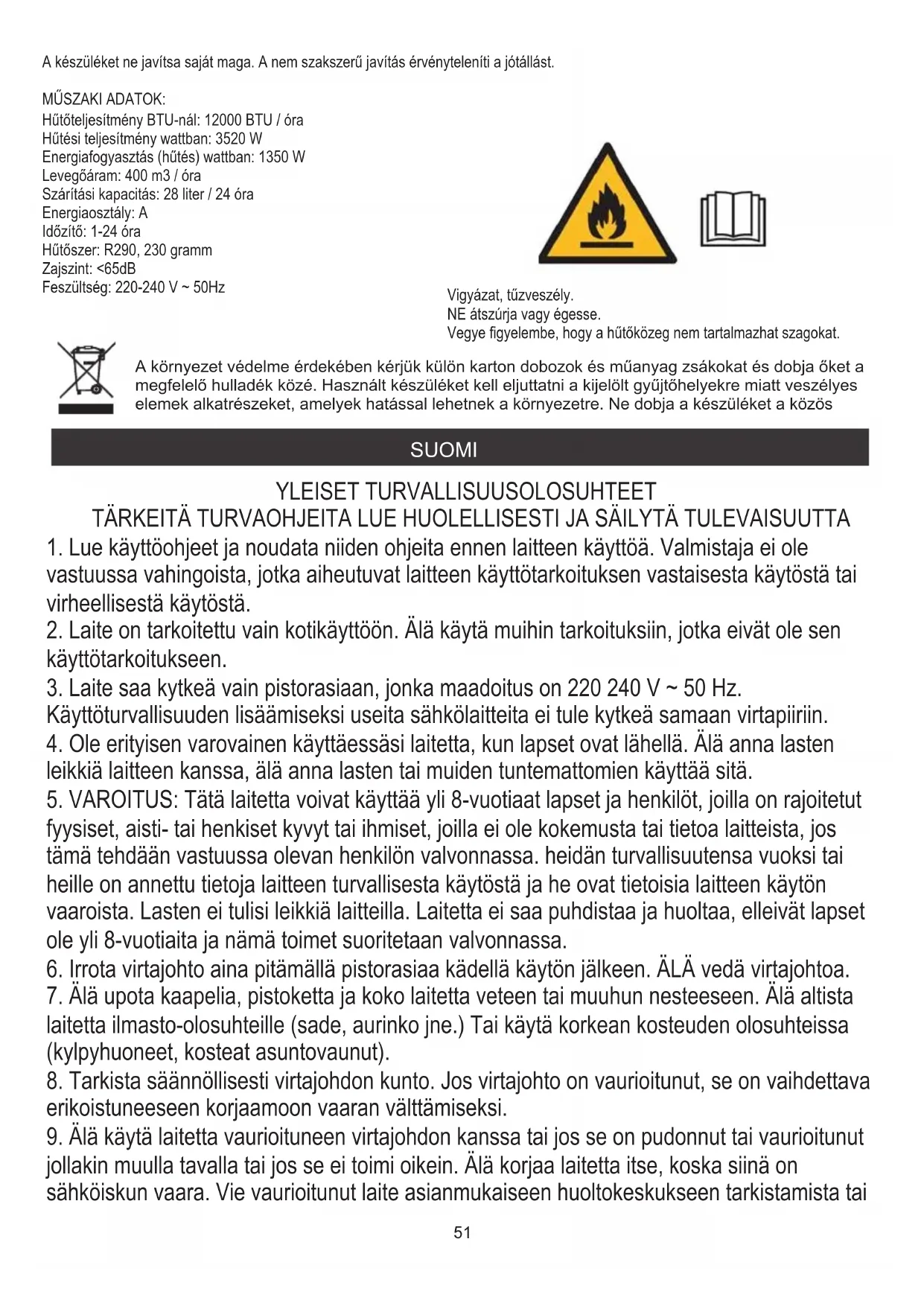 Käyttöturvallisuuden lisäämiseksi useita sähkölaitteita ei tule kytkeä samaan virtapiiriin. 51korjaamista varten. Kaikki korjaukset saa suorittaa vain valtuutetut huoltoliikkeet. Väärin suoritetut korjaukset voivat aiheuttaa vakavan vaaran käyttäjälle.