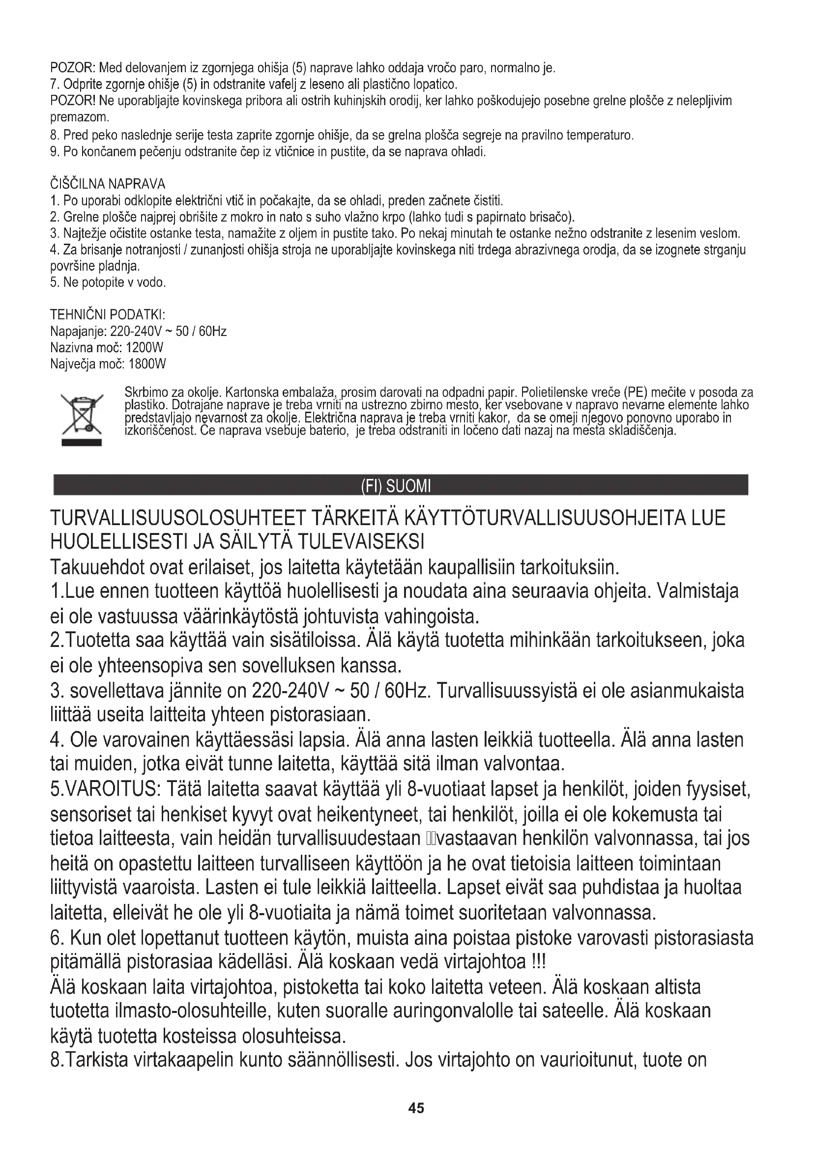 Virtalähde: 220-240V ~ 50 / 60Hz Suurin teho: 1800 W HUOMIO! Älä käytä metallisia astioita tai teräviä keittiövälineitä, koska ne voivat vahingoittaa tarttumattomia pinnoitteita.