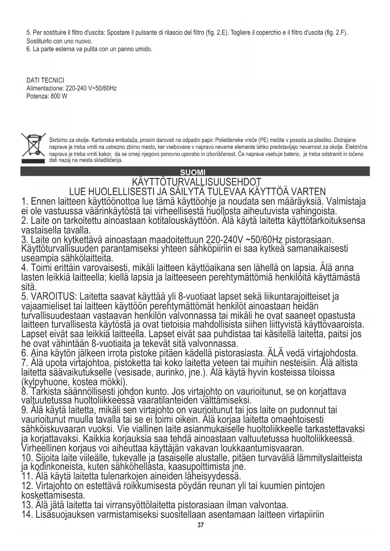 23. Älä tuki mitään ilmanvaihtoaukkoja.Suojellaksesi ympräristöäsi: hävitä pahvilaatikot ja muovipussit ja kierrätä ne niille tarkoitetuissa jäteastioissa. Käytetyt koneet tulee toimittaa niihin erioistuneisiin keräyspisteisiin ympäristölle vaarallisten aineiden takia. Älä hävitä laitteita sekajätteessä.