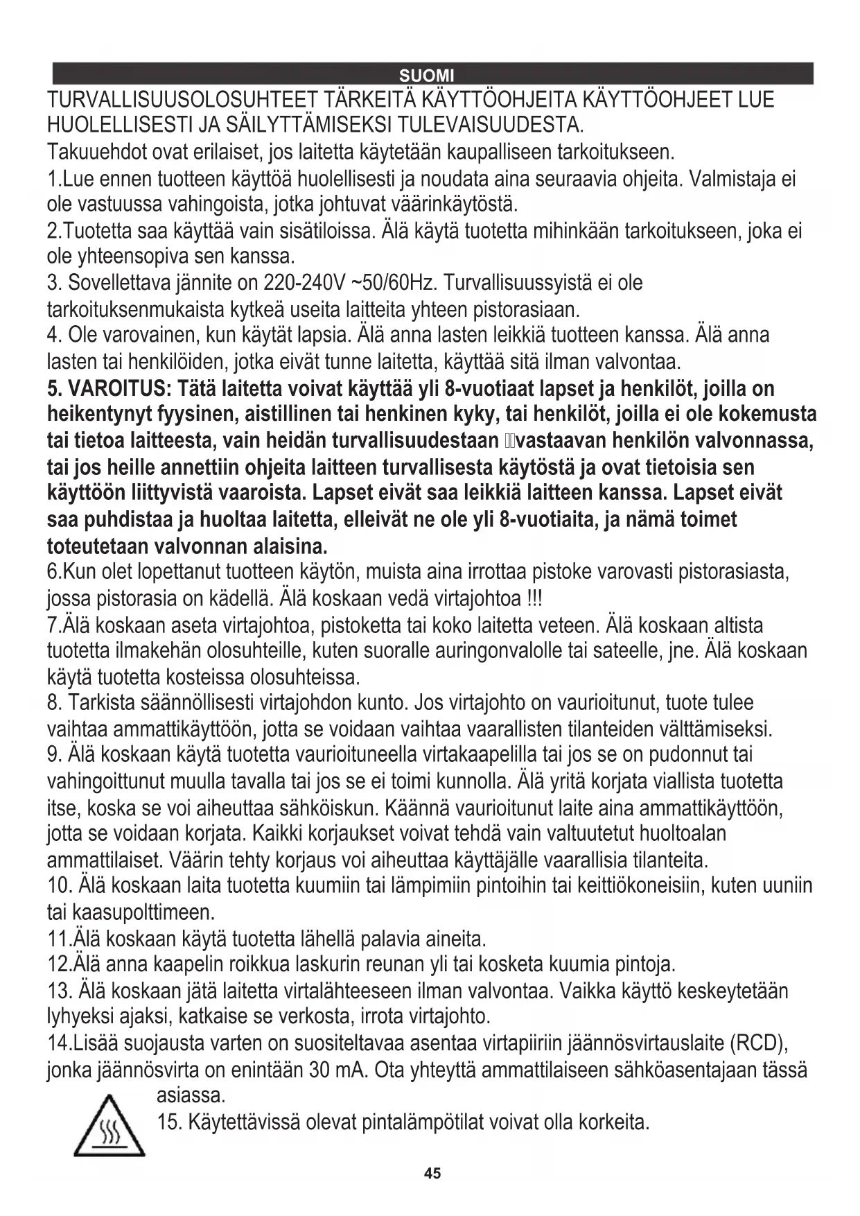 28. VAROITTAA HUOLELLISESTI, jos käytät laitetta korkeille lämpötiloille herkille pinnoille.