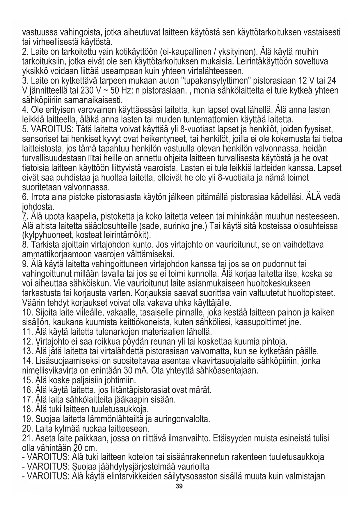 Figyelmeztetés: tűzveszély39 vastuussa vahingoista, jotka aiheutuvat laitteen käytöstä sen käyttötarkoituksen vastaisesti tai virheellisestä käytöstä.
