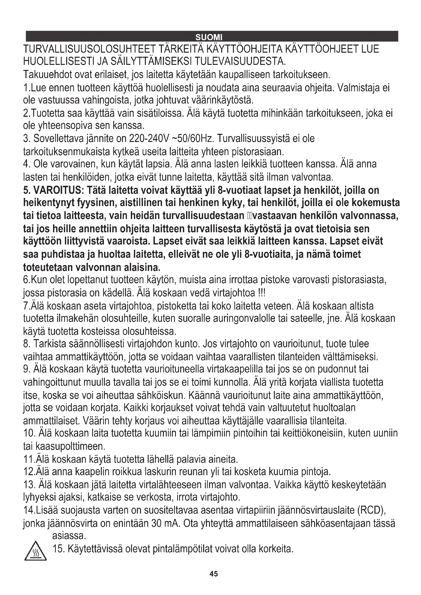 heikentynyt fyysinen, aistillinen tai henkinen kyky, tai henkilöt, joilla ei ole kokemusta tai tietoa laitteesta, vain heidän turvallisuudestaan vastaavan henkilön valvonnassa, tai jos heille annettiin ohjeita laitteen turvallisesta käytöstä ja ovat tietoisia sen käyttöön liittyvistä vaaroista. Lapset eivät saa leikkiä laitteen kanssa. Lapset eivät saa puhdistaa ja huoltaa laitetta, elleivät ne ole yli 8-vuotiaita, ja nämä toimet toteutetaan valvonnan alaisina. 6.Kun olet lopettanut tuotteen käytön, muista aina irrottaa pistoke varovasti pistorasiasta, jossa pistorasia on kädellä. Älä koskaan vedä virtajohtoa !!!