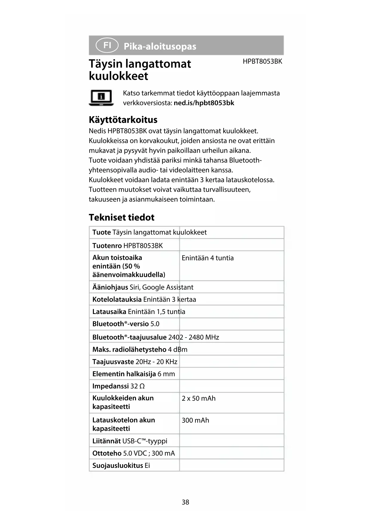 Pika-aloitusopas Täysin langattomat kuulokkeet HPBT8053BK Katso tarkemmat tiedot käyttöoppaan laajemmasta verkkoversiosta: ned.is/hpbt8053bk Käyttötarkoitus Nedis HPBT8053BK ovat täysin langattomat kuulokkeet. Kuulokkeissa on korvakoukut, joiden ansiosta ne ovat erittäin mukavat ja pysyvät hyvin paikoillaan urheilun aikana. Tuote voidaan yhdistää pariksi minkä tahansa Bluetooth- yhteensopivalla audio- tai videolaitteen kanssa. Kuulokkeet voidaan ladata enintään 3 kertaa latauskotelossa. Tuotteen muutokset voivat vaikuttaa turvallisuuteen, takuuseen ja asianmukaiseen toimintaan. Tekniset tiedot Tuote Täysin langattomat kuulokkeet Tuotenro HPBT8053BK Akun toistoaika enintään (50 % äänenvoimakkuudella) Enintään 4 tuntia Ääniohjaus Siri, Google Assistant Kotelolatauksia Enintään 3 kertaa Latausaika Enintään 1,5 tuntia Bluetooth®-versio 5.0 Bluetooth®-taajuusalue 2402 - 2480 MHz Maks. radiolähetysteho 4 dBm Taajuusvaste 20Hz - 20 KHz Elementin halkaisija 6 mm Impedanssi 32 Ω Kuulokkeiden akun kapasiteetti 2 x 50 mAh Latauskotelon akun kapasiteetti 300 mAh Liitännät USB-C™-tyyppi Ottoteho 5.0 VDC ; 300 mA Suojausluokitus Ei39 Tärkeimmät osat (kuva A) 1 Vasemman kuulokkeen paikka 2 Oikean kuulokkeen paikka 3 Latauskotelon LED merkkivalo 4 USB Type-C™ -latausportti 5 Vasemman kuulokkeen painike 6 Oikean kuulokkeen painike 7 Mikrofoni 8 Latauksen LED merkkivalo 9 Yhteyden LED merkkivalo q USB–USB Type-C™ kaapeli w 2 paria korvatyynyjä (M) Turvallisuusohjeet40 Mahdollisten kuulovaurioiden välttämiseksi älä kuuntele suurilla äänenvoimakkuuksilla pitkään.