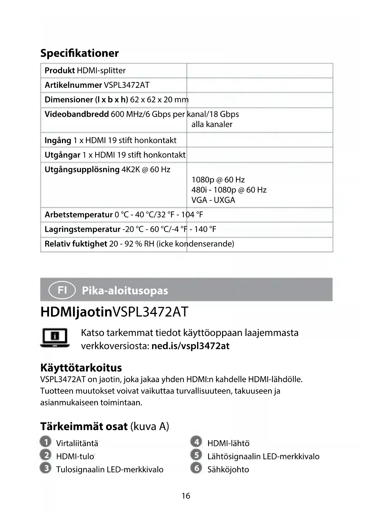 Pika-aloitusopas HDMI jaotin VSPL3472AT Katso tarkemmat tiedot käyttöoppaan laajemmasta verkkoversiosta: ned.is/vspl3472at Käyttötarkoitus VSPL3472AT on jaotin, joka jakaa yhden HDMI:n kahdelle HDMI-lähdölle. Tuotteen muutokset voivat vaikuttaa turvallisuuteen, takuuseen ja asianmukaiseen toimintaan. Tärkeimmät osat (kuva A)