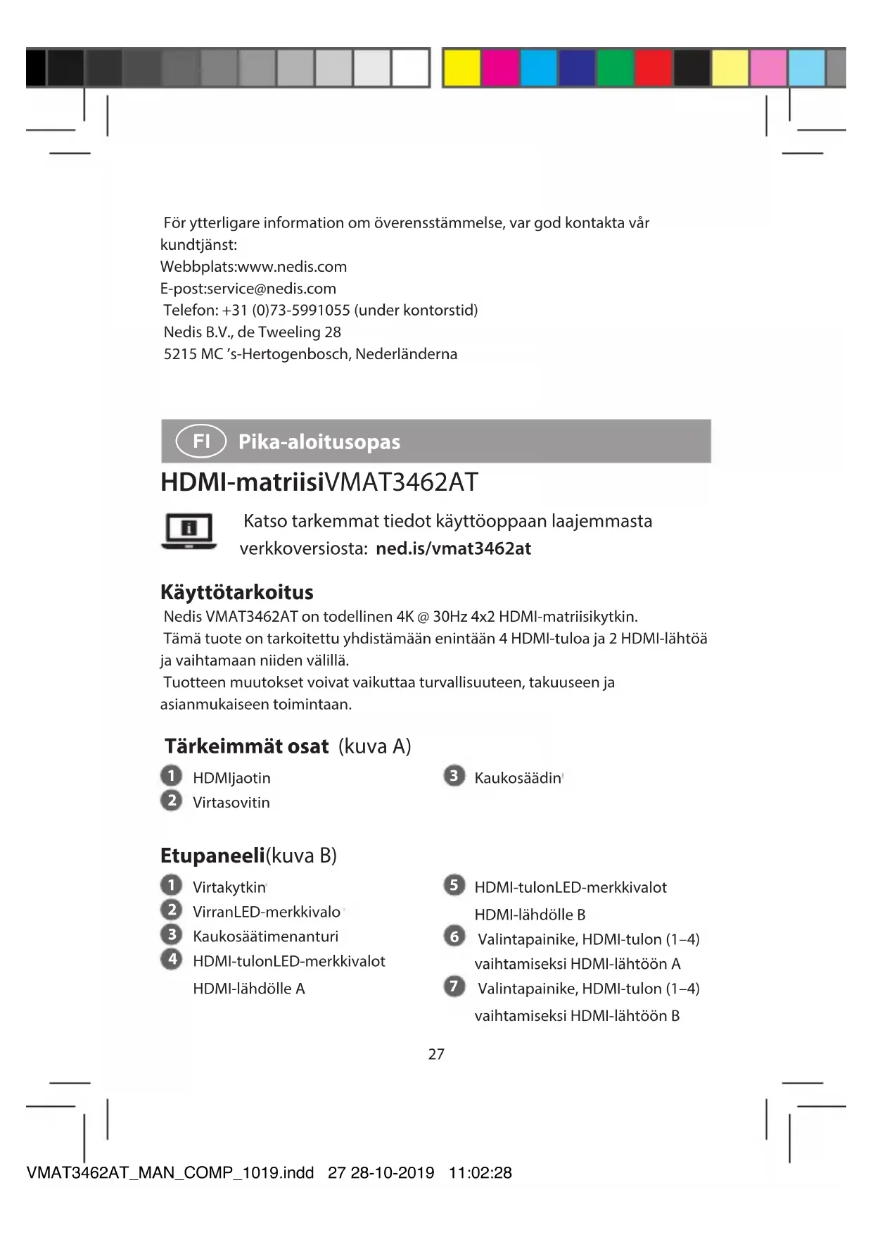 valitaksesi tulon kummallekin HDMI-lähdölle (A, B). VMAT3462AT_MAN_COMP_1019.indd 28 28-10-2019 11:02:2829 Tekniset tiedot Tuote HDMI jaotin Tuotenro VMAT3462AT Mitat (p x l x k) 260 x 110 x 25 mm Tuettu HDMI-resoluutio 4K @ 30 Hz 1080p / 720p / 576p / 480p Kaistanleveys kanavaa kohti enintään 340 MHz Baudinopeus enintään näyttöä kohti 3,4 Gbps Tulo / lähtö DDS-signaali 5 V p-p (TTL) Käyttölämpötila 0 - 45 °C Kosteus 10–85 % suhteellinen kosteus (ei tiivistymistä) Virtalähde 5 VDC / 2 A Takuu 1 vuosi Vaatimustenmukaisuusvakuutus Nedis B.V. ilmoittaa valmistajana, että tuote VMAT3462AT tuotemerkistämme Nedis