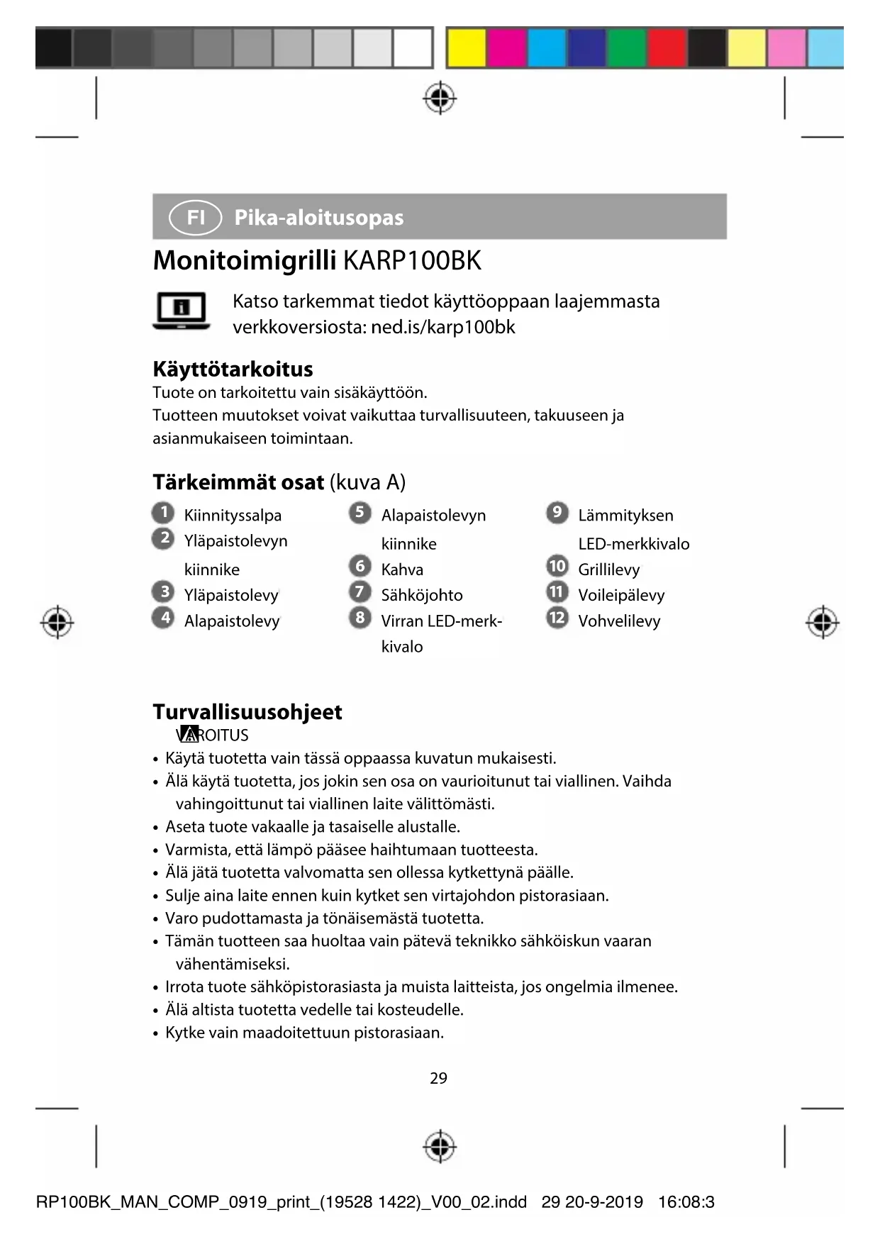 Pika-aloitusopas Monitoimigrilli KARP100BK Katso tarkemmat tiedot käyttöoppaan laajemmasta verkkoversiosta: ned.is/karp100bk Käyttötarkoitus Tuote on tarkoitettu vain sisäkäyttöön.Tuotteen muutokset voivat vaikuttaa turvallisuuteen, takuuseen ja asianmukaiseen toimintaan. Tärkeimmät osat (kuva A)