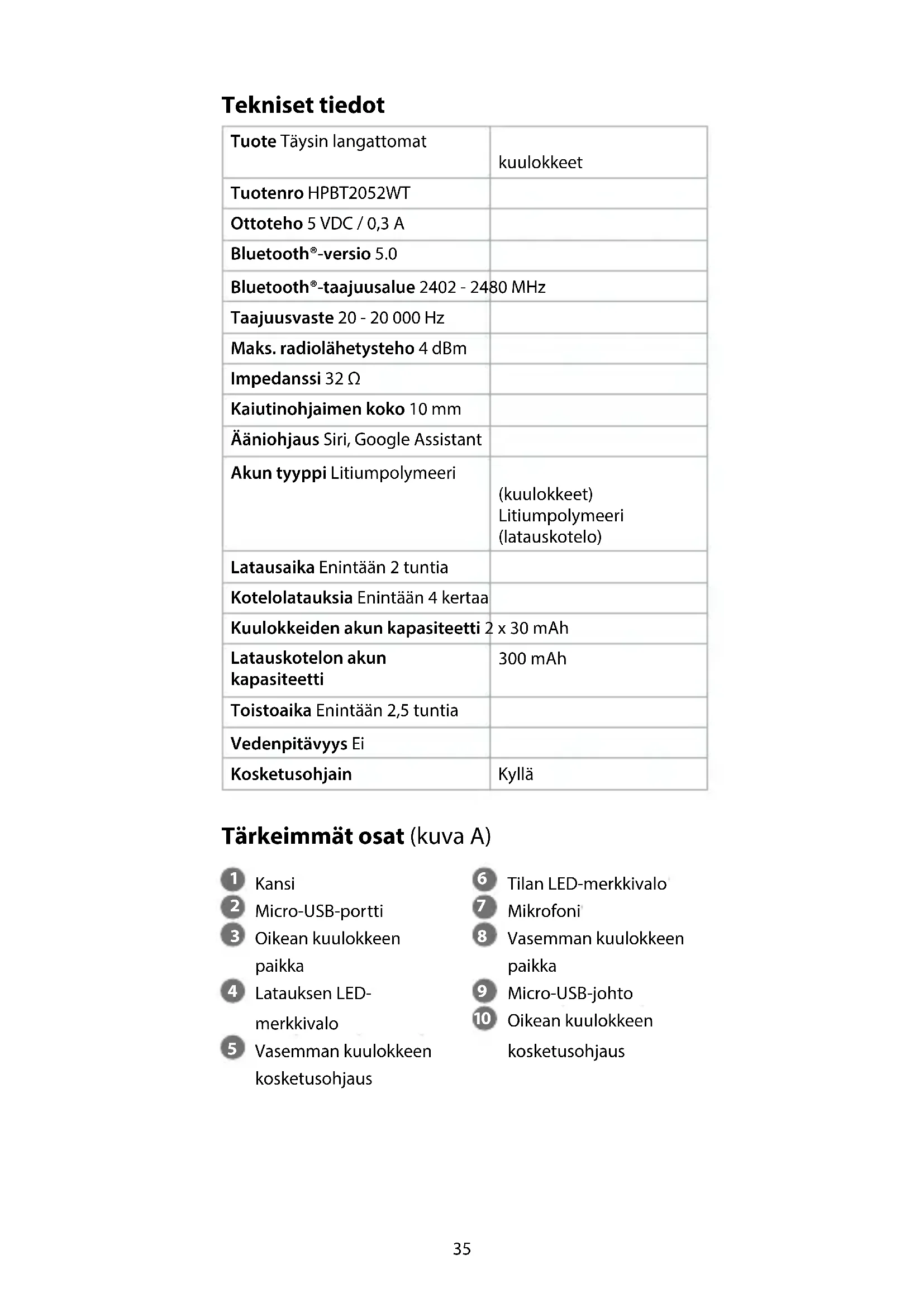 Pika-aloitusopas Täysin langattomat kuulokkeet HPBT2052WT Katso tarkemmat tiedot käyttöoppaan laajemmasta verkkoversiosta: ned.is/hpbt2052wt Käyttötarkoitus Nedis HPBT2052WT ovat täysin langattomat kuulokkeet. Tuote voidaan yhdistää pariksi minkä tahansa Bluetooth- yhteensopivalla audio- tai videolaitteen kanssa.Kuulokkeet voidaan ladata enintään 4 kertaa täyteen ladatussa kotelossa. Tuotteen muutokset voivat vaikuttaa turvallisuuteen, takuuseen ja asianmukaiseen toimintaan.35 Tekniset tiedot Tuote Täysin langattomat kuulokkeet Tuotenro HPBT2052WT Ottoteho 5 VDC / 0,3 A Bluetooth®-versio 5.0 Bluetooth®-taajuusalue 2402 - 2480 MHz Taajuusvaste 20 - 20000 Hz Maks. radiolähetysteho 4 dBm Impedanssi 32 Ω Kaiutinohjaimen koko 10 mm Ääniohjaus Siri, Google Assistant Akun tyyppi Litiumpolymeeri (kuulokkeet) Litiumpolymeeri (latauskotelo) Latausaika Enintään 2 tuntia Kotelolatauksia Enintään 4 kertaa Kuulokkeiden akun kapasiteetti 2 x 30 mAh Latauskotelon akun kapasiteetti 300 mAh Toistoaika Enintään 2,5 tuntia Vedenpitävyys Ei Kosketusohjain Kyllä Tärkeimmät osat (kuva A)