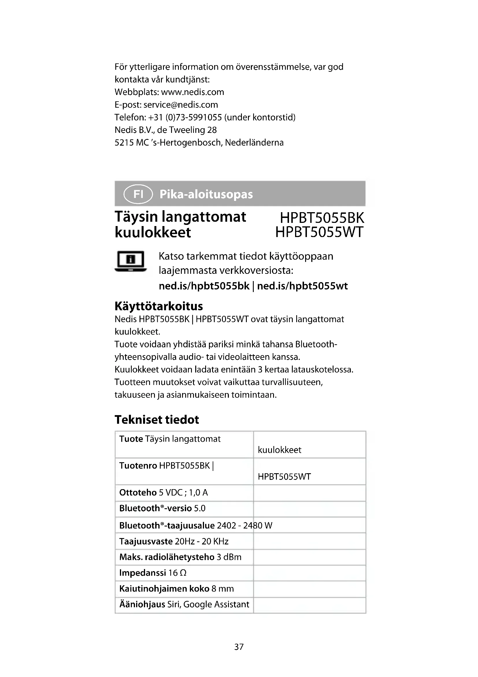, valmistettu Kiinassa, on testattu kaikkien asiaankuuluvien CE-standardien ja määräysten mukaisesti ja tuote on läpäissyt kaikki testit. Tämä sisältää RED 2014/53/EU -direktiivin siihen kuitenkaan rajoittumatta.41 Täydellinen vaatimustenmukaisuusvakuutus (ja käyttöturvallisuustiedote, mikäli käytettävissä) on saatavilla ja ladattavissa osoitteesta webshop.nedis./hpbt5055bk#support | webshop.nedis.com/hpbt5055wt#support Lisätietoa vaatimustenmukaisuudesta saat ottamalla yhteyttä asiakaspalveluun: Internet: www.nedis.com Sähköposti: service@nedis.com Puhelin: +31 (0)73-5991055 (toimistotyöaikana) Nedis B.V., de Tweeling 28 5215 MC ’s-Hertogenbosch, Alankomaat