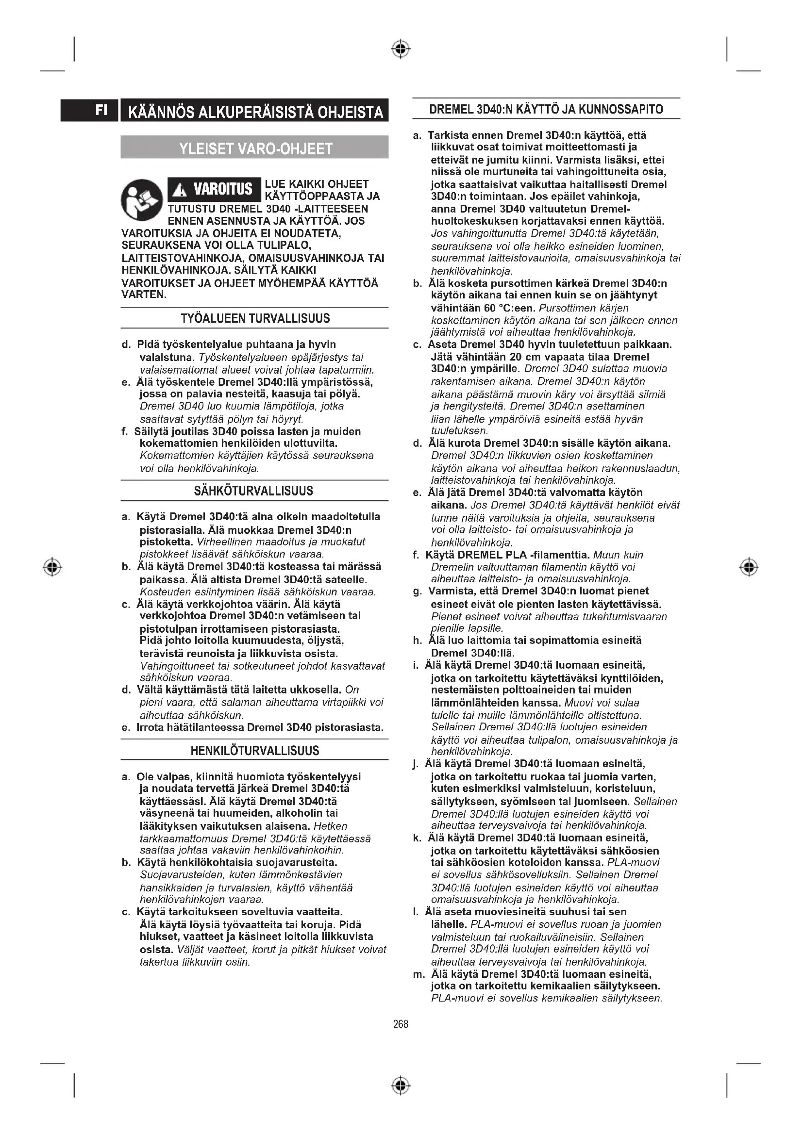 a. Käytä Dremel 3D40:tä aina oikein maadoitetulla pistorasialla. Älä muokkaa Dremel 3D40:n pistoketta. Virheellinen maadoitus ja muokatut pistokkeet lisäävät sähköiskun vaaraa. b. Älä käytä Dremel 3D40:tä kosteassa tai märässä paikassa. Älä altista Dremel 3D40:tä sateelle. Kosteuden esiintyminen lisää sähköiskun vaaraa. c. Älä käytä verkkojohtoa väärin. Älä käytä verkkojohtoa Dremel 3D40:n vetämiseen tai pistotulpan irrottamiseen pistorasiasta. Pidä johto loitolla kuumuudesta, öljystä, terävistä reunoista ja liikkuvista osista. Vahingoittuneet tai sotkeutuneet johdot kasvattavat sähköiskun vaaraa. d. Vältä käyttämästä tätä laitetta ukkosella. On pieni vaara, että salaman aiheuttama virtapiikki voi aiheuttaa sähköiskun. e. Irrota hätätilanteessa Dremel 3D40 pistorasiasta. HENKILÖTURVALLISUUS a. Ole valpas, kiinnitä huomiota työskentelyysi ja noudata tervettä järkeä Dremel 3D40:tä käyttäessäsi. Älä käytä Dremel 3D40:tä väsyneenä tai huumeiden, alkoholin tai lääkityksen vaikutuksen alaisena. Hetken tarkkaamattomuus Dremel 3D40:tä käytettäessä saattaa johtaa vakaviin henkilövahinkoihin. b. Käytä henkilökohtaisia suojavarusteita. Suojavarusteiden, kuten lämmönkestävien hansikkaiden ja turvalasien, käyttö vähentää henkilövahinkojen vaaraa. c. Käytä tarkoitukseen soveltuvia vaatteita. Älä käytä löysiä työvaatteita tai koruja. Pidä hiukset, vaatteet ja käsineet loitolla liikkuvista osista. Väljät vaatteet, korut ja pitkät hiukset voivat takertua liikkuviin osiin. DREMEL 3D40:N KÄYTTÖ JA KUNNOSSAPITO a. Tarkista ennen Dremel 3D40:n käyttöä, että liikkuvat osat toimivat moitteettomasti ja etteivät ne jumitu kiinni. Varmista lisäksi, ettei niissä ole murtuneita tai vahingoittuneita osia, jotka saattaisivat vaikuttaa haitallisesti Dremel 3D40:n toimintaan. Jos epäilet vahinkoja, anna Dremel 3D40 valtuutetun Dremel- huoltokeskuksen korjattavaksi ennen käyttöä. Jos vahingoittunutta Dremel 3D40:tä käytetään, seurauksena voi olla heikko esineiden luominen, suuremmat laitteistovaurioita, omaisuusvahinkoja tai henkilövahinkoja. b. Älä kosketa pursottimen kärkeä Dremel 3D40:n käytön aikana tai ennen kuin se on jäähtynyt vähintään 60 °C:een. Pursottimen kärjen koskettaminen käytön aikana tai sen jälkeen ennen jäähtymistä voi aiheuttaa henkilövahinkoja. c. Aseta Dremel 3D40 hyvin tuuletettuun paikkaan. Jätä vähintään 20 cm vapaata tilaa Dremel 3D40:n ympärille. Dremel 3D40 sulattaa muovia rakentamisen aikana. Dremel 3D40:n käytön aikana päästämä muovin käry voi ärsyttää silmiä ja hengitysteitä. Dremel 3D40:n asettaminen liian lähelle ympäröiviä esineitä estää hyvän tuuletuksen. d. Älä kurota Dremel 3D40:n sisälle käytön aikana. Dremel 3D40:n liikkuvien osien koskettaminen käytön aikana voi aiheuttaa heikon rakennuslaadun, laitteistovahinkoja tai henkilövahinkoja. e. Älä jätä Dremel 3D40:tä valvomatta käytön aikana. Jos Dremel 3D40:tä käyttävät henkilöt eivät tunne näitä varoituksia ja ohjeita, seurauksena voi olla laitteisto- tai omaisuusvahinkoja ja henkilövahinkoja. f. Käytä DREMEL PLA -lamenttia. Muun kuin Dremelin valtuuttaman lamentin käyttö voi aiheuttaa laitteisto- ja omaisuusvahinkoja. g. Varmista, että Dremel 3D40:n luomat pienet esineet eivät ole pienten lasten käytettävissä. Pienet esineet voivat aiheuttaa tukehtumisvaaran pienille lapsille. h. Älä luo laittomia tai sopimattomia esineitä Dremel 3D40:llä.