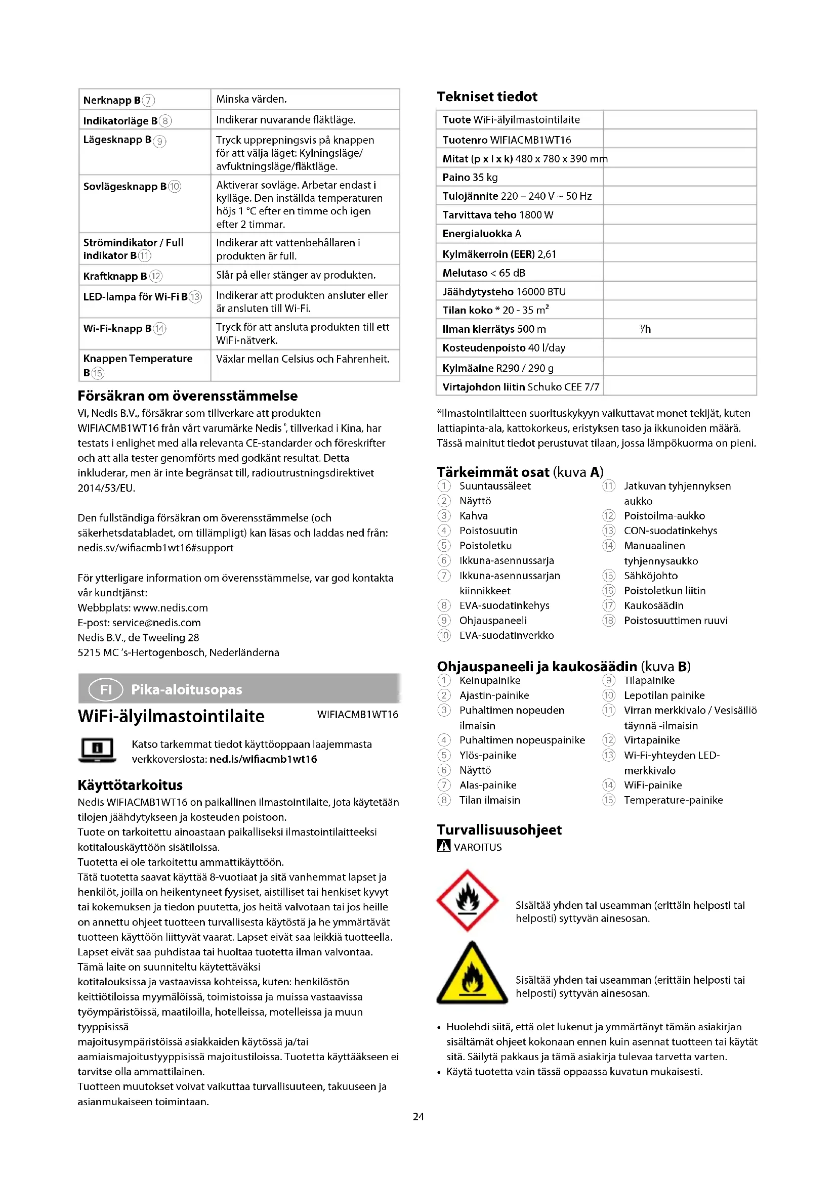 Pika-aloitusopas WiFi-älyilmastointilaite WIFIACMB1WT16Katso tarkemmat tiedot käyttöoppaan laajemmasta verkkoversiosta: ned.is/wiacmb1wt16 Käyttötarkoitus Nedis WIFIACMB1WT16 on paikallinen ilmastointilaite, jota käytetään tilojen jäähdytykseen ja kosteuden poistoon.Tuote on tarkoitettu ainoastaan paikalliseksi ilmastointilaitteeksi kotitalouskäyttöön sisätiloissa.Tuotetta ei ole tarkoitettu ammattikäyttöön.Tätä tuotetta saavat käyttää 8-vuotiaat ja sitä vanhemmat lapset ja henkilöt, joilla on heikentyneet fyysiset, aistilliset tai henkiset kyvyt tai kokemuksen ja tiedon puutetta, jos heitä valvotaan tai jos heille on annettu ohjeet tuotteen turvallisesta käytöstä ja he ymmärtävät tuotteen käyttöön liittyvät vaarat. Lapset eivät saa leikkiä tuotteella. Lapset eivät saa puhdistaa tai huoltaa tuotetta ilman valvontaa.Tämä laite on suunniteltu käytettäväksikotitalouksissa ja vastaavissa kohteissa, kuten: henkilöstön keittiötiloissa myymälöissä, toimistoissa ja muissa vastaavissa työympäristöissä, maatiloilla, hotelleissa, motelleissa ja muun tyyppisissämajoitusympäristöissä asiakkaiden käytössä ja/tai aamiaismajoitustyyppisissä majoitustiloissa. Tuotetta käyttääkseen ei tarvitse olla ammattilainen.Tuotteen muutokset voivat vaikuttaa turvallisuuteen, takuuseen ja asianmukaiseen toimintaan.25