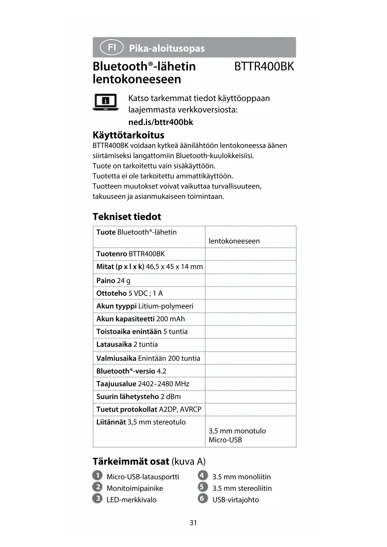 Pika-aloitusopas Bluetooth®-lähetin lentokoneeseen BTTR400BK Katso tarkemmat tiedot käyttöoppaan laajemmasta verkkoversiosta: ned.is/bttr400bk Käyttötarkoitus BTTR400BK voidaan kytkeä äänilähtöön lentokoneessa äänen siirtämiseksi langattomiin Bluetooth-kuulokkeisiisi. Tuote on tarkoitettu vain sisäkäyttöön. Tuotetta ei ole tarkoitettu ammattikäyttöön. Tuotteen muutokset voivat vaikuttaa turvallisuuteen, takuuseen ja asianmukaiseen toimintaan. Tekniset tiedot Tuote Bluetooth®-lähetin lentokoneeseen Tuotenro BTTR400BK Mitat (p x l x k) 46,5 x 45 x 14 mm Paino 24 g Ottoteho 5 VDC ; 1 A Akun tyyppi Litium-polymeeri Akun kapasiteetti 200 mAh Toistoaika enintään 5 tuntia Latausaika 2 tuntia Valmiusaika Enintään 200 tuntia Bluetooth®-versio 4.2 Taajuusalue 2402–2480 MHz Suurin lähetysteho 2 dBm Tuetut protokollat A2DP, AVRCP Liitännät 3,5 mm stereotulo 3,5 mm monotulo Micro-USB Tärkeimmät osat (kuva A)