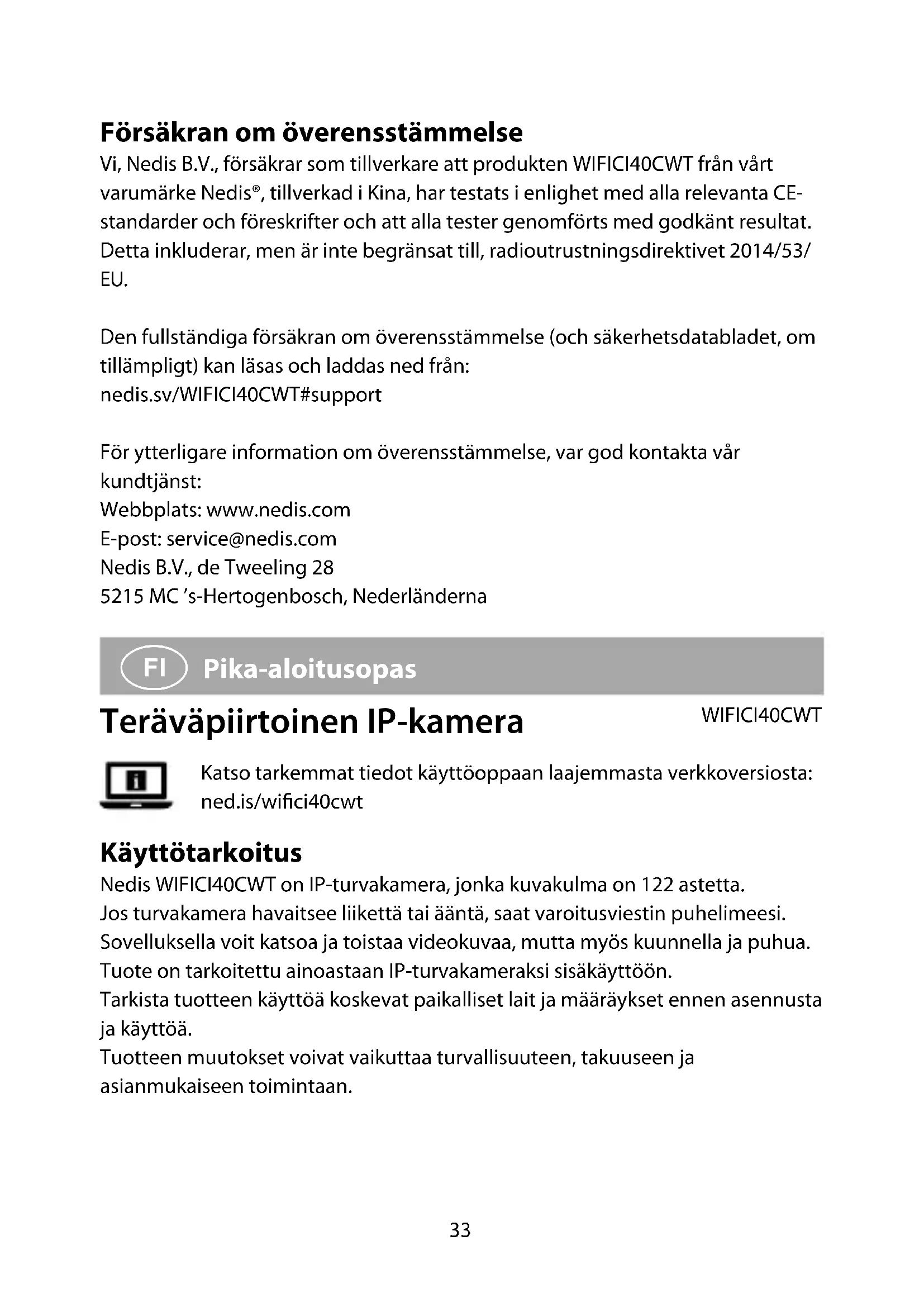 - Langattomien häiriöiden välttämiseksi pidä kamera vähintään 1 metrin päässä langattomista laitteista, mukaan lukien Wi-Fi-reitittimet ja matkapuhelimet. Vaatimustenmukaisuusvakuutus Nedis B.V. ilmoittaa valmistajana, että tuote WIFICI40CWT tuotemerkistämme Nedis®, valmistettu Kiinassa, on testattu kaikkien asiaankuuluvien CE- standardien ja määräysten mukaisesti ja tuote on läpäissyt kaikki testit. Tämä sisältää RED 2014/53/EU -direktiivin siihen kuitenkaan rajoittumatta. Täydellinen vaatimustenmukaisuusvakuutus (ja käyttöturvallisuustiedote, mikäli käytettävissä) on saatavilla ja ladattavissa osoitteesta: nedis./WIFICI40CWT#support Lisätietoa vaatimustenmukaisuudesta saat ottamalla yhteyttä asiakaspalveluun: Internet: www.nedis.com Sähköposti: service@nedis.com Nedis B.V., de Tweeling 28 5215 MC ’s-Hertogenbosch, Alankomaat37