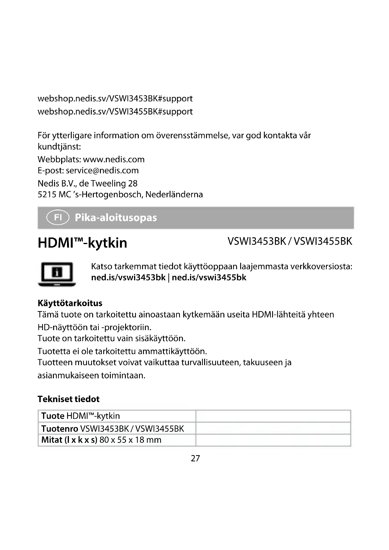 vaihtaaksesi tulojen välillä. Vaatimustenmukaisuusvakuutus Nedis B.V. ilmoittaa valmistajana, että tuote VSWI3453BK / VSWI3455BK tuotemerkistämme Nedis