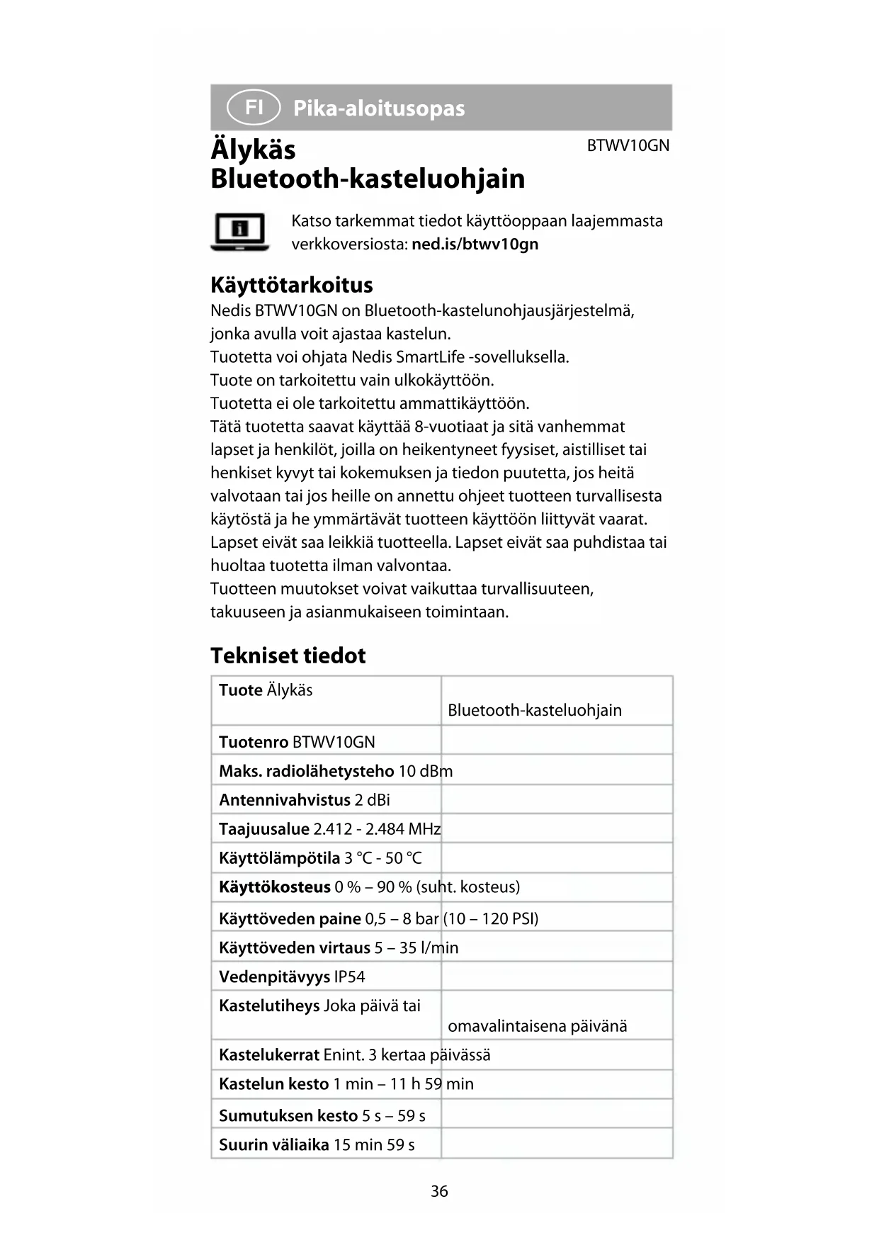 Pika-aloitusopas Älykäs Bluetooth-kasteluohjain BTWV10GN Katso tarkemmat tiedot käyttöoppaan laajemmasta verkkoversiosta: ned.is/btwv10gn Käyttötarkoitus Nedis BTWV10GN on Bluetooth-kastelunohjausjärjestelmä, jonka avulla voit ajastaa kastelun. Tuotetta voi ohjata Nedis SmartLife -sovelluksella. Tuote on tarkoitettu vain ulkokäyttöön. Tuotetta ei ole tarkoitettu ammattikäyttöön. Tätä tuotetta saavat käyttää 8-vuotiaat ja sitä vanhemmat lapset ja henkilöt, joilla on heikentyneet fyysiset, aistilliset tai henkiset kyvyt tai kokemuksen ja tiedon puutetta, jos heitä valvotaan tai jos heille on annettu ohjeet tuotteen turvallisesta käytöstä ja he ymmärtävät tuotteen käyttöön liittyvät vaarat. Lapset eivät saa leikkiä tuotteella. Lapset eivät saa puhdistaa tai huoltaa tuotetta ilman valvontaa. Tuotteen muutokset voivat vaikuttaa turvallisuuteen, takuuseen ja asianmukaiseen toimintaan. Tekniset tiedot Tuote Älykäs Bluetooth-kasteluohjain Tuotenro BTWV10GN Maks. radiolähetysteho 10 dBm Antennivahvistus 2 dBi Taajuusalue 2.412 - 2.484 MHz Käyttölämpötila 3 °C - 50 °C Käyttökosteus 0 % – 90 % (suht. kosteus) Käyttöveden paine 0,5 – 8 bar (10 – 120 PSI) Käyttöveden virtaus 5 – 35 l/min Vedenpitävyys IP54 Kastelutiheys Joka päivä tai omavalintaisena päivänä Kastelukerrat Enint. 3 kertaa päivässä Kastelun kesto 1 min – 11 h 59 min Sumutuksen kesto 5 s – 59 s Suurin väliaika 15 min 59 s37 Sumutusaika 1 min – 11 h 59 min Akkutyyppi 4 x AA (eivät sisälly) Tärkeimmät osat (kuva A) 1 Tilan LED-merkkivalo 2 Ohjauspainike 3 Paristolokeron aukko 4 Paristolokero 5 Vedensuodatin 6 Vedentäyttöaukko 7 Vedenpoistoaukko Sovelluksen yleiskuvaus (kuva B) 1 Viimeksi käytetyn veden määrä 2 Akun tila / Parhaillaan aktiivinen tila / Jäljellä oleva aika ennen seuraavaa kastelua 3 Manuaalinen tila 4 Parametri 5 Vaihda Celsius- ja Fahrenheit-asteiden välillä. 6 Ajasta kastelua 7 Anturi 8 Tietoja ja ohjeita Turvallisuusohjeet