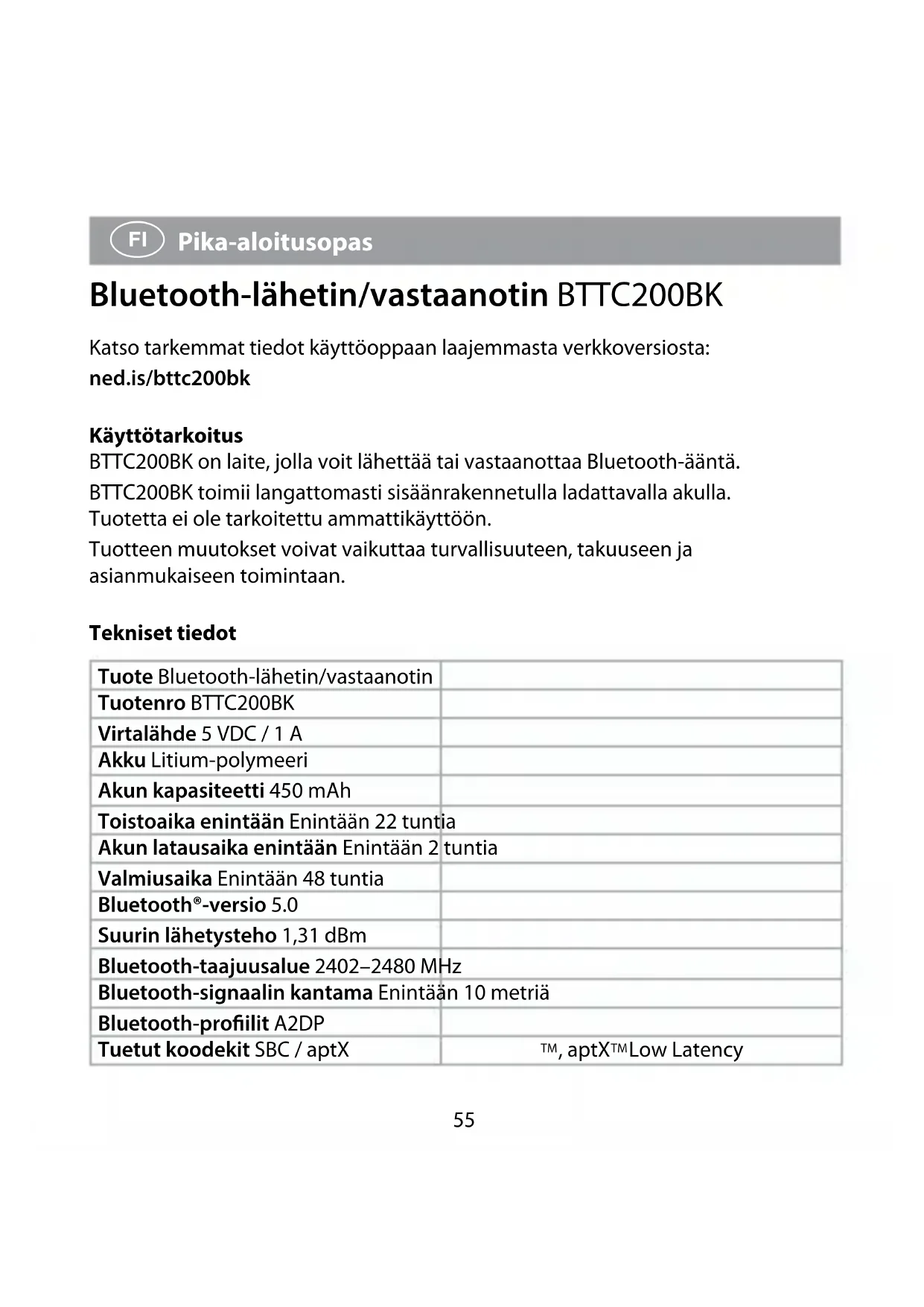 Pika-aloitusopas Bluetooth-lähetin/vastaanotin BTTC200BK Katso tarkemmat tiedot käyttöoppaan laajemmasta verkkoversiosta: ned.is/bttc200bk Käyttötarkoitus BTTC200BK on laite, jolla voit lähettää tai vastaanottaa Bluetooth-ääntä. BTTC200BK toimii langattomasti sisäänrakennetulla ladattavalla akulla. Tuotetta ei ole tarkoitettu ammattikäyttöön. Tuotteen muutokset voivat vaikuttaa turvallisuuteen, takuuseen ja asianmukaiseen toimintaan. Tekniset tiedot Tuote Bluetooth-lähetin/vastaanotin Tuotenro BTTC200BK Virtalähde 5 VDC / 1 A Akku Litium-polymeeri Akun kapasiteetti 450 mAh Toistoaika enintään Enintään 22 tuntia Akun latausaika enintään Enintään 2 tuntia Valmiusaika Enintään 48 tuntia Bluetooth®-versio 5.0 Suurin lähetysteho 1,31 dBm Bluetooth-taajuusalue 2402–2480 MHz Bluetooth-signaalin kantama Enintään 10 metriä Bluetooth-proilit A2DP Tuetut koodekit SBC / aptX