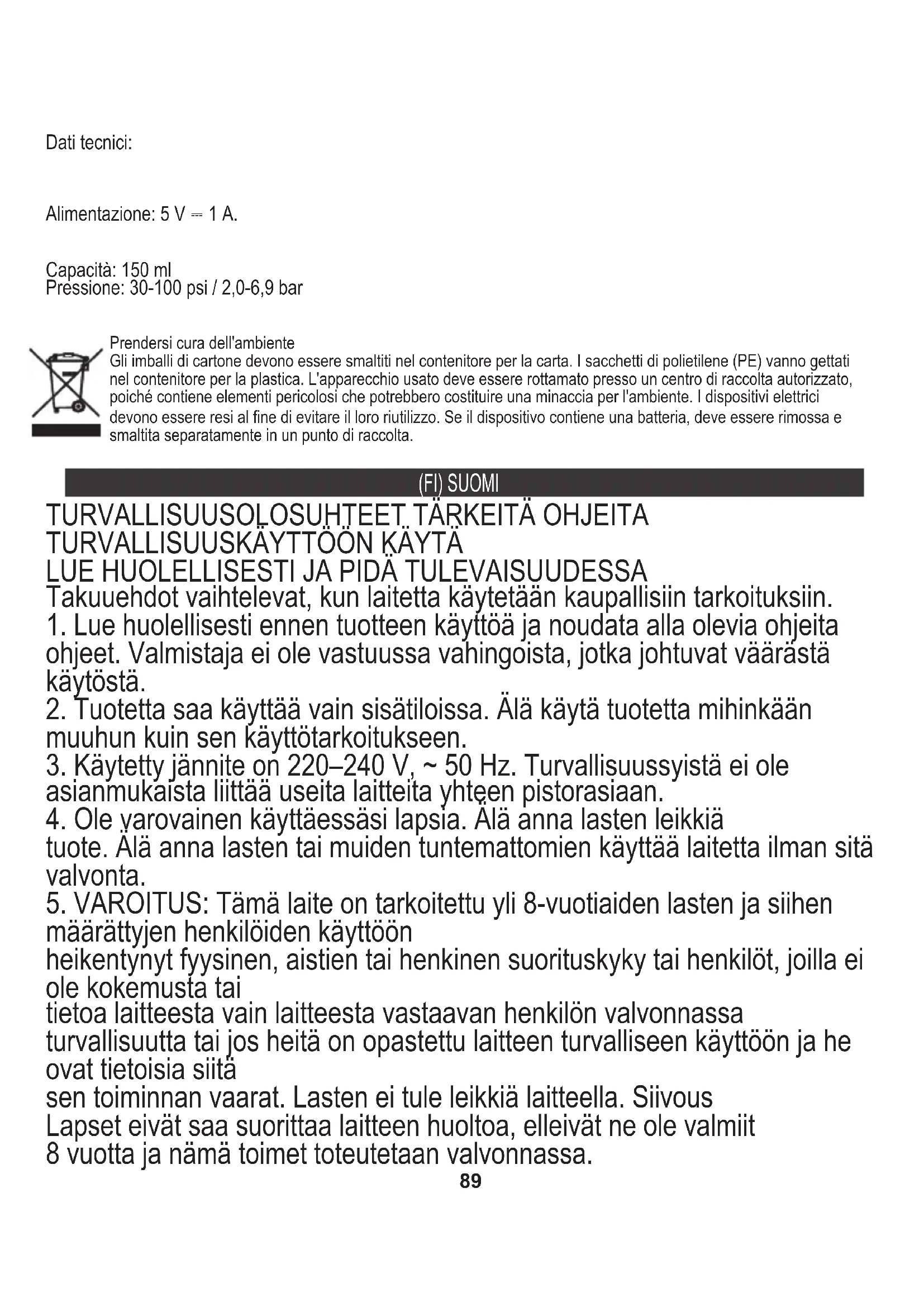 Tämä tuote voi kerätä paineita, jotka voivat aiheuttaa vakavia vahinkoja näillä alueilla. turvallisesti aikuisten valvonnassa tai saatuaan ohjeet laitteen turvallisesta käytöstä. ja ymmärtämään niihin liittyvät vaarat, ihmiset, joilla on heikentyneet fyysiset, aistilliset tai henkiset kyvyt tai kokemuksen ja tiedon puute, voivat käyttää tuotetta saatuaan asianmukaista valvontaa tai opastusta laitteen käytöstä ja ymmärtävät siihen liittyvät vaarat.