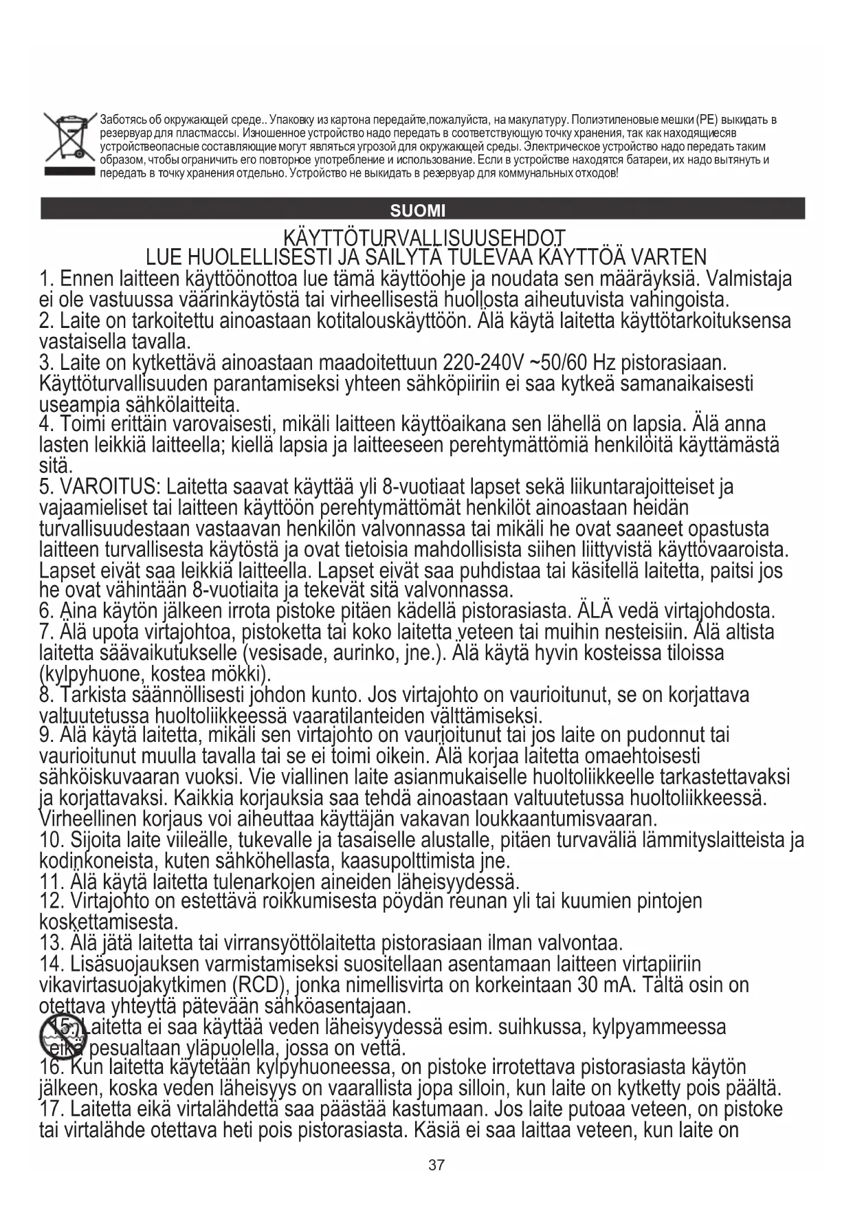 15. Laitetta ei saa käyttää veden läheisyydessä esim. suihkussa, kylpyammeessa