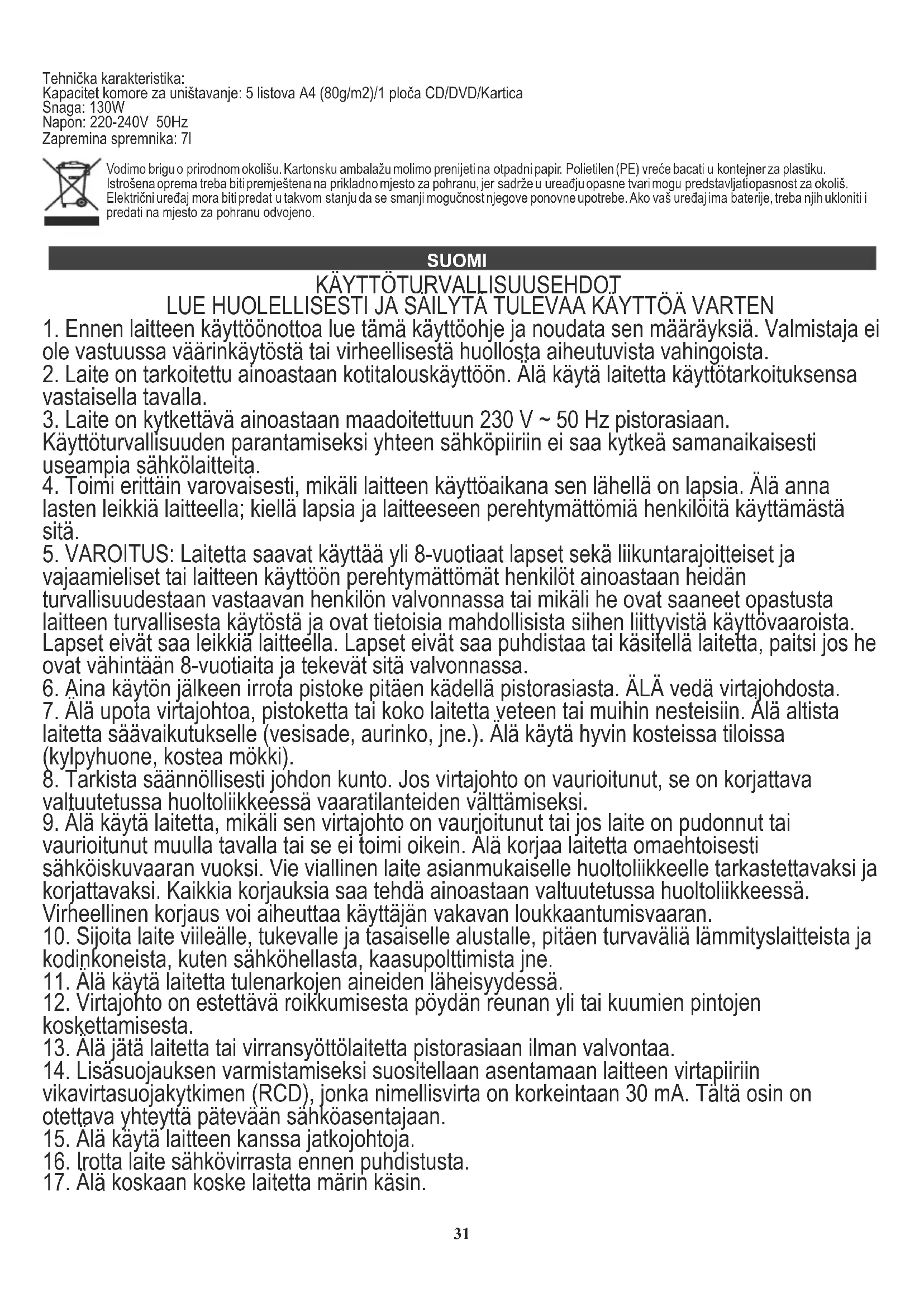 Liitä laitteen teholle. TOIMINTO AUTO (1) Sitä käytetään tuhoamaan paperia. Aseta painike asentoon (1) ja aseta paperia kasettiin (5). Laite tuhoaa automaattisesti niitä. TOIMINTO REV (3) Siinä on kaksi toimintaa. Sitä käytetään peruuttamaan juuttunut paperia kasettista (5) ja tuhoamaan CD-levyja / kortteja kasettissa (4). Jotta käyttää kasettia (4), vaihtaa painike REV asentoon (3) ja aseta siihen, esim. levyn. TOIMINTO OFF (2) Sitä käytetään sammuttamaan laitteen. Sammuta aina laite ennen irrottamista virtalähteestä ja liikenneelle. HUOM Laite tarvitsee 60 minuutia tauko jokaiselle 2 minuuttia työtä. ENNEN TUHOAMINEN POISTAA LEIKKEET JA KAIKENLAISIA PAPERILIITTIMET SIVUISTA!