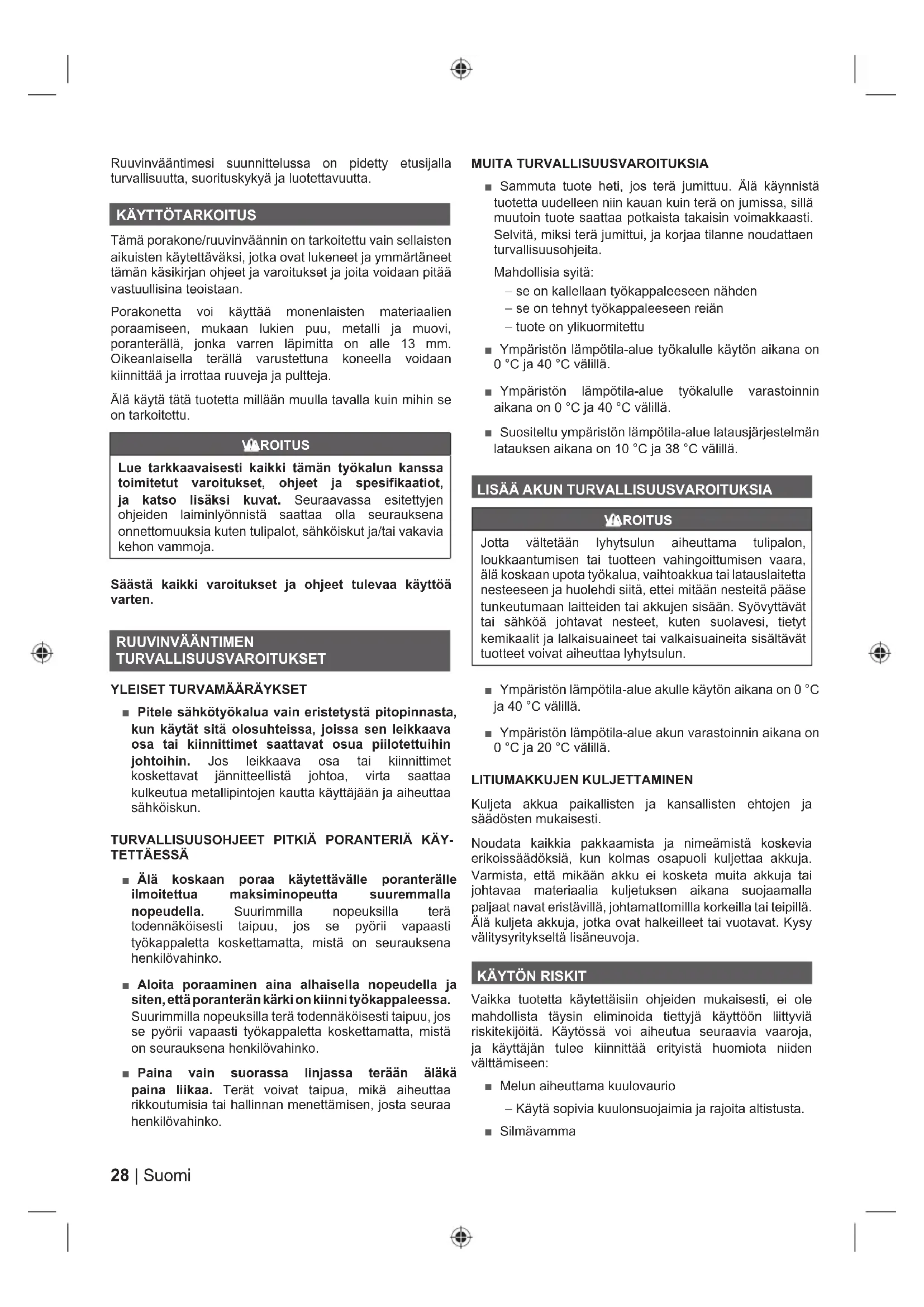 Tämä porakone/ruuvinväännin on tarkoitettu vain sellaisten aikuisten käytettäväksi, jotka ovat lukeneet ja ymmärtäneet tämän käsikirjan ohjeet ja varoitukset ja joita voidaan pitää vastuullisina teoistaan. Porakonetta voi käyttää monenlaisten materiaalien poraamiseen, mukaan lukien puu, metalli ja muovi, poranterällä, jonka varren läpimitta on alle 13 mm. Oikeanlaisella terällä varustettuna koneella voidaan kiinnittää ja irrottaa ruuveja ja pultteja. Älä käytä tätä tuotetta millään muulla tavalla kuin mihin se on tarkoitettu. VAROITUS Lue tarkkaavaisesti kaikki tämän työkalun kanssa toimitetut varoitukset, ohjeet ja spesifikaatiot, ja katso lisäksi kuvat. Seuraavassa esitettyjen ohjeiden laiminlyönnistä saattaa olla seurauksena onnettomuuksia kuten tulipalot, sähköiskut ja/tai vakavia kehon vammoja. Säästä kaikki varoitukset ja ohjeet tulevaa käyttöä varten. RUUVINVÄÄNTIMEN TURVALLISUUSVAROITUKSET