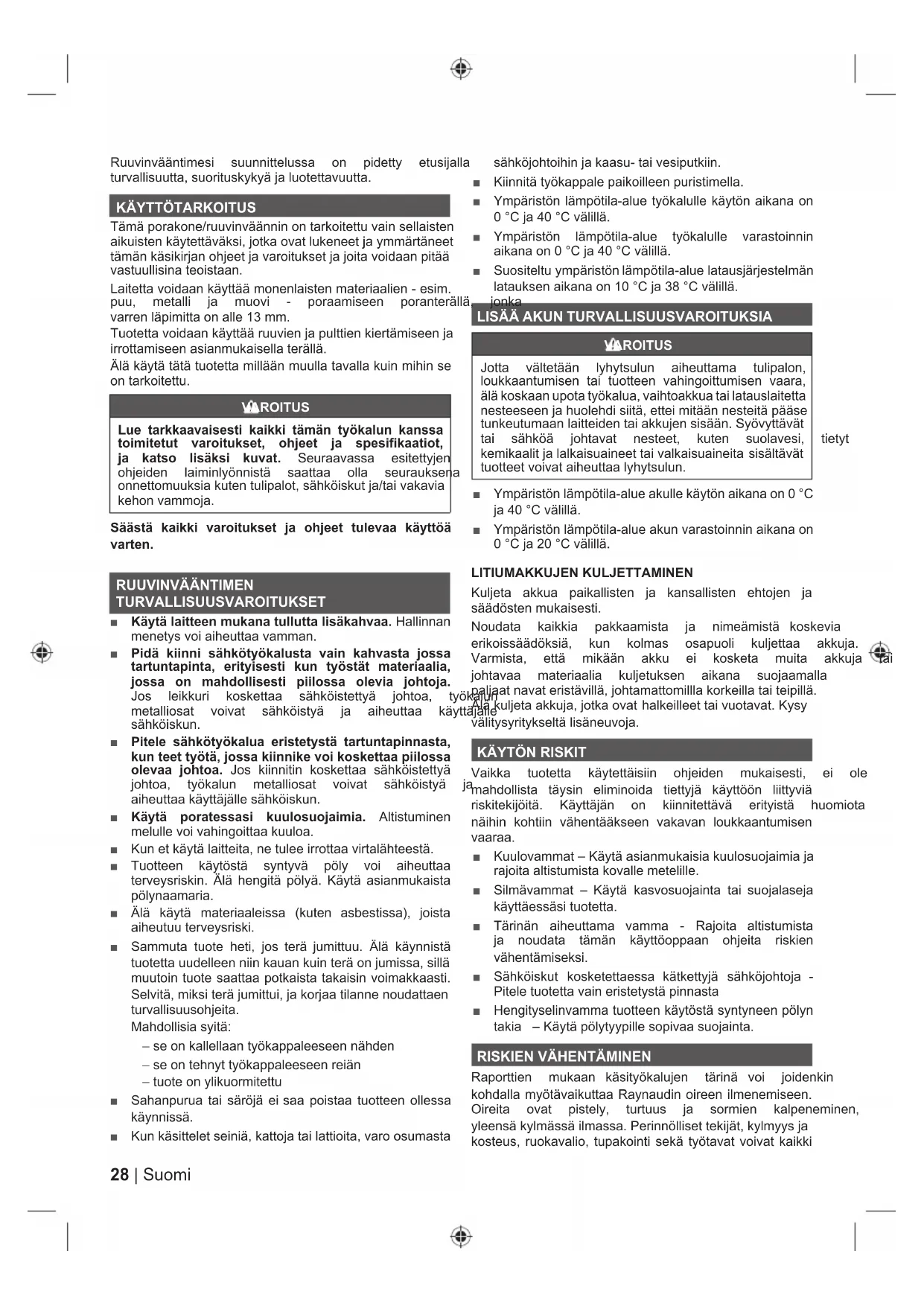 7lPlSRUDNRQHUXXYLQYllQQLQRQWDUNRLWHWWXYDLQVHOODLVWHQ DLNXLVWHQNl\WHWWlYlNVLMRWNDRYDWOXNHQHHWMD\PPlUWlQHHW WlPlQNlVLNLUMDQRKMHHWMDYDURLWXNVHWMDMRLWDYRLGDDQSLWll vastuullisina teoistaan. Laitetta voidaan käyttää monenlaisten materiaalien - esim. SXX PHWDOOL MD PXRYL SRUDDPLVHHQ SRUDQWHUlOOl MRQND varren läpimitta on alle 13 mm. 7XRWHWWDYRLGDDQNl\WWllUXXYLHQMDSXOWWLHQNLHUWlPLVHHQMD irrottamiseen asianmukaisella terällä. Älä käytä tätä tuotetta millään muulla tavalla kuin mihin se on tarkoitettu. VAROITUS Lue tarkkaavaisesti kaikki tämän työkalun kanssa toimitetut varoitukset, ohjeet ja spesifikaatiot, ja katso lisäksi kuvat. 6HXUDDYDVVD HVLWHWW\MHQ RKMHLGHQ ODLPLQO\|QQLVWl VDDWWDD ROOD VHXUDXNVHQD RQQHWWRPXXNVLDNXWHQWXOLSDORWVlKN|LVNXWMDWDLYDNDYLD NHKRQYDPPRMD Säästä kaikki varoitukset ja ohjeet tulevaa käyttöä varten. RUUVINVÄÄNTIMEN TURVALLISUUSVAROITUKSET Ŷ Käytä laitteen mukana tullutta lisäkahvaa. Hallinnan menetys voi aiheuttaa vamman. Ŷ Pidä kiinni sähkötyökalusta vain kahvasta jossa tartuntapinta, erityisesti kun työstät materiaalia, jossa on mahdollisesti piilossa olevia johtoja. -RV OHLNNXUL NRVNHWWDD VlKN|LVWHWW\l MRKWRD W\|NDOXQ PHWDOOLRVDW YRLYDW VlKN|LVW\l MD DLKHXWWDD Nl\WWlMlOOH sähköiskun. Ŷ Pitele sähkötyökalua eristetystä tartuntapinnasta, kun teet työtä, jossa kiinnike voi koskettaa piilossa olevaa johtoa. Jos kiinnitin koskettaa sähköistettyä MRKWRD W\|NDOXQ PHWDOOLRVDW YRLYDW VlKN|LVW\l MD DLKHXWWDDNl\WWlMlOOHVlKN|LVNXQ Ŷ Käytä poratessasi kuulosuojaimia. Altistuminen melulle voi vahingoittaa kuuloa. Ŷ Kun et käytä laitteita, ne tulee irrottaa virtalähteestä. Ŷ Tuotteen käytöstä syntyvä pöly voi aiheuttaa terveysriskin. Älä hengitä pölyä. Käytä asianmukaista pölynaamaria. Ŷ bOl Nl\Wl PDWHULDDOHLVVD NXWHQ DVEHVWLVVD MRLVWD aiheutuu terveysriski. Ŷ 6DPPXWD WXRWH KHWL MRV WHUl MXPLWWXX bOl Nl\QQLVWl WXRWHWWDXXGHOOHHQQLLQNDXDQNXLQWHUlRQMXPLVVDVLOOl muutoin tuote saattaa potkaista takaisin voimakkaasti. 6HOYLWlPLNVLWHUlMXPLWWXLMDNRUMDDWLODQQHQRXGDWWDHQ WXUYDOOLVXXVRKMHLWD Mahdollisia syitä: – se on kallellaan työkappaleeseen nähden – se on tehnyt työkappaleeseen reiän – tuote on ylikuormitettu Ŷ 6DKDQSXUXDWDLVlU|MlHLVDDSRLVWDDWXRWWHHQROOHVVD käynnissä. Ŷ .XQNlVLWWHOHWVHLQLlNDWWRMDWDLODWWLRLWDYDURRVXPDVWD VlKN|MRKWRLKLQMDNDDVXWDLYHVLSXWNLLQ Ŷ Kiinnitä työkappale paikoilleen puristimella. Ŷ Ympäristön lämpötila-alue työkalulle käytön aikana on &MD&YlOLOOl Ŷ Ympäristön lämpötila-alue työkalulle varastoinnin DLNDQDRQ&MD&YlOLOOl Ŷ 6XRVLWHOWX\PSlULVW|QOlPS|WLODDOXHODWDXVMlUMHVWHOPlQ ODWDXNVHQDLNDQDRQ&MD&YlOLOOl