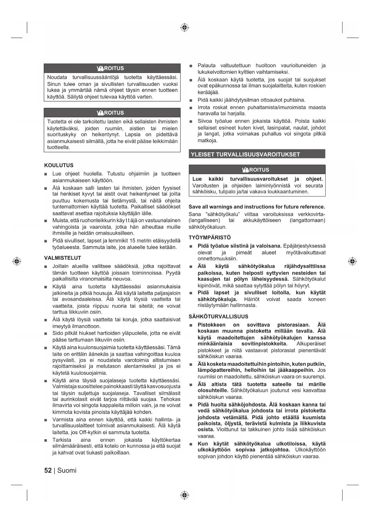 haravalla tai harjalla. Ŷ Siivoa työalue ennen jokaista käyttöä. Poista kaikki sellaiset esineet kuten kivet, lasinpalat, naulat, johdot ja langat, jotka voimakas puhallus voi singota pitkiä matkoja. YLEISET TURVALLISUUSVAROITUKSET VAROITUS Lue kaikki turvallisuusvaroitukset ja ohjeet. Varoitusten ja ohjeiden laiminlyönnistä voi seurata VlKN|LVNXWXOLSDORMDWDLYDNDYDORXNNDDQWXPLQHQ Save all warnings and instructions for future reference. Sana ”sähkötyökalu” viittaa varoituksissa verkkovirta- (langalliseen) tai akkukäyttöiseen (langattomaan) sähkötyökaluun.