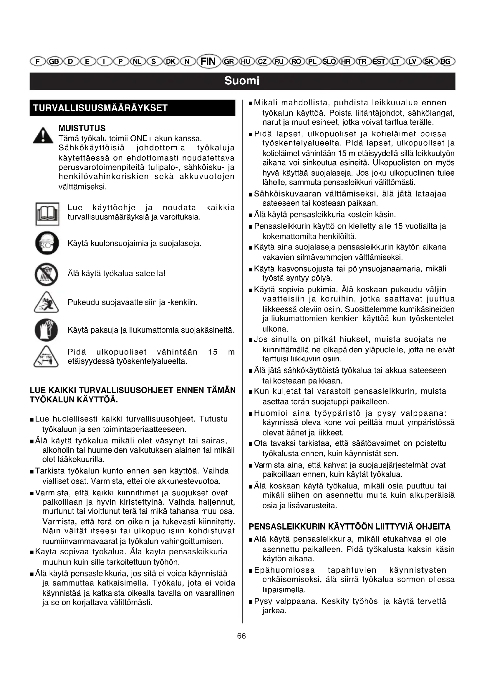 MUISTUTUS Tämä työkalu toimii ONE+ akun kanssa. Sähkökäyttöisiä johdottomia työkaluja käytettäessä on ehdottomasti noudatettava perusvarotoimenpiteitä tulipalo-, sähköisku- ja henkilövahinkoriskien sekä akkuvuotojen välttämiseksi. LUE KAIKKI TURVALLISUUSOHJEET ENNEN TÄMÄN TYÖKALUN KÄYTTÖÄ. ■ Lue huolellisesti kaikki turvallisuusohjeet. Tutustu työkaluun ja sen toimintaperiaatteeseen. ■ Älä käytä työkalua mikäli olet väsynyt tai sairas, alkoholin tai huumeiden vaikutuksen alainen tai mikäli olet lääkekuurilla. ■ Tarkista työkalun kunto ennen sen käyttöä. Vaihda vialliset osat. Varmista, ettei ole akkunestevuotoa. ■ Varmista, että kaikki kiinnittimet ja suojukset ovat paikoillaan ja hyvin kiristettyinä. Vaihda haljennut, murtunut tai vioittunut terä tai mikä tahansa muu osa. Varmista, että terä on oikein ja tukevasti kiinnitetty. Näin vältät itseesi tai ulkopuolisiin kohdistuvat ruumiinvammavaarat ja työkalun vahingoittumisen. ■ Käytä sopivaa työkalua. Älä käytä pensasleikkuria muuhun kuin sille tarkoitettuun työhön. ■ Älä käytä pensasleikkuria, jos sitä ei voida käynnistää ja sammuttaa katkaisimella. Työkalu, jota ei voida käynnistää ja katkaista oikealla tavalla on vaarallinen ja se on korjattava välittömästi. ■ Mikäli mahdollista, puhdista leikkuualue ennen työkalun käyttöä. Poista liitäntäjohdot, sähkölangat, narut ja muut esineet, jotka voivat tarttua terälle. ■ Pidä lapset, ulkopuoliset ja kotieläimet poissa työskentelyalueelta. Pidä lapset, ulkopuoliset ja kotieläimet vähintään 15 m etäisyydellä sillä leikkuutyön aikana voi sinkoutua esineitä. Ulkopuolisten on myös hyvä käyttää suojalaseja. Jos joku ulkopuolinen tulee lähelle, sammuta pensasleikkuri välittömästi. ■ Sähköiskuvaaran välttämiseksi, älä jätä lataajaa sateeseen tai kosteaan paikaan. ■ Älä käytä pensasleikkuria kostein käsin.■ Pensasleikkurin käyttö on kielletty alle 15 vuotiailta ja kokemattomilta henkilöiltä. ■ Käytä aina suojalaseja pensasleikkurin käytön aikana vakavien silmävammojen välttämiseksi. ■ Käytä kasvonsuojusta tai pölynsuojanaamaria, mikäli työstä syntyy pölyä. ■ Käytä sopivia pukimia. Älä koskaan pukeudu väljiin vaatteisiin ja koruihin, jotka saattavat juuttua liikkeessä oleviin osiin. Suosittelemme kumikäsineiden ja liukumattomien kenkien käyttöä kun työskentelet ulkona. ■ Jos sinulla on pitkät hiukset, muista suojata ne kiinnittämällä ne olkapäiden yläpuolelle, jotta ne eivät tarttuisi liikkuviin osiin. ■ Älä jätä sähkökäyttöistä työkalua tai akkua sateeseen tai kosteaan paikkaan. ■ Kun kuljetat tai varastoit pensasleikkurin, muista asettaa terän suojatuppi paikalleen. ■ Huomioi aina työypäristö ja pysy valppaana: käynnissä oleva kone voi peittää muut ympäristössä olevat äänet ja liikkeet. ■ Ota tavaksi tarkistaa, että säätöavaimet on poistettu työkalusta ennen, kuin käynnistät sen. ■ Varmista aina, että kahvat ja suojausjärjestelmät ovat paikoillaan ennen, kuin käytät työkalua. ■ Älä koskaan käytä työkalua, mikäli osia puuttuu tai mikäli siihen on asennettu muita kuin alkuperäisiä osia ja lisävarusteita.