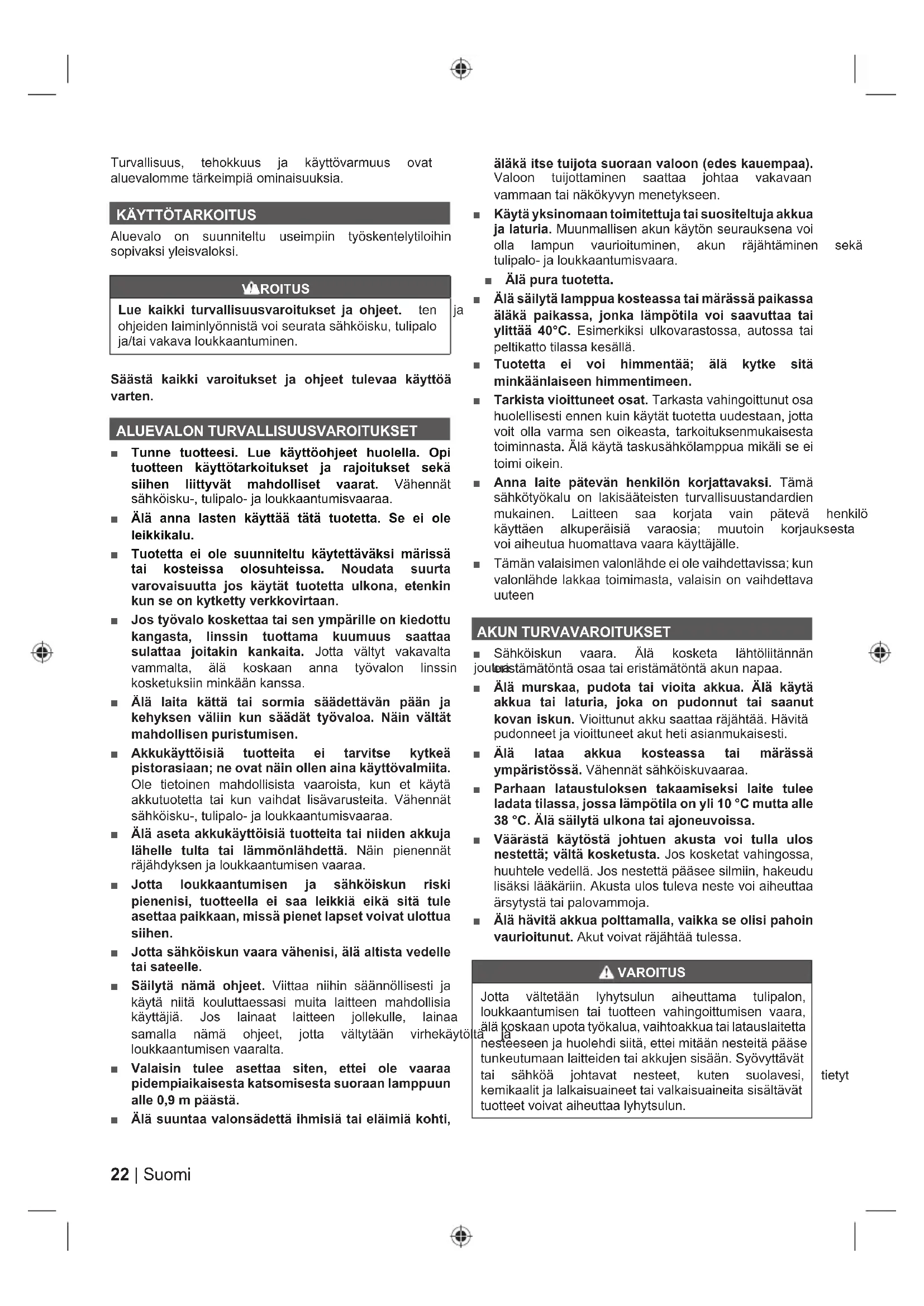 Aluevalo on suunniteltu useimpiin työskentelytiloihin sopivaksi yleisvaloksi. VAROITUS Lue kaikki turvallisuusvaroitukset ja ohjeet. WHQ MD RKMHLGHQODLPLQO\|QQLVWlYRLVHXUDWDVlKN|LVNXWXOLSDOR MDWDLYDNDYDORXNNDDQWXPLQHQ Säästä kaikki varoitukset ja ohjeet tulevaa käyttöä varten. ALUEVALON TURVALLISUUSVAROITUKSET Ŷ Tunne tuotteesi. Lue käyttöohjeet huolella. Opi tuotteen käyttötarkoitukset ja rajoitukset sekä siihen liittyvät mahdolliset vaarat. Vähennät VlKN|LVNXWXOLSDORMDORXNNDDQWXPLVYDDUDD Ŷ Älä anna lasten käyttää tätä tuotetta. Se ei ole leikkikalu. Ŷ Tuotetta ei ole suunniteltu käytettäväksi märissä tai kosteissa olosuhteissa. Noudata suurta varovaisuutta jos käytät tuotetta ulkona, etenkin kun se on kytketty verkkovirtaan. Ŷ Jos työvalo koskettaa tai sen ympärille on kiedottu kangasta, linssin tuottama kuumuus saattaa sulattaa joitakin kankaita. Jotta vältyt vakavalta YDPPDOWD lOl NRVNDDQ DQQD W\|YDORQ OLQVVLQ MRXWXD kosketuksiin minkään kanssa. Ŷ Älä laita kättä tai sormia säädettävän pään ja kehyksen väliin kun säädät työvaloa. Näin vältät mahdollisen puristumisen. Ŷ Akkukäyttöisiä tuotteita ei tarvitse kytkeä pistorasiaan; ne ovat näin ollen aina käyttövalmiita. Ole tietoinen mahdollisista vaaroista, kun et käytä akkutuotetta tai kun vaihdat lisävarusteita. Vähennät VlKN|LVNXWXOLSDORMDORXNNDDQWXPLVYDDUDD Ŷ Älä aseta akkukäyttöisiä tuotteita tai niiden akkuja lähelle tulta tai lämmönlähdettä. Näin pienennät UlMlKG\NVHQMDORXNNDDQWXPLVHQYDDUDD Ŷ Jotta loukkaantumisen ja sähköiskun riski pienenisi, tuotteella ei saa leikkiä eikä sitä tule asettaa paikkaan, missä pienet lapset voivat ulottua siihen. Ŷ Jotta sähköiskun vaara vähenisi, älä altista vedelle tai sateelle. Ŷ Säilytä nämä ohjeet. 9LLWWDD QLLKLQ VllQQ|OOLVHVWL MD käytä niitä kouluttaessasi muita laitteen mahdollisia Nl\WWlMLl -RV ODLQDDW ODLWWHHQ MROOHNXOOH ODLQDD VDPDOOD QlPl RKMHHW MRWWD YlOW\WllQ YLUKHNl\W|OWl MD loukkaantumisen vaaralta. Ŷ Valaisin tulee asettaa siten, ettei ole vaaraa pidempiaikaisesta katsomisesta suoraan lamppuun alle 0,9 m päästä. Ŷ Älä suuntaa valonsädettä ihmisiä tai eläimiä kohti, äläkä itse tuijota suoraan valoon (edes kauempaa).