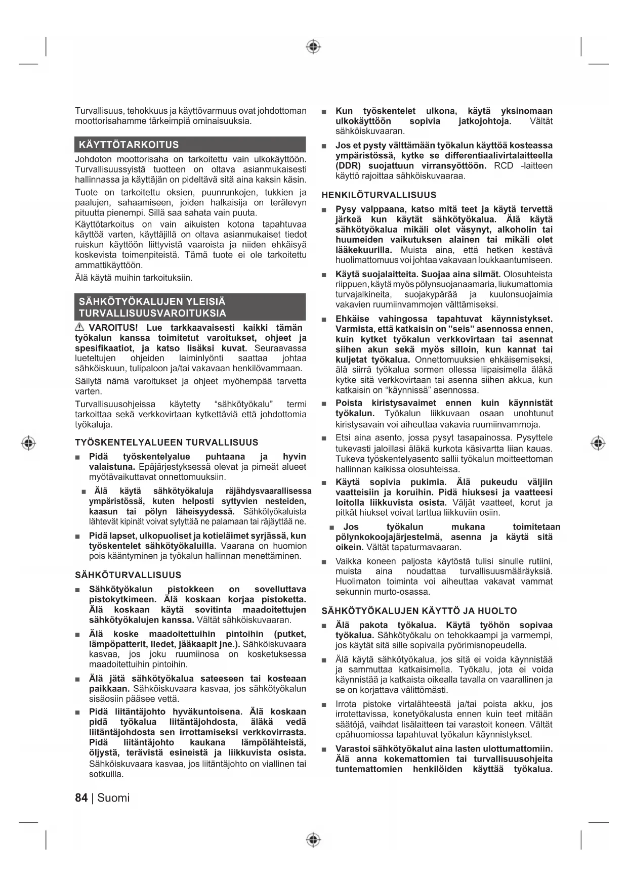 ■ Sähkötyökalun pistokkeen on sovelluttava pistokytkimeen. Älä koskaan korjaa pistoketta. Älä koskaan käytä sovitinta maadoitettujen sähkötyökalujen kanssa. Vältät sähköiskuvaaran. ■ Älä koske maadoitettuihin pintoihin (putket, lämpöpatterit, liedet, jääkaapit jne.). Sähköiskuvaara kasvaa, jos joku ruumiinosa on kosketuksessa maadoitettuihin pintoihin. ■ Älä jätä sähkötyökalua sateeseen tai kosteaan paikkaan. Sähköiskuvaara kasvaa, jos sähkötyökalun sisäosiin pääsee vettä. ■ Pidä liitäntäjohto hyväkuntoisena. Älä koskaan pidä työkalua liitäntäjohdosta, äläkä vedä liitäntäjohdosta sen irrottamiseksi verkkovirrasta. Pidä liitäntäjohto kaukana lämpölähteistä, öljystä, terävistä esineistä ja liikkuvista osista. Sähköiskuvaara kasvaa, jos liitäntäjohto on viallinen tai sotkuilla. ■ Kun työskentelet ulkona, käytä yksinomaan ulkokäyttöön sopivia jatkojohtoja. Vältät sähköiskuvaaran. ■ Jos et pysty välttämään työkalun käyttöä kosteassa ympäristössä, kytke se differentiaalivirtalaitteella (DDR) suojattuun virransyöttöön. RCD -laitteen käyttö rajoittaa sähköiskuvaaraa. HENKILÖTURVALLISUUS ■ Pysy valppaana, katso mitä teet ja käytä tervettä järkeä kun käytät sähkötyökalua. Älä käytä sähkötyökalua mikäli olet väsynyt, alkoholin tai huumeiden vaikutuksen alainen tai mikäli olet lääkekuurilla. Muista aina, että hetken kestävä huolimattomuus voi johtaa vakavaan loukkaantumiseen. ■ Käytä suojalaitteita. Suojaa aina silmät. Olosuhteista riippuen, käytä myös pölynsuojanaamaria, liukumattomia turvajalkineita, suojakypärää ja kuulonsuojaimia vakavien ruumiinvammojen välttämiseksi. ■ Ehkäise vahingossa tapahtuvat käynnistykset. Varmista, että katkaisin on ”seis” asennossa ennen, kuin kytket työkalun verkkovirtaan tai asennat siihen akun sekä myös silloin, kun kannat tai kuljetat työkalua. Onnettomuuksien ehkäisemiseksi, älä siirrä työkalua sormen ollessa liipaisimella äläkä kytke sitä verkkovirtaan tai asenna siihen akkua, kun katkaisin on “käynnissä” asennossa. ■ Poista kiristysavaimet ennen kuin käynnistät työkalun. Työkalun liikkuvaan osaan unohtunut kiristysavain voi aiheuttaa vakavia ruumiinvammoja. ■ Etsi aina asento, jossa pysyt tasapainossa. Pysyttele tukevasti jaloillasi äläkä kurkota käsivartta liian kauas. Tukeva työskentelyasento sallii työkalun moitteettoman hallinnan kaikissa olosuhteissa. ■ Käytä sopivia pukimia. Älä pukeudu väljiin vaatteisiin ja koruihin. Pidä hiuksesi ja vaatteesi loitolla liikkuvista osista. Väljät vaatteet, korut ja pitkät hiukset voivat tarttua liikkuviin osiin. ■ Jos työkalun mukana toimitetaan pölynkokoojajärjestelmä, asenna ja käytä sitä oikein. Vältät tapaturmavaaran. ■ Vaikka koneen paljosta käytöstä tulisi sinulle rutiini, muista aina noudattaa turvallisuusmääräyksiä. Huolimaton toiminta voi aiheuttaa vakavat vammat sekunnin murto-osassa. SÄHKÖTYÖKALUJEN KÄYTTÖ JA HUOLTO ■ Älä pakota työkalua. Käytä työhön sopivaa työkalua. Sähkötyökalu on tehokkaampi ja varmempi, jos käytät sitä sille sopivalla pyörimisnopeudella. ■ Älä käytä sähkötyökalua, jos sitä ei voida käynnistää ja sammuttaa katkaisimella. Työkalu, jota ei voida käynnistää ja katkaista oikealla tavalla on vaarallinen ja se on korjattava välittömästi. ■ Irrota pistoke virtalähteestä ja/tai poista akku, jos irrotettavissa, konetyökalusta ennen kuin teet mitään säätöjä, vaihdat lisälaitteen tai varastoit koneen. Vältät epähuomiossa tapahtuvat työkalun käynnistykset. ■ Varastoi sähkötyökalut aina lasten ulottumattomiin. Älä anna kokemattomien tai turvallisuusohjeita tuntemattomien henkilöiden käyttää työkalua. 84 | SuomiSähkötyökalut ovat vaarallisia kokemattomien henkilöiden käsissä. ■ Konetyökalun ja lisälaitteiden huolto. Tarkista liikkuvien osien kohtisuoruus. Tarkista, ettei yksikään osa ole rikkoutunut. Tarkista asennus ja kaikki osat, jotka voivat vaikuttaa haitallisesti työkalun toimintaan. Mikäli viallisia osia on, korjauta työkalu ennen sen käyttöä. Onnettomuuksien aiheuttajana on usein työkalun huolimaton kunnossapito. ■ Pidä työkalut puhtaina ja terävinä. Kiinni tarttuminen on harvinaisempaa ja hallinnan säilyttäminen helpompaa, kun leikkuutyökalu on hyvin teroitettu ja puhdas. ■ Käytä sähkötyökalua, sen varusteita, teriä jne. näiden käyttöohjeiden mukaisesti ja huomioi käyttöolosuhteet sekä toivotut käyttötarkoitukset. Vaarallisten tilanteiden ehkäisemiseksi, älä käytä työkalua muuhun, kuin sille tarkoitettuun työhön. ■ Pidä kädensijat ja tarttumapinnat kuivina ja puhtaina öljy- ja rasvatahroista sekä muusta liasta. Liukkaat kädensijat ja tarttumapinnat vaarantavat koneen turvallisen käsittelyn ja ohjaamisen yllättävissä tilanteissa.