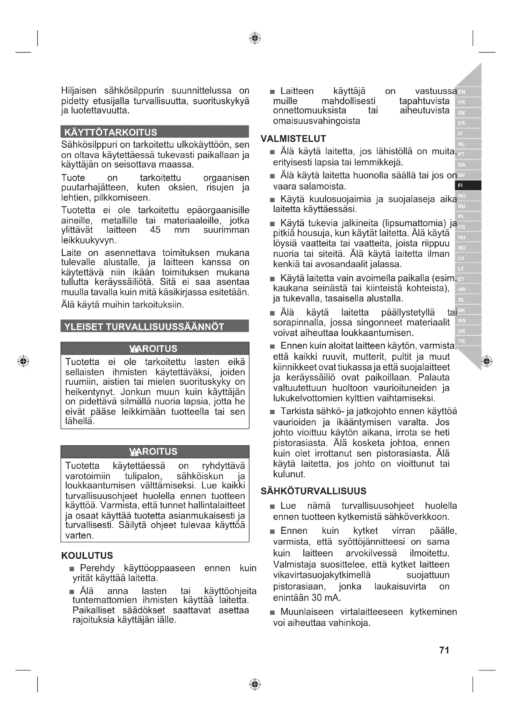 VAROITUS Tuotetta ei ole tarkoitettu lasten eikä sellaisten ihmisten käytettäväksi, joiden ruumiin, aistien tai mielen suorituskyky on heikentynyt. Jonkun muun kuin käyttäjän on pidettävä silmällä nuoria lapsia, jotta he eivät pääse leikkimään tuotteella tai sen lähellä. VAROITUS Tuotetta käytettäessä on ryhdyttävä varotoimiin tulipalon, sähköiskun ja loukkaantumisen välttämiseksi. Lue kaikki turvallisuusohjeet huolella ennen tuotteen käyttöä. Varmista, että tunnet hallintalaitteet ja osaat käyttää tuotetta asianmukaisesti ja turvallisesti. Säilytä ohjeet tulevaa käyttöä varten. KOULUTUS ■ Perehdy käyttöoppaaseen ennen kuin yrität käyttää laitetta. ■ Älä anna lasten tai käyttöohjeita tuntemattomien ihmisten käyttää laitetta. Paikalliset säädökset saattavat asettaa rajoituksia käyttäjän iälle. ■ Laitteen käyttäjä on vastuussa muille mahdollisesti tapahtuvista onnettomuuksista tai aiheutuvista omaisuusvahingoista VALMISTELUT ■ Älä käytä laitetta, jos lähistöllä on muita, erityisesti lapsia tai lemmikkejä. ■ Älä käytä laitetta huonolla säällä tai jos on vaara salamoista. ■ Käytä kuulosuojaimia ja suojalaseja aika laitetta käyttäessäsi. ■ Käytä tukevia jalkineita (lipsumattomia) ja pitkiä housuja, kun käytät laitetta. Älä käytä löysiä vaatteita tai vaatteita, joista riippuu nuoria tai siteitä. Älä käytä laitetta ilman kenkiä tai avosandaalit jalassa. ■ Käytä laitetta vain avoimella paikalla (esim. kaukana seinästä tai kiinteistä kohteista), ja tukevalla, tasaisella alustalla. ■ Älä käytä laitetta päällystetyllä tai sorapinnalla, jossa singonneet materiaalit voivat aiheuttaa loukkaantumisen. ■ Ennen kuin aloitat laitteen käytön, varmista, että kaikki ruuvit, mutterit, pultit ja muut kiinnikkeet ovat tiukassa ja että suojalaitteet ja keräyssäiliö ovat paikoillaan. Palauta valtuutettuun huoltoon vaurioituneiden ja lukukelvottomien kylttien vaihtamiseksi. ■ Tarkista sähkö- ja jatkojohto ennen käyttöä vaurioiden ja ikääntymisen varalta. Jos johto vioittuu käytön aikana, irrota se heti pistorasiasta. Älä kosketa johtoa, ennen kuin olet irrottanut sen pistorasiasta. Älä käytä laitetta, jos johto on vioittunut tai kulunut.