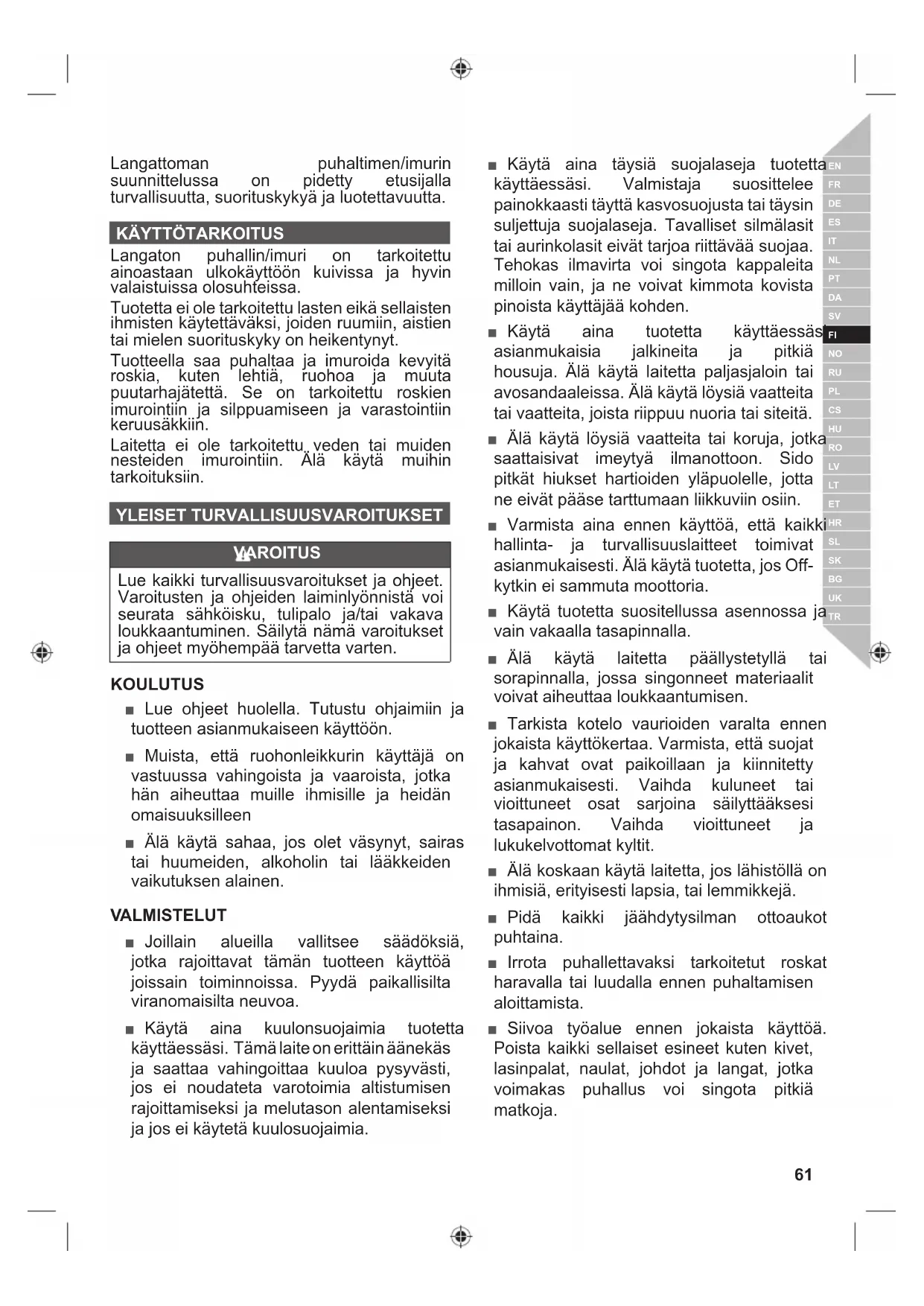 Kaikki ohjeet on luettava ja ymmärrettävä ennen tuotteen käyttöä. Noudata varoituksia ja turvallisuusohjeita. Varo sinkoutuneita ja muita lentäviä esineitä. Pidä kaikki sivulliset vähintään 15 metrin päässä toiminta-alueelta – erityisesti lapset ja lemmikit. Pyörivät puhaltimet Pidä kädet ja jalat poissa aukoista tuotteen käydessä. Käytä kuulosuojaimia66 | Suomi Käytä silmäsuojaimia Älä altista konetta sateelle tai kosteudelle.