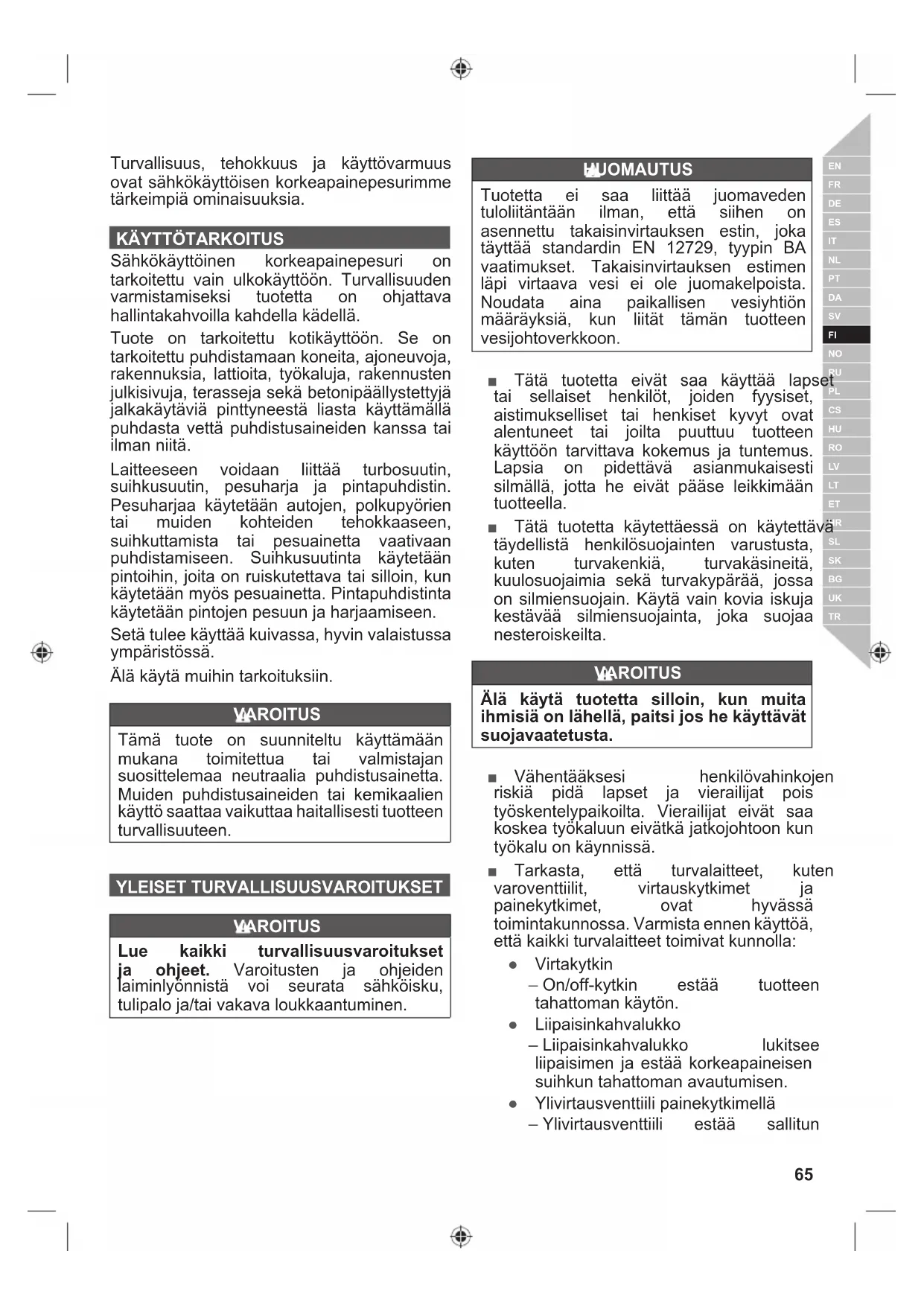 Sähkökäyttöinen korkeapainepesuri on tarkoitettu vain ulkokäyttöön. Turvallisuuden varmistamiseksi tuotetta on ohjattava hallintakahvoilla kahdella kädellä. Tuote on tarkoitettu kotikäyttöön. Se on tarkoitettu puhdistamaan koneita, ajoneuvoja, rakennuksia, lattioita, työkaluja, rakennusten julkisivuja, terasseja sekä betonipäällystettyjä jalkakäytäviä pinttyneestä liasta käyttämällä puhdasta vettä puhdistusaineiden kanssa tai ilman niitä. Laitteeseen voidaan liittää turbosuutin, suihkusuutin, pesuharja ja pintapuhdistin. Pesuharjaa käytetään autojen, polkupyörien tai muiden kohteiden tehokkaaseen, suihkuttamista tai pesuainetta vaativaan puhdistamiseen. Suihkusuutinta käytetään pintoihin, joita on ruiskutettava tai silloin, kun käytetään myös pesuainetta. Pintapuhdistinta käytetään pintojen pesuun ja harjaamiseen. Setä tulee käyttää kuivassa, hyvin valaistussa ympäristössä. Älä käytä muihin tarkoituksiin. VAROITUS Tämä tuote on suunniteltu käyttämään mukana toimitettua tai valmistajan suosittelemaa neutraalia puhdistusainetta. Muiden puhdistusaineiden tai kemikaalien käyttö saattaa vaikuttaa haitallisesti tuotteen turvallisuuteen. YLEISET TURVALLISUUSVAROITUKSET VAROITUS Lue kaikki turvallisuusvaroitukset ja ohjeet. Varoitusten ja ohjeiden laiminlyönnistä voi seurata sähköisku, tulipalo ja/tai vakava loukkaantuminen. HUOMAUTUS Tuotetta ei saa liittää juomaveden tuloliitäntään ilman, että siihen on asennettu takaisinvirtauksen estin, joka täyttää standardin EN 12729, tyypin BA vaatimukset. Takaisinvirtauksen estimen läpi virtaava vesi ei ole juomakelpoista. Noudata aina paikallisen vesiyhtiön määräyksiä, kun liität tämän tuotteen vesijohtoverkkoon. ■ Tätä tuotetta eivät saa käyttää lapset tai sellaiset henkilöt, joiden fyysiset, aistimukselliset tai henkiset kyvyt ovat alentuneet tai joilta puuttuu tuotteen käyttöön tarvittava kokemus ja tuntemus. Lapsia on pidettävä asianmukaisesti silmällä, jotta he eivät pääse leikkimään tuotteella. ■ Tätä tuotetta käytettäessä on käytettävä täydellistä henkilösuojainten varustusta, kuten turvakenkiä, turvakäsineitä, kuulosuojaimia sekä turvakypärää, jossa on silmiensuojain. Käytä vain kovia iskuja kestävää silmiensuojainta, joka suojaa nesteroiskeilta. VAROITUS Älä käytä tuotetta silloin, kun muita ihmisiä on lähellä, paitsi jos he käyttävät suojavaatetusta. ■ Vähentääksesi henkilövahinkojen riskiä pidä lapset ja vierailijat pois työskentelypaikoilta. Vierailijat eivät saa koskea työkaluun eivätkä jatkojohtoon kun työkalu on käynnissä. ■ Tarkasta, että turvalaitteet, kuten varoventtiilit, virtauskytkimet ja painekytkimet, ovat hyvässä toimintakunnossa. Varmista ennen käyttöä, että kaikki turvalaitteet toimivat kunnolla: ● Virtakytkin – On/off-kytkin estää tuotteen tahattoman käytön. ● Liipaisinkahvalukko – Liipaisinkahvalukko lukitsee liipaisimen ja estää korkeapaineisen suihkun tahattoman avautumisen. ● Ylivirtausventtiili painekytkimellä – Ylivirtausventtiili estää sallitun66 | Suomi työpaineen ylityksen. Jos liipaisinpistoolin vipu vapautetaan, painekytkin sammuttaa pumpun, jolloin korkeapaineinen suihku lakkaa. Jos vipua vedetään, pumppu käynnistyy taas. ● Ylivirtasuoja – Lämpöanturi suojaa laitetta ylikuormitukselta. Jos laite ylikuumenee, virta katkeaa automaattisesti. ■ Älä käytä tuotetta, jos sen tärkeät osat, kuten turvalaitteet, korkeapaineletkut tai liipaisinpistooli, ovat vahingoittuneet. ■ Noudata varovaisuutta, kun käytät liipaisinta. Pidä kahvasta tukevasti kiinni molemmin käsin, jotta voit välttää loukkaantumisen, kun kahva iskee takaisin. VAROITUS Korkeapainepesureiden käytön aikana saattaa muodostua aerosoleja. Aerosolien hengittäminen voi olla terveydelle haitallista. VAROITUS Käyttökohteesta riippuen korkeapainepesussa voidaan käyttää suojattuja suuttimia, mikä vähentää vesipitoisten aerosolien päästöjä. Tällaista varustetta ei voida kuitenkaan käyttää kaikissa käyttökohteissa. Jos suojattuja suuttimia ei voida käyttää suojauskeinona aerosoleja vastaan, FFP 2 -luokan hengitysnaamari tai muu vastaava saattaa olla tarpeen puhdistusympäristön mukaan. ■ Sammuta tuote aina, kun jätät sen yksin. ■ Korkeapainesuihku on väärin käytettynä vaarallinen. Älä kohdista suihkua ihmisiä tai jännitteen alaisia sähkölaitteita kohti tai itse tuotteeseen. ■ Jotta voit välttää räjähdyksen, älä ruiskuta syttyviä nesteitä. ■ Älä suuntaa pesuria itseäsi tai muita ihmisiä kohti, kun puhdistat vaatteita tai jalkineita. ■ Älä käytä tuotetta sähkölaitteiden, vaatteiden tai jalkineiden puhdistamiseen. ■ Korkeapaineletkut, kiinnittimet ja liittimet ovat tärkeitä tuotteen turvallisuudelle. Käytä vain valmistajan suosittelemia letkuja, kiinnittimiä ja liittimiä.