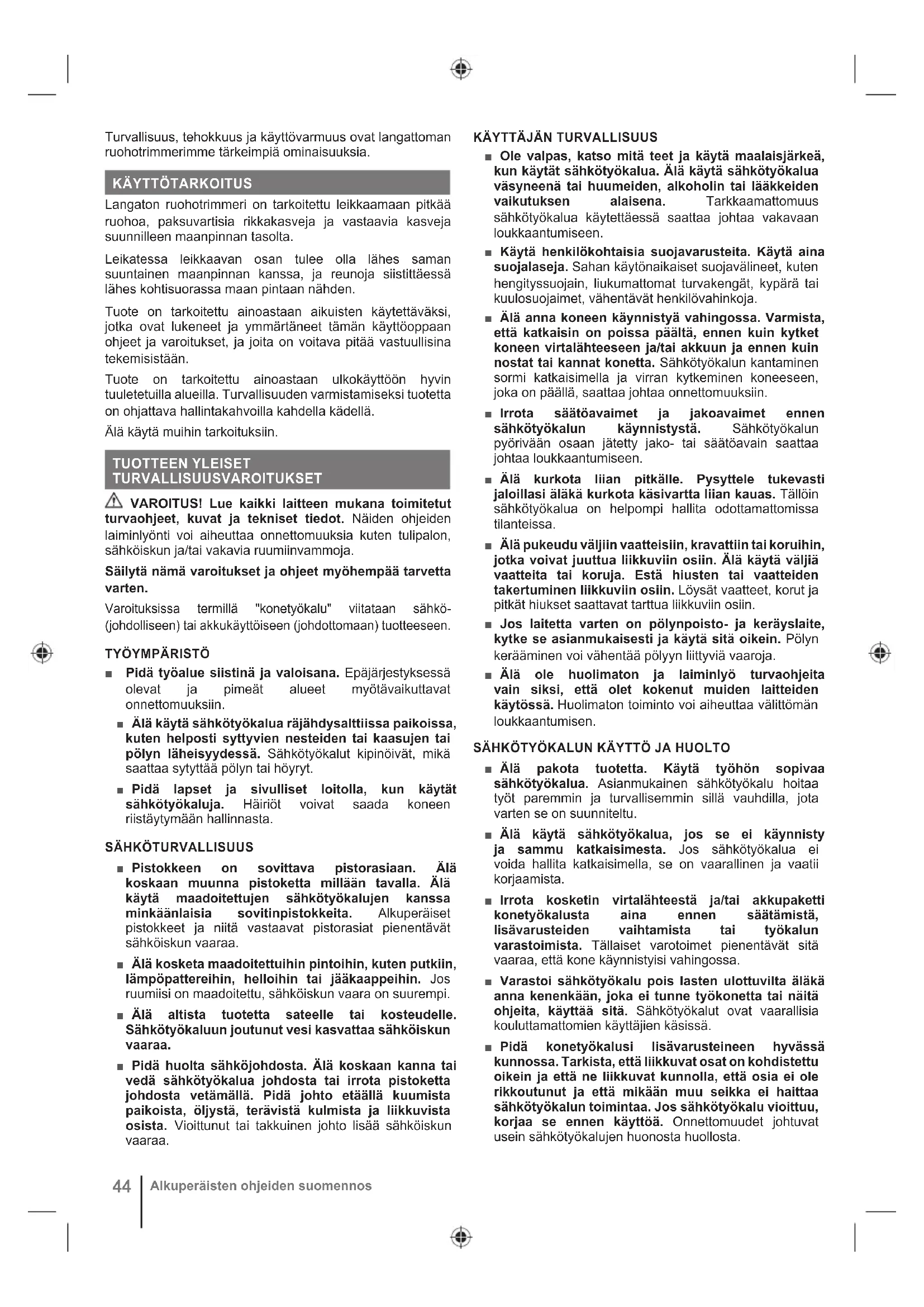 ■ Pidä leikkuutyökalut terävinä ja puhtaina. Asianmukaisesti huolletut leikkuutyökalut, joiden leikkuupinnat ovat teräviä, eivät jumiudu helposti ja niitä on helppo hallita. ■ Käytä työkonetta, lisävarusteita, teriä jne. näiden ohjeiden mukaisesti, ja huomioi työolosuhteet ja tehtävän työn laatu. Työkoneen käyttö muuhun kuin sille tarkoitettuun työhön voi aiheuttaa vaarallisia tilanteita. ■ Pidä kädensijat ja tartuntapinnat kuivina ja puhtaina liasta, öljystä ja rasvasta. Liukkaat kahvat ja tartuntapinnat tekevät käytöstä vaarallista, eikä laitetta voi hallita odottamattomissa tilanteissa. AKKUKÄYTTÖISEN TYÖKALUN KÄYTTÖ JA HOITO ■ Käytä lataukseen ainoastaan valmistajan suosittelemaa laturia. Yhden tyyppiselle akulle sopivan laturin käyttö toisenlaisen akun kanssa voi olla vaarallista. ■ Käytä sähkötyökalua ainoastaan sitä varten suunniteltujen akkujen kanssa. Muiden akkujen käyttö voi johtaa loukkaantumiseen ja tulipaloon. ■ Kun akkua ei käytetä, pidä se erillään metalliesineistä, kuten paperiliittimistä, kolikoista, avaimista, nauloista, ruuveista ja muista pienistä metalliesineistä, jotka voivat yhdistää akun navat. Akun napojen oikosulkeminen voi aiheuttaa palovammoja ja tulipalon. ■ Jos akkua käsitellään väärin, siitä voi vuotaa nestettä; älä kosketa sitä. Jos kosketat sitä vahingossa, huuhtele se vedellä. Jos nestettä pääsee silmiin, hakeudu välittömästi lääkärin hoitoon. Akusta vuotanut neste voi ärsyttää ihoa ja aiheuttaa palovammoja. ■ Vaurioitunutta tai muunneltua akkua tai työkalua ei saa käyttää. Vaurioituneet tai muunnellut akut voivat käyttäytyä odottamattomasti, ja ne voivat johtaa tulipaloon, räjähdykseen, vaaraan tai tapaturmaan. ■ Älä altista akkua tai työkalua tulelle tai liian korkealle lämpötilalle. Tulelle tai yli 130 °C:n lämpötilalle altistuminen voi johtaa räjähdykseen. ■ Noudata kaikkia latausohjeita äläkä lataa akkua tai työkalua muissa kuin ohjeissa määritellyissä lämpötilaolosuhteissa. Virheellinen lataus tai määritellyistä poikkeavat lämpötilat saattavat johtaa akun vaurioitumiseen ja lisätä tulipalon vaaraa. HUOLTO ■ Huollata työkone pätevällä huoltomiehellä, joka käyttää ainoastaan asianmukaisia varaosia. Tämä varmistaa, että sähkötyökalu on turvallinen. ■ Vaurioituneita akkuja ei koskaan saa huoltaa. Akkuja saa huoltaa vain valmistaja tai valtuutettu huoltoliike. RUOHOTRIMMERIN TURVALLISUUSVAROITUKSET ■ Älä käytä laitetta huonolla säällä, varsinkaan, jos on vaaraa salamoinnista. Tämä pienentää riskiä salamaniskun kohteeksi joutumisesta. ■ Tarkasta laitteen käyttöalue huolellisesti villieläinten varalta. Laite voi vahingoittaa villieläimiä käytön aikana. ■ Tarkasta perusteellisesti alue, jolla laitetta käytetään, ja poista sieltä kaikki vierasesineet, kuten kivet, kepit, johdot, luut jne. Sinkoutuvat esineet voivat aiheuttaa henkilövahingon. ■ Tarkista aina ennen laitteen käyttöä silmämääräisesti, että leikkuri ja leikkurikokoonpano eivät ole vahingoittuneet. Vaurioituneet osat lisäävät loukkaantumisvaaraa. ■ Pidä suojukset paikoillaan. Suojusten on oltava toimintakunnossa ja asennettu oikein. Löysä, vahingoittunut tai virheellisesti toimiva suojus voi johtaa henkilövahinkoon. ■ Pidä kaikki jäähdytysilman ottoaukot puhtaina. Tukkeutuneet ilmantuloaukot ja roskat voivat aiheuttaa ylikuumenemista ja tulipalon vaaran. ■ Käytä suojalaseja ja kuulosuojaimia. Riittävät suojavarusteet vähentävät henkilövahinkoja. ■ Käytä aina laitetta käyttäessäsi lipsumattomia jalkineita ja suojakenkiä. Älä käytä laitetta paljasjaloin tai avosandaaleissa. Tämä vähentää jalkojen loukkaantumisvaaraa, jos ne joutuvat kosketuksiin liikkuvan leikkurin kanssa. ■ Käytä aina housuja, jotka peittävät käyttäjän jalat laitteen käytön aikana. Liikkuvaan leikkuriin tai siimaan koskeminen voi aiheuttaa loukkaantumisen. ■ Pidä sivulliset loitolla laitteesta työskentelyn aikana. Sinkoutuvat roskat voivat aiheuttaa vakavan henkilövamman. ■ Älä käytä laitetta vyötärön korkeuden yläpuolella. Tämä auttaa estämään tahattoman kosketuksen leikkuriin ja mahdollistaa laitteen paremman hallinnan odottamattomissa tilanteissa. ■ Ole varovainen, kun käytät laitetta märällä ruoholla. Kävele, älä koskaan juokse. Tämä vähentää liukastumisen ja kaatumisen vaaraa; tällaisesta vaarasta voi seurata henkilövahinko. ■ Älä käytä laitetta liian jyrkissä rinteissä. Tämä vähentää hallinnan menettämisen, liukastumisen ja putoamisen vaaraa; tällaisesta vaarasta voi seurata henkilövahinko. ■ Kun työskentelet rinteissä, seiso aina tukevasti, etene rinteessä aina poikittain, ei koskaan ylös ja alas, ja ole erittäin varovainen, kun vaihdat suuntaa. Tämä vähentää hallinnan menettämisen, liukastumisen ja putoamisen vaaraa; tällaisesta vaarasta voi seurata henkilövahinko. ■ Pidä kaikki virtajohdot ja kaapelit kaukana leikkuualueelta. Virtajohdot tai -kaapelit voivat olla piilossa pensasaidassa tai pensaissa, jolloin siima tai terä voi vahingossa leikata niitä. ■ Pidä kaikki kehonosat loitolla leikkurista ja siimasta. Älä poista materiaalia laitteesta, ennen kuin se on irrotettu virtalähteestä. Leikkurin liikkuva leikkuri tai siima voi johtaa vakavaan henkilövahinkoon. ■ Kuljeta laitetta siten, että laite on pois päältä ja irti vartalostasi. Laitteen asianmukainen käsittely vähentää tahattoman kosketuksen mahdollisuutta liikkuvaan trimmeriin, leikkuriin ja siimaan. ■ Käytä vain valmistajan määrittämiä vaihtoleikkuupäiitä, trimmerileikkureita ja siimoja. Älä vaihda leikkureita tai siimoja metallijohtoihin tai -teriin. Virheelliset varaosat voivat aiheuttaa hallinnan menetyksen, rikkoutumisen ja loukkaantumisen.46 Alkuperäisten ohjeiden suomennos MUITA TURVALLISUUSVAROITUKSIA ■ Tar