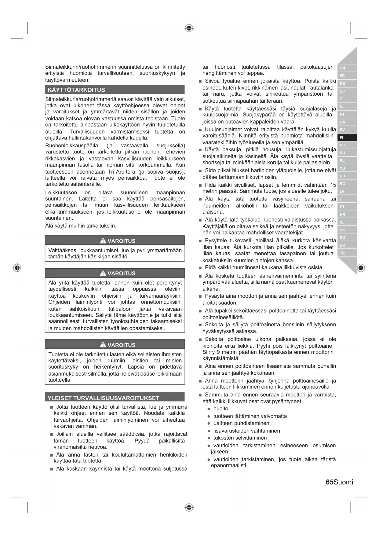 Varoitus Lue ja ymmärrä kaikki ohjeet ennen tuotteen käyttöä ja noudata kaikkia varoituksia ja turvallisuusohjeita. Käytä suojalaseja, kuulosuojaimia ja kypärää Käytä tätä tuotetta käyttäessäsi luisumattomia turvajalkineita. Käytä luisumattomia raskaan käytön käsineitä. Varo sinkoutuneita ja muita lentäviä esineitä. Pidä kaikki sivulliset vähintään 15 metrin päässä toiminta-alueelta – erityisesti lapset ja lemmikit. Tätä tuotetta ei ole tarkoitettu käytettä- väksi hammastetun terän kanssa. Vähennä loukkaantumisen ja rikkoutumisen riskiä olemalla koskettamatta mitään kuumaa pintaa. Pidä kädet kaukana teristä. Taattu äänenteho Käyntiasento Aseta rikastinvipu asentoon "FULL". Aseta rikastinvipu asentoon "HALF". Odotusaika 10 sekuntia RIKASTUS Paina pumppauspalloa 10 kertaa. Vedä käynnistysköyttä Käynnistä laite/käytä laitetta puristamalla kaasuliipaisinta. Lukitse kaasu paikoilleen painamalla kaasuttimen interlock-painiketta. Käytä lyijytöntä autoille tarkoitettua, vähintään 91 ([R+M]/2) oktaanin bensiiniä. Käytä ilmajäähdytteisissä moottoreissa kaksitahtiöljyä. Sekoita polttoaine huolella ja aina ennen tankkausta. Kylmän moottorin käynnistys käsin Kuuman moottorin käynnistys käsin Kylmän moottorin käynnistys sähkökäynnistimellä Kuuman moottorin käynnistys sähkökäynnistimellä Suora akseli -symboli: Kun siimakelaa kiinnitetään leikkuriin, käyttäjän on nähtävä tämä symboli. Tri-Arc-terä sopii tälle laitteelle ja soveltuu rehevien rikkaruohojen ja viiniköynnöksen leikkaamiseen. Varo terän iskua Leikkuulaitteen akselin kiertosuunta ja maksiminopeus. Vedä Pikavapautuskieleke Tämä työkalu on sen EU-maan kaikkien sääntömääräisten standardien mukainen, josta se on ostettu. EurAsian-vaatimustenmukaisuusmerkki Ukrainalainen säädöstenmukaisuusmerkintä Seuraavat signaalisanat ja merkitykset on tarkoitettu selittämään tähän tuotteeseen liittyviä riskin tasoja. VAARA Ilmaisee välitöntä vaaratilannetta, joka ellei sitä vältetä, johtaa kuolemaan tai vakavaan loukkaantumiseen. VAROITUS Ilmaisee potentiaalisen vaaratilanteen, joka ellei71 Suomi |