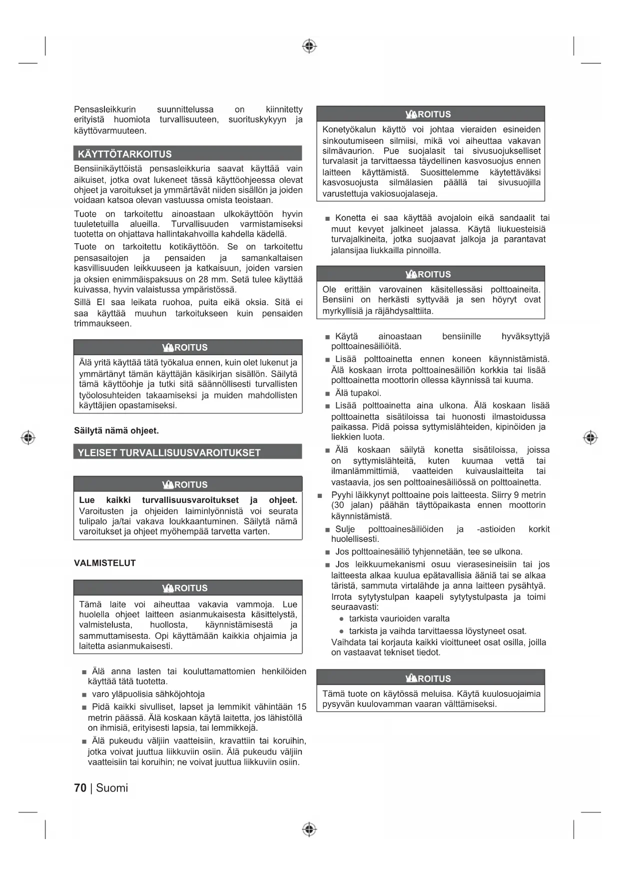 Bensiinikäyttöistä pensasleikkuria saavat käyttää vain aikuiset, jotka ovat lukeneet tässä käyttöohjeessa olevat ohjeet ja varoitukset ja ymmärtävät niiden sisällön ja joiden voidaan katsoa olevan vastuussa omista teoistaan. Tuote on tarkoitettu ainoastaan ulkokäyttöön hyvin tuuletetuilla alueilla. Turvallisuuden varmistamiseksi tuotetta on ohjattava hallintakahvoilla kahdella kädellä. Tuote on tarkoitettu kotikäyttöön. Se on tarkoitettu pensasaitojen ja pensaiden ja samankaltaisen kasvillisuuden leikkuuseen ja katkaisuun, joiden varsien ja oksien enimmäispaksuus on 28 mm. Setä tulee käyttää kuivassa, hyvin valaistussa ympäristössä. Sillä EI saa leikata ruohoa, puita eikä oksia. Sitä ei saa käyttää muuhun tarkoitukseen kuin pensaiden trimmaukseen. VAROITUS Älä yritä käyttää tätä työkalua ennen, kuin olet lukenut ja ymmärtänyt tämän käyttäjän käsikirjan sisällön. Säilytä tämä käyttöohje ja tutki sitä säännöllisesti turvallisten työolosuhteiden takaamiseksi ja muiden mahdollisten käyttäjien opastamiseksi. Säilytä nämä ohjeet. YLEISET TURVALLISUUSVAROITUKSET VAROITUS Lue kaikki turvallisuusvaroitukset ja ohjeet. Varoitusten ja ohjeiden laiminlyönnistä voi seurata tulipalo ja/tai vakava loukkaantuminen. Säilytä nämä varoitukset ja ohjeet myöhempää tarvetta varten. VALMISTELUT VAROITUS Tämä laite voi aiheuttaa vakavia vammoja. Lue huolella ohjeet laitteen asianmukaisesta käsittelystä, valmistelusta, huollosta, käynnistämisestä ja sammuttamisesta. Opi käyttämään kaikkia ohjaimia ja laitetta asianmukaisesti. ■ Älä anna lasten tai kouluttamattomien henkilöiden käyttää tätä tuotetta. ■ varo yläpuolisia sähköjohtoja ■ Pidä kaikki sivulliset, lapset ja lemmikit vähintään 15 metrin päässä. Älä koskaan käytä laitetta, jos lähistöllä on ihmisiä, erityisesti lapsia, tai lemmikkejä. ■ Älä pukeudu väljiin vaatteisiin, kravattiin tai koruihin, jotka voivat juuttua liikkuviin osiin. Älä pukeudu väljiin vaatteisiin tai koruihin; ne voivat juuttua liikkuviin osiin. VAROITUS Konetyökalun käyttö voi johtaa vieraiden esineiden sinkoutumiseen silmiisi, mikä voi aiheuttaa vakavan silmävaurion. Pue suojalasit tai sivusuojukselliset turvalasit ja tarvittaessa täydellinen kasvosuojus ennen laitteen käyttämistä. Suosittelemme käytettäväksi kasvosuojusta silmälasien päällä tai sivusuojilla varustettuja vakiosuojalaseja. ■ Konetta ei saa käyttää avojaloin eikä sandaalit tai muut kevyet jalkineet jalassa. Käytä liukuesteisiä turvajalkineita, jotka suojaavat jalkoja ja parantavat jalansijaa liukkailla pinnoilla. VAROITUS Ole erittäin varovainen käsitellessäsi polttoaineita. Bensiini on herkästi syttyvää ja sen höyryt ovat myrkyllisiä ja räjähdysalttiita. ■ Käytä ainoastaan bensiinille hyväksyttyjä polttoainesäiliöitä. ■ Lisää polttoainetta ennen koneen käynnistämistä. Älä koskaan irrota polttoainesäiliön korkkia tai lisää polttoainetta moottorin ollessa käynnissä tai kuuma. ■ Älä tupakoi. ■ Lisää polttoainetta aina ulkona. Älä koskaan lisää polttoainetta sisätiloissa tai huonosti ilmastoidussa paikassa. Pidä poissa syttymislähteiden, kipinöiden ja liekkien luota. ■ Älä koskaan säilytä konetta sisätiloissa, joissa on syttymislähteitä, kuten kuumaa vettä tai ilmanlämmittimiä, vaatteiden kuivauslaitteita tai vastaavia, jos sen polttoainesäiliössä on polttoainetta. ■ Pyyhi läikkynyt polttoaine pois laitteesta. Siirry 9 metrin (30 jalan) päähän täyttöpaikasta ennen moottorin käynnistämistä. ■ Sulje polttoainesäiliöiden ja -astioiden korkit huolellisesti. ■ Jos polttoainesäiliö tyhjennetään, tee se ulkona. ■ Jos leikkuumekanismi osuu vierasesineisiin tai jos laitteesta alkaa kuulua epätavallisia ääniä tai se alkaa täristä, sammuta virtalähde ja anna laitteen pysähtyä. Irrota sytytystulpan kaapeli sytytystulpasta ja toimi seuraavasti: ● tarkista vaurioiden varalta ● tarkista ja vaihda tarvittaessa löystyneet osat. Vaihdata tai korjauta kaikki vioittuneet osat osilla, joilla on vastaavat tekniset tiedot. VAROITUS Tämä tuote on käytössä meluisa. Käytä kuulosuojaimia pysyvän kuulovamman vaaran välttämiseksi.71 Suomi |
