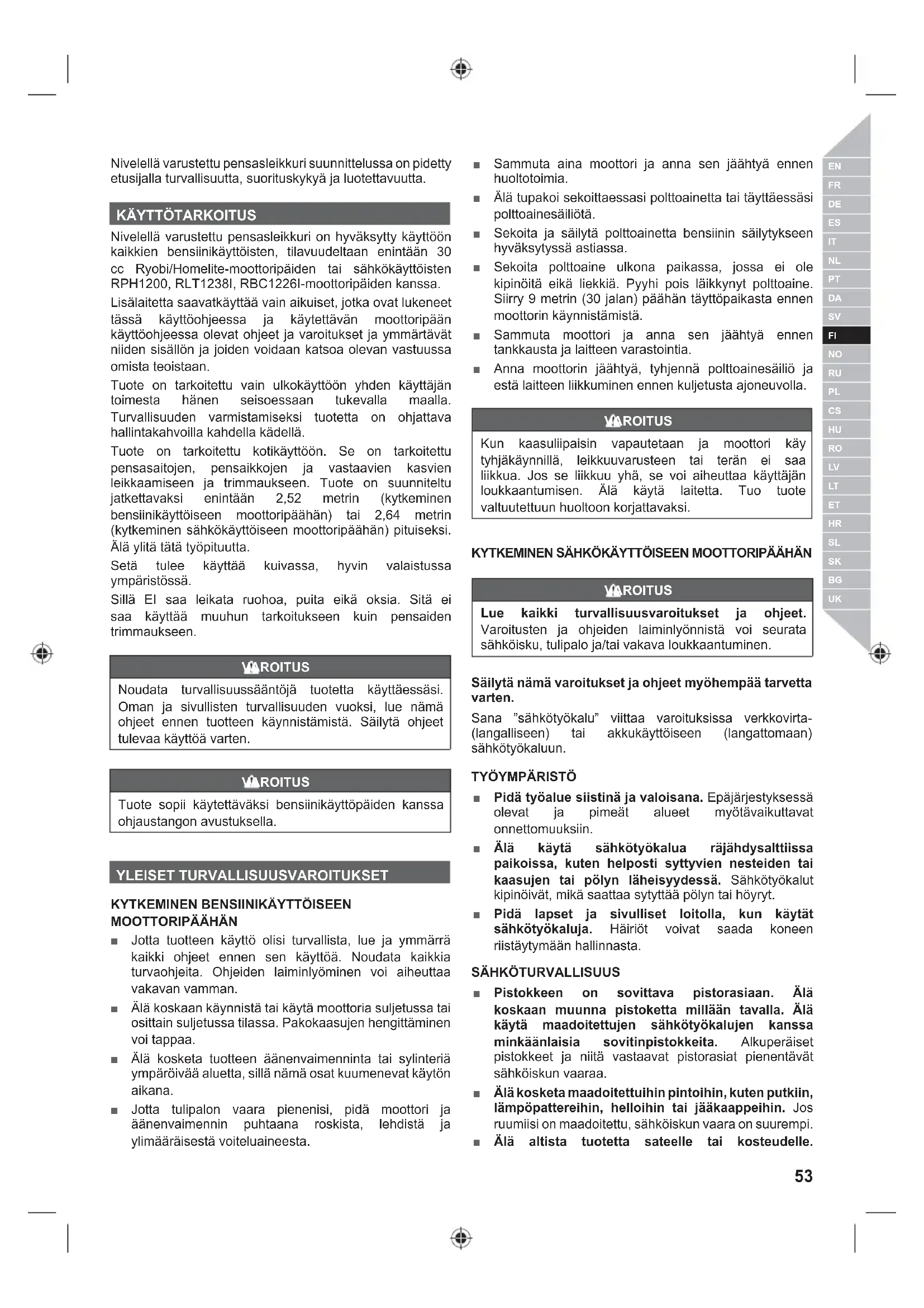 Nivelellä varustettu pensasleikkuri on hyväksytty käyttöön kaikkien bensiinikäyttöisten, tilavuudeltaan enintään 30 cc Ryobi/Homelite-moottoripäiden tai sähkökäyttöisten RPH1200, RLT1238I, RBC1226I-moottoripäiden kanssa. Lisälaitetta saavatkäyttää vain aikuiset, jotka ovat lukeneet tässä käyttöohjeessa ja käytettävän moottoripään käyttöohjeessa olevat ohjeet ja varoitukset ja ymmärtävät niiden sisällön ja joiden voidaan katsoa olevan vastuussa omista teoistaan. Tuote on tarkoitettu vain ulkokäyttöön yhden käyttäjän toimesta hänen seisoessaan tukevalla maalla. Turvallisuuden varmistamiseksi tuotetta on ohjattava hallintakahvoilla kahdella kädellä. Tuote on tarkoitettu kotikäyttöön. Se on tarkoitettu pensasaitojen, pensaikkojen ja vastaavien kasvien leikkaamiseen ja trimmaukseen. Tuote on suunniteltu jatkettavaksi enintään 2,52 metrin (kytkeminen bensiinikäyttöiseen moottoripäähän) tai 2,64 metrin (kytkeminen sähkökäyttöiseen moottoripäähän) pituiseksi. Älä ylitä tätä työpituutta. Setä tulee käyttää kuivassa, hyvin valaistussa ympäristössä. Sillä EI saa leikata ruohoa, puita eikä oksia. Sitä ei saa käyttää muuhun tarkoitukseen kuin pensaiden trimmaukseen. VAROITUS Noudata turvallisuussääntöjä tuotetta käyttäessäsi. Oman ja sivullisten turvallisuuden vuoksi, lue nämä ohjeet ennen tuotteen käynnistämistä. Säilytä ohjeet tulevaa käyttöä varten. VAROITUS Tuote sopii käytettäväksi bensiinikäyttöpäiden kanssa ohjaustangon avustuksella. YLEISET TURVALLISUUSVAROITUKSET
